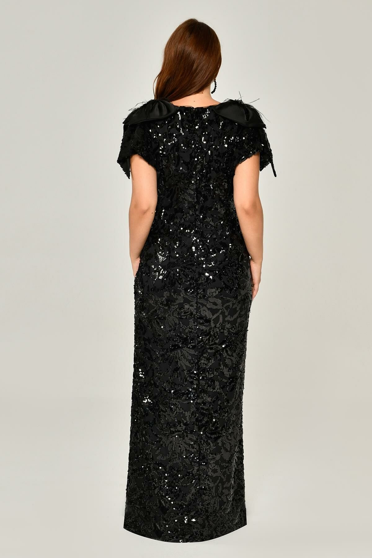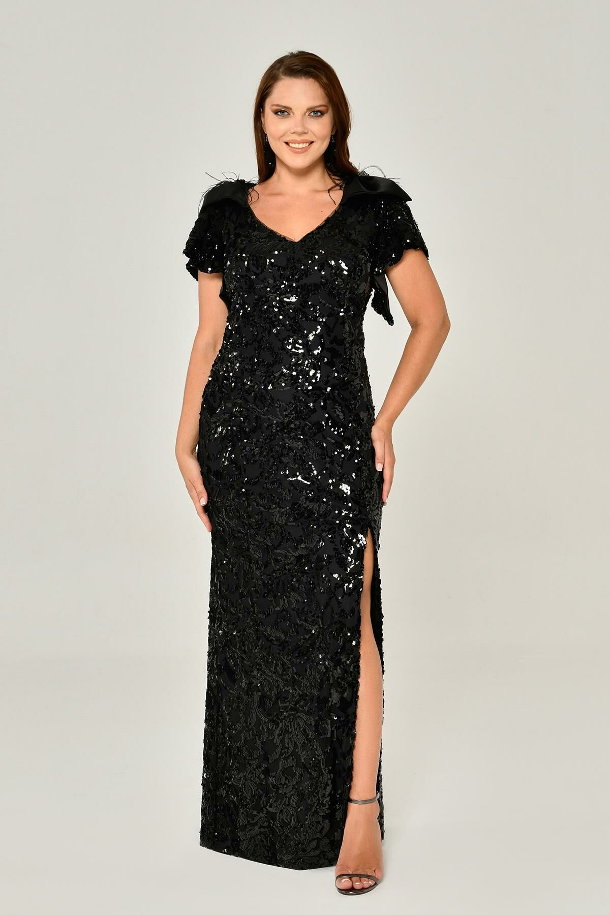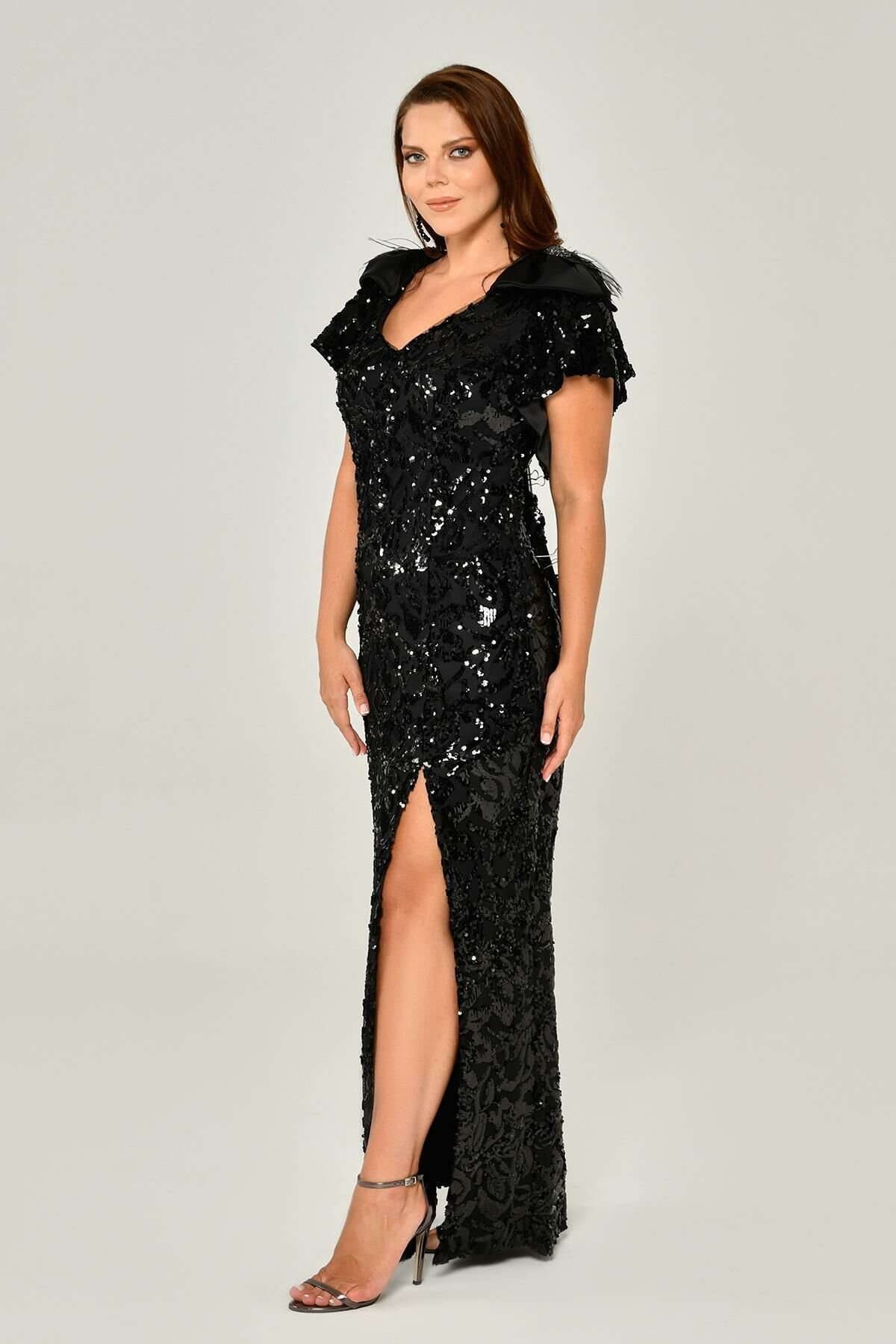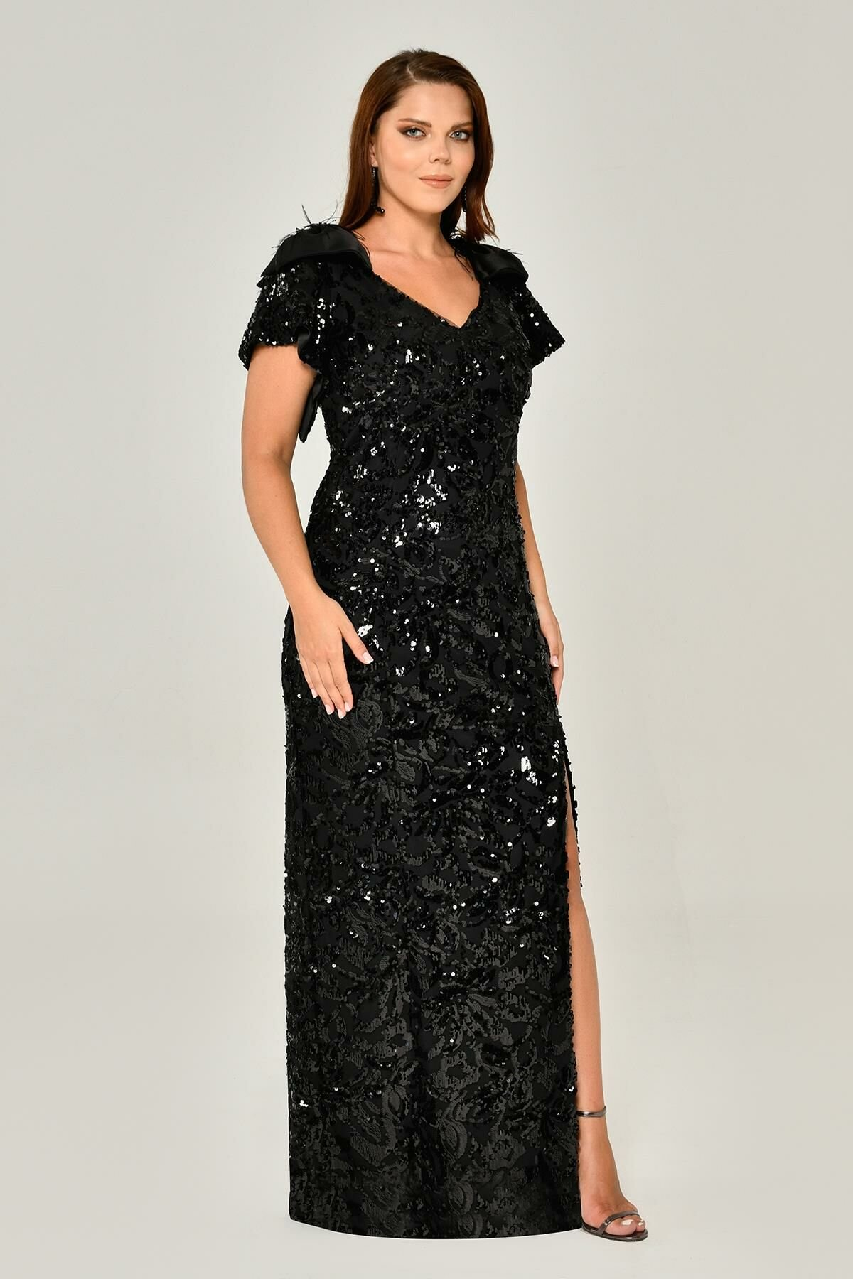 Kısa Kol V Yaka Payetli Yırtmaçlı Uzun Abiye Elbise