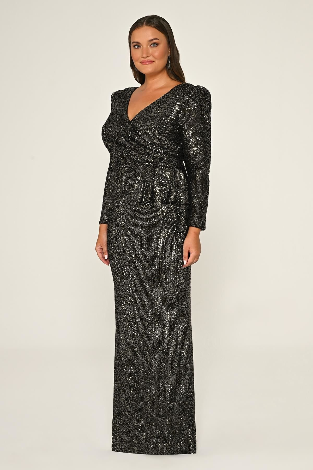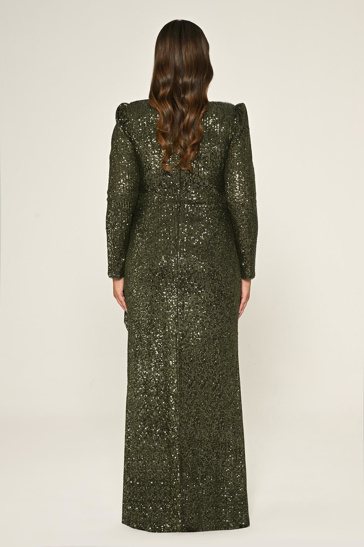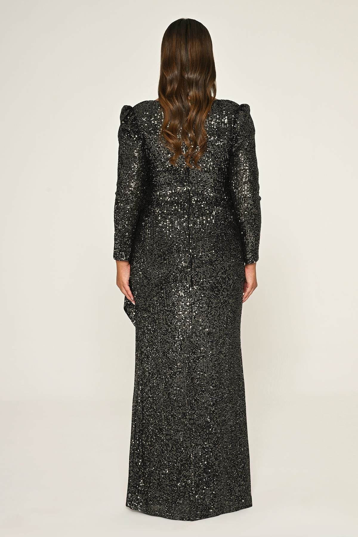 V Yaka Uzun Kollu Payet Uzun Abiye Elbise Alfa Beta