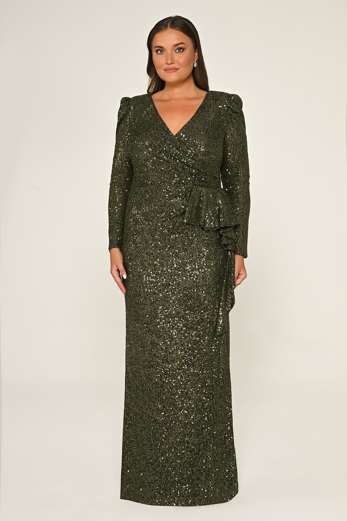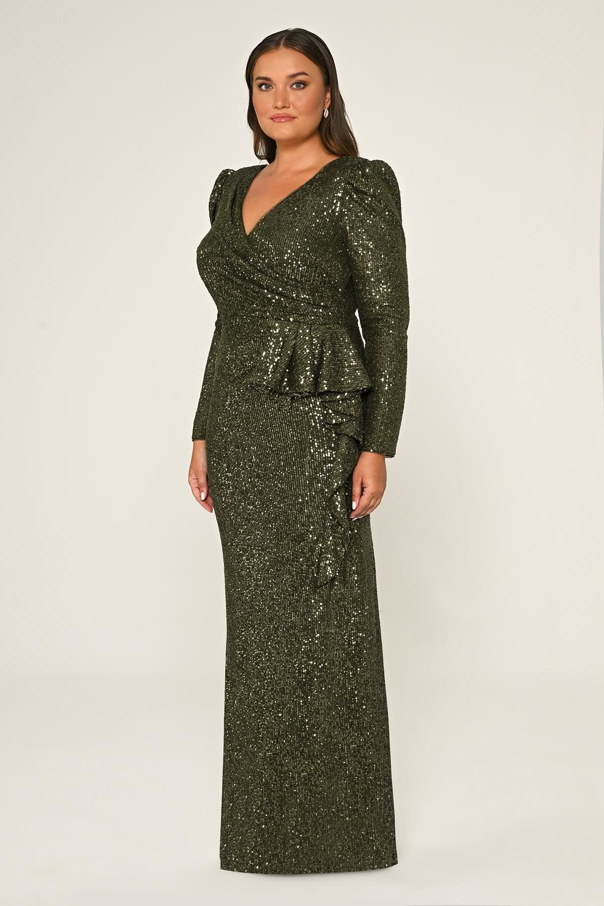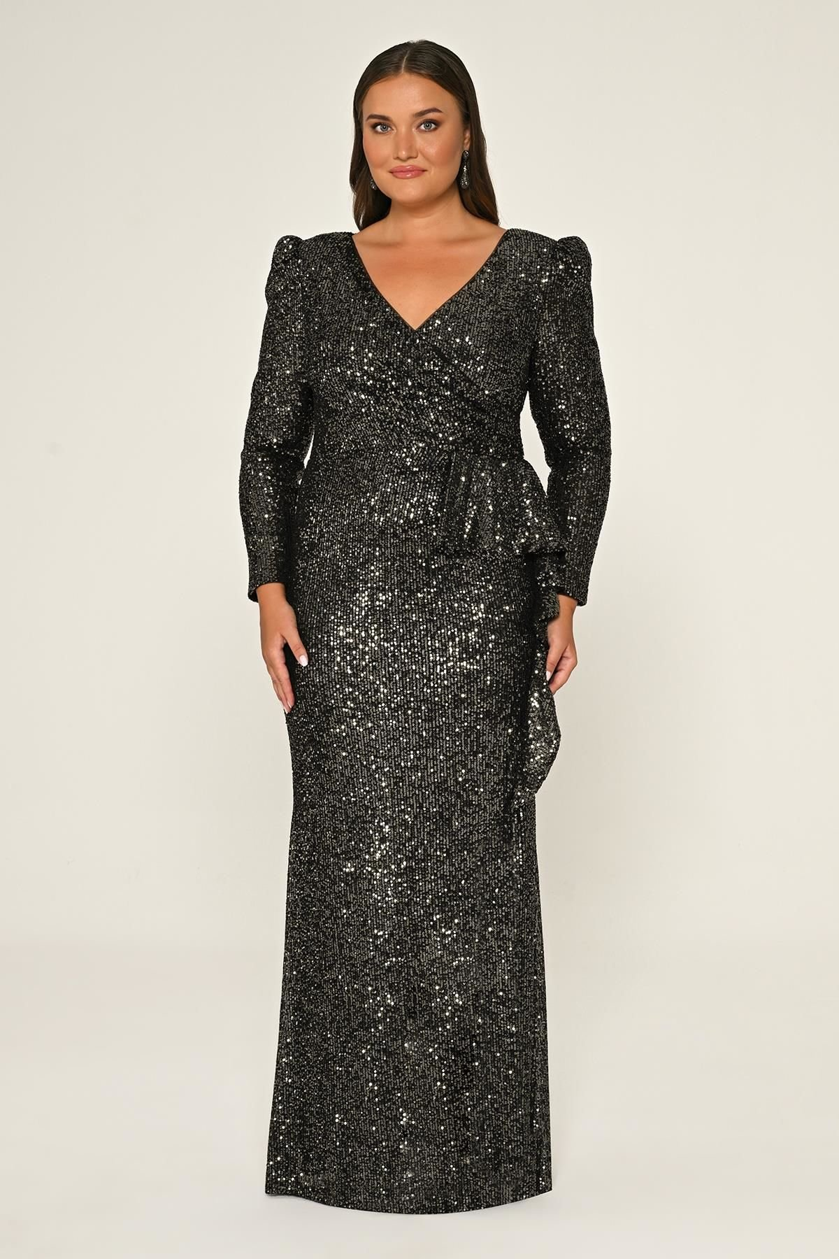 V Yaka Uzun Kollu Payet Uzun Abiye Elbise Alfa Beta