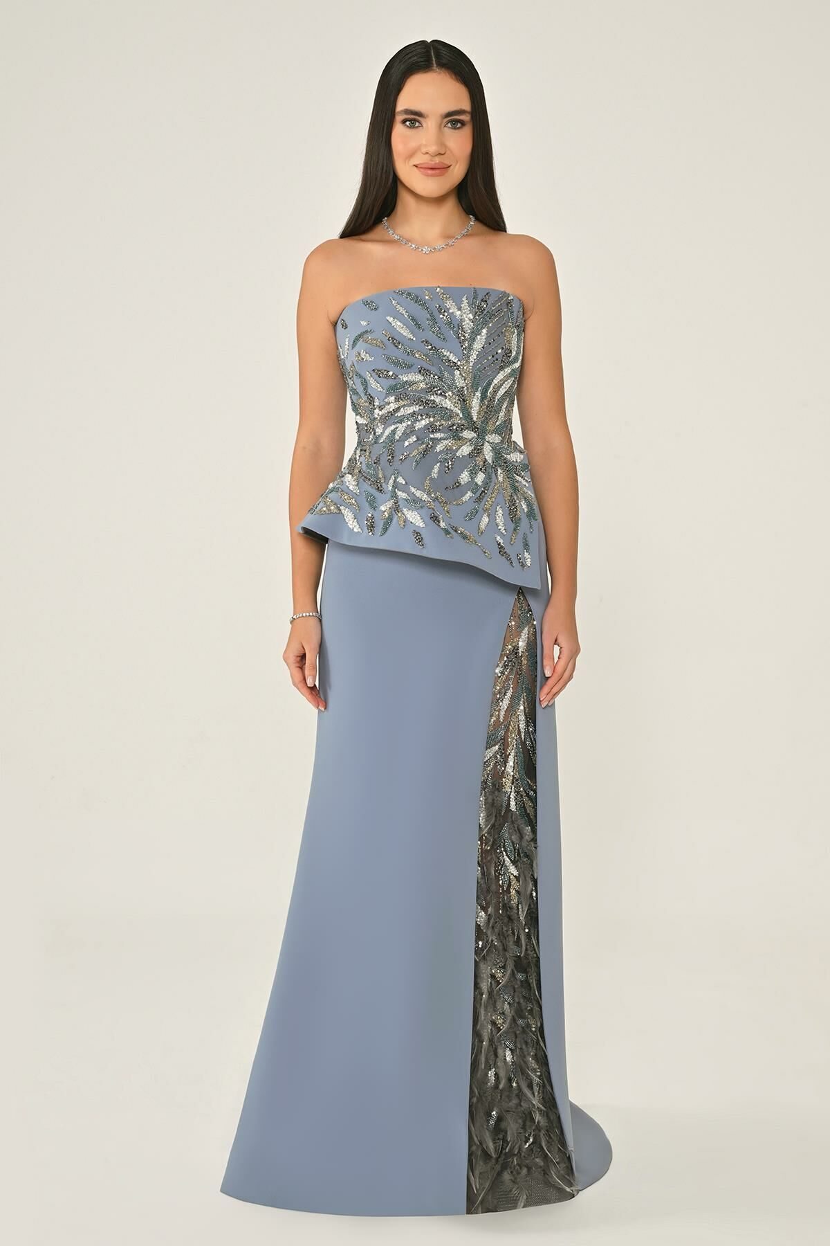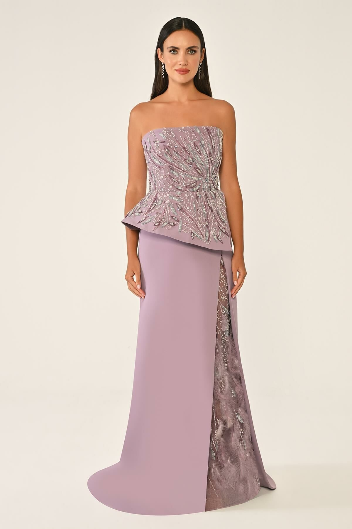 Straplez İşlemeli Yırtmacı Tül Krep Uzun Abiye Elbise Alfa Beta