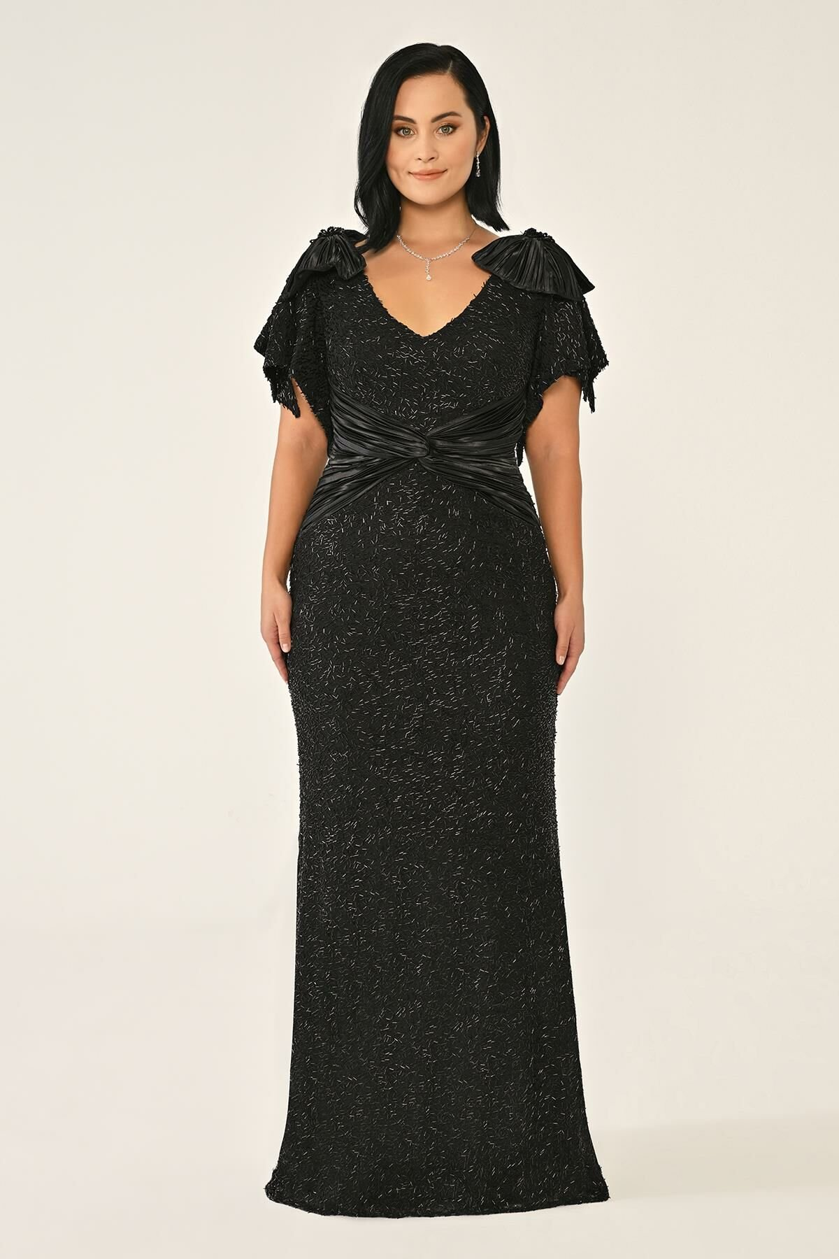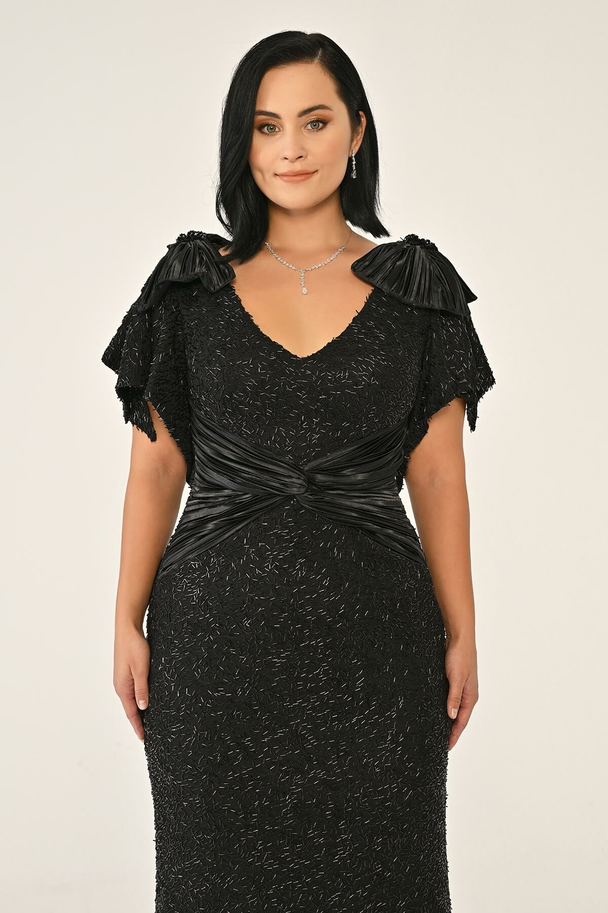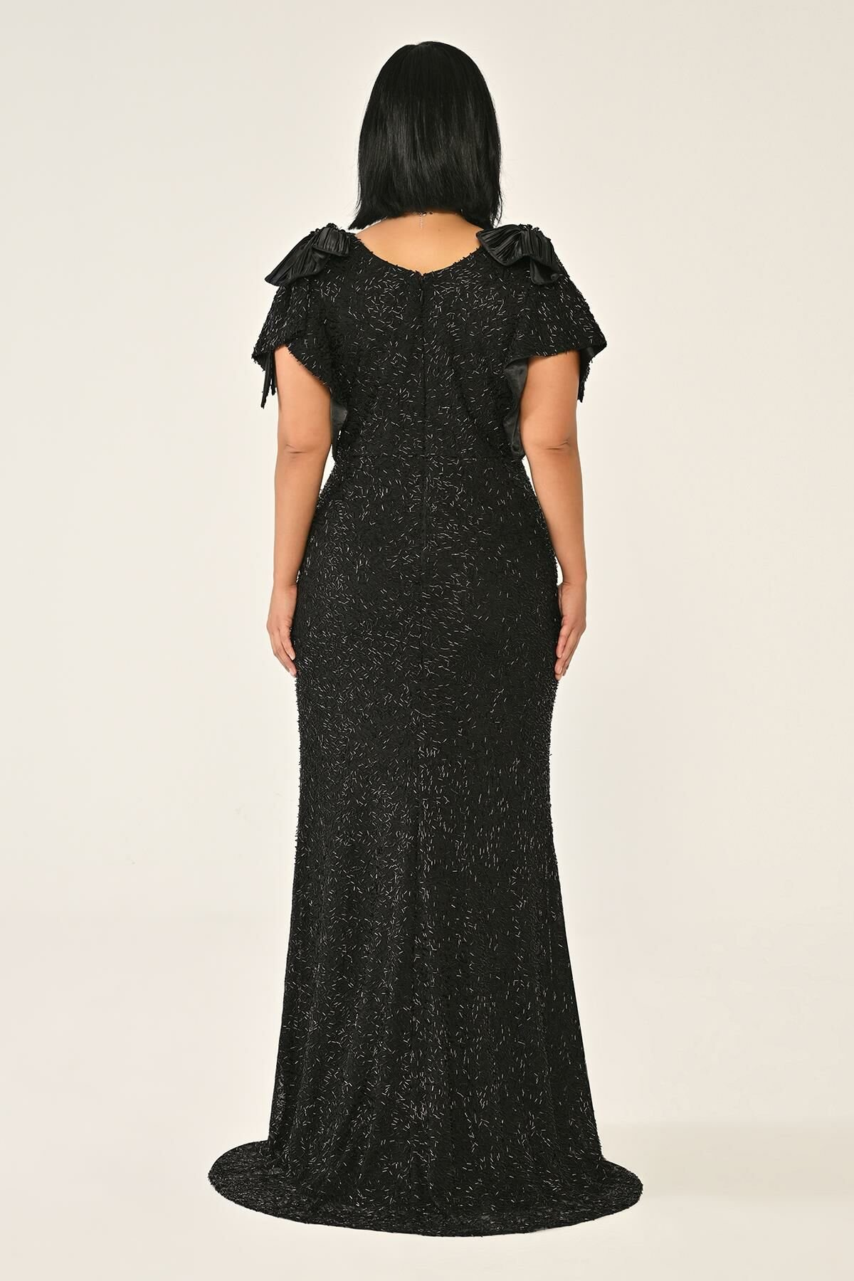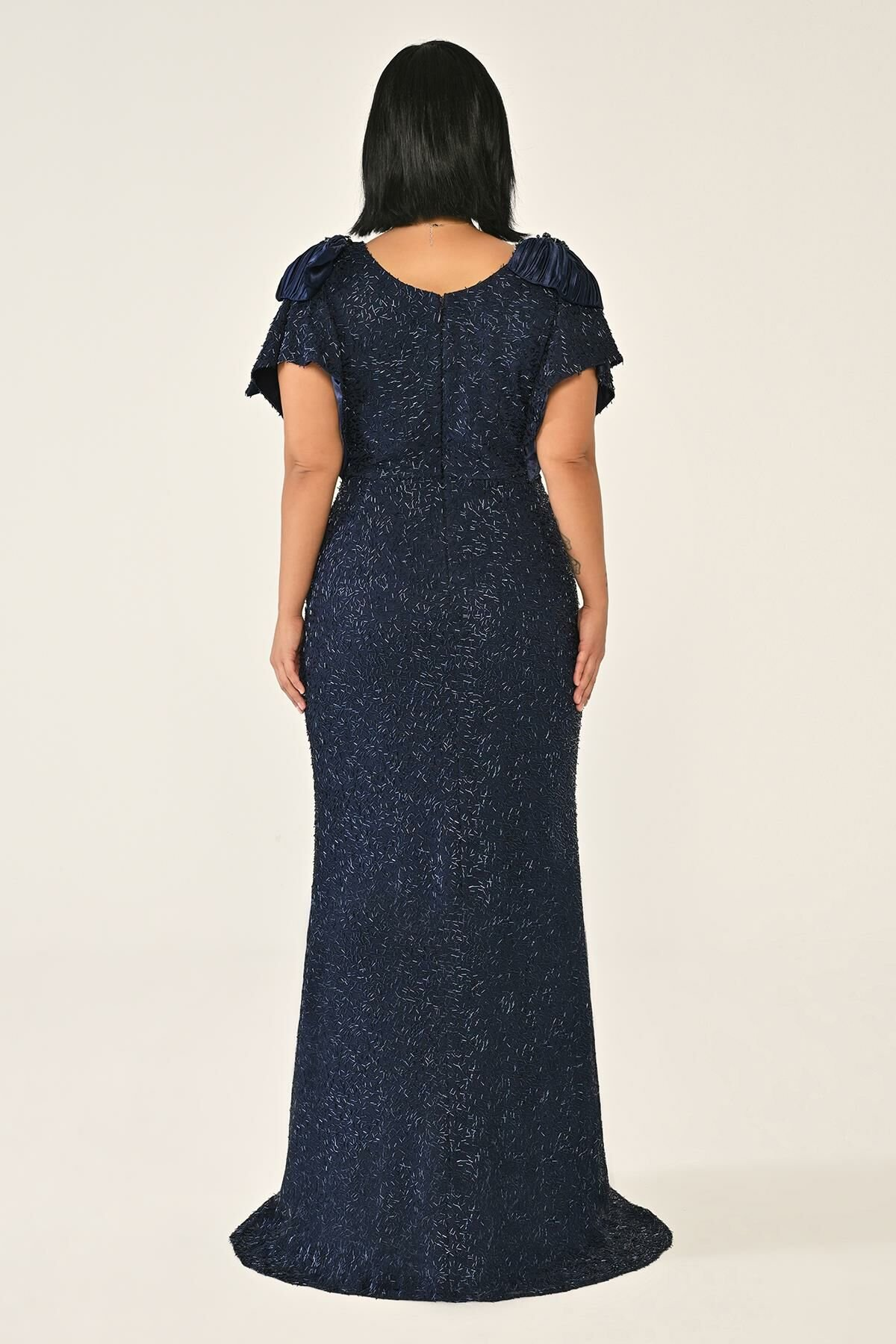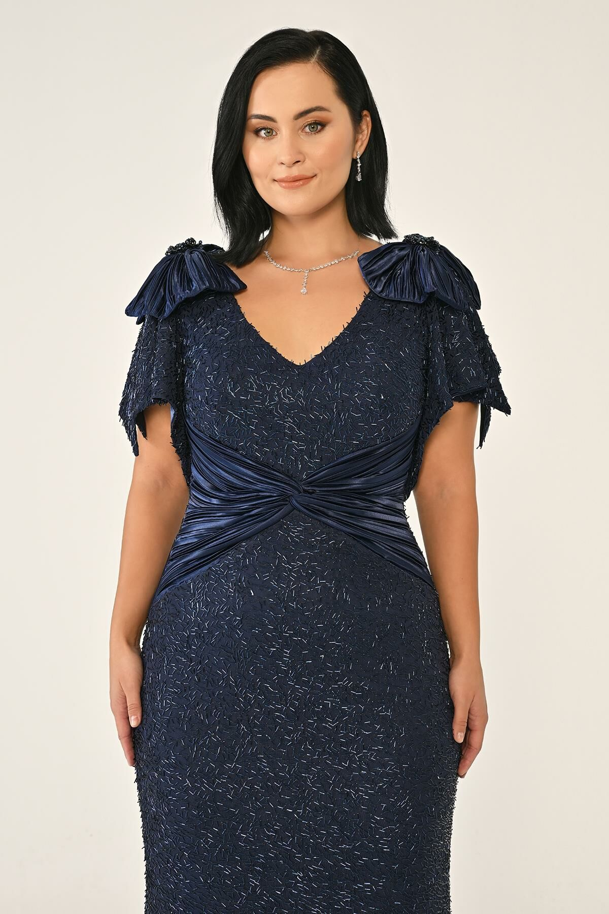 V Yaka Omuz Aksesuarlı Boncuklu Kumaş Uzun Abiye Elbise Alfa Beta