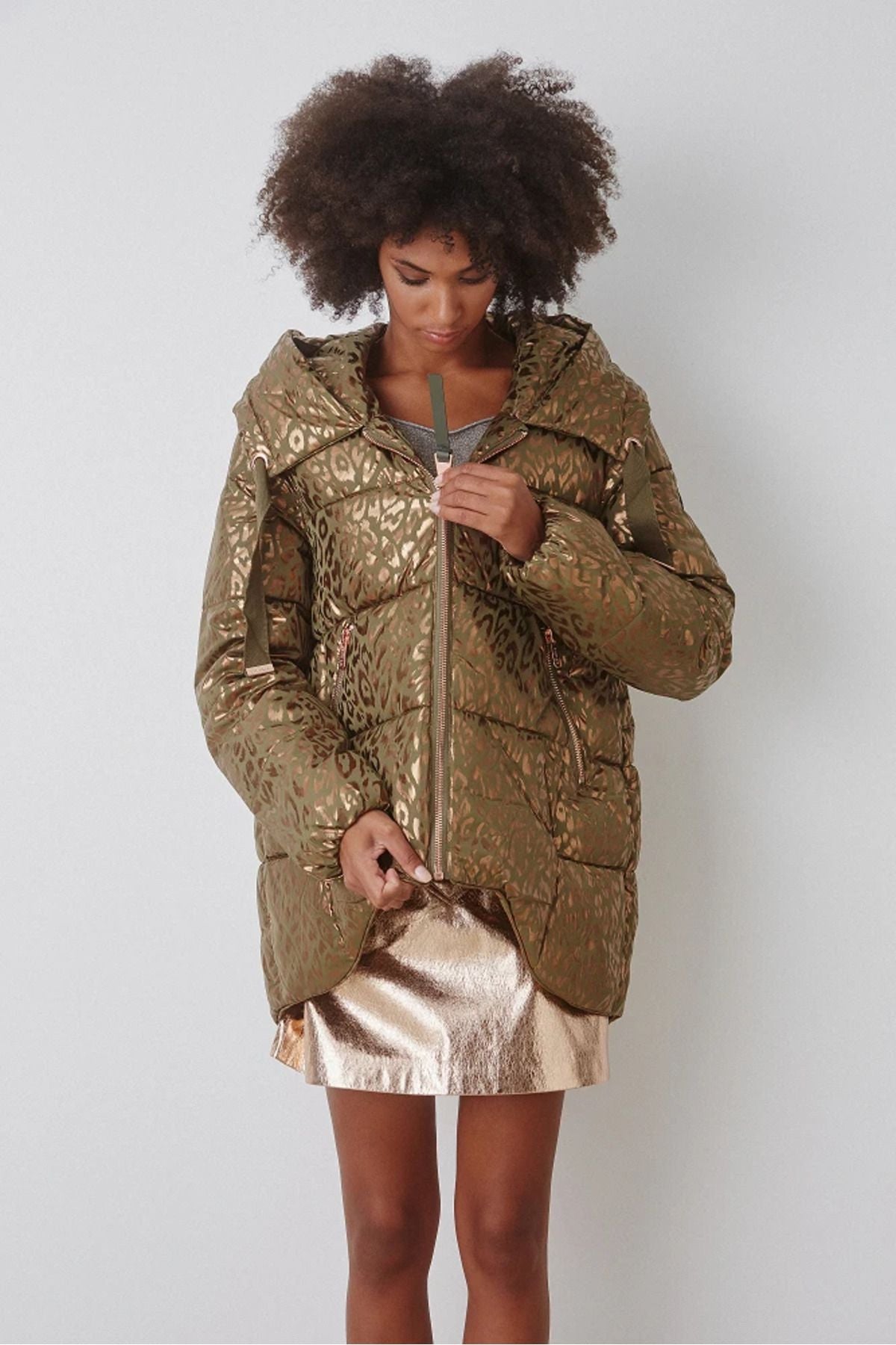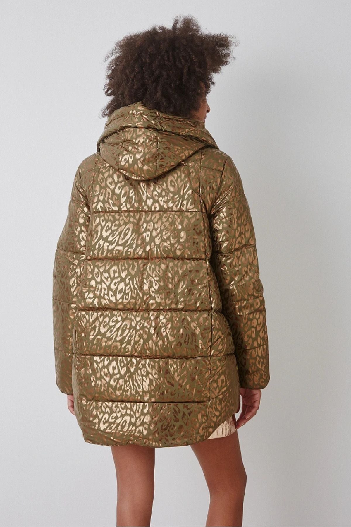 ÜRÜN DETAYLARI:; Metalik leopar şişme ceket, kapüşonlu, yan cepli, önü düğme kapamalı, asimetrik etek boyu, normal kesim;...