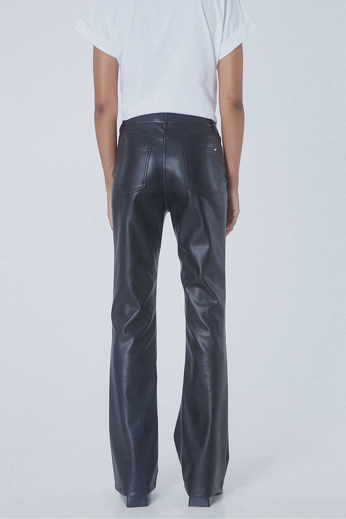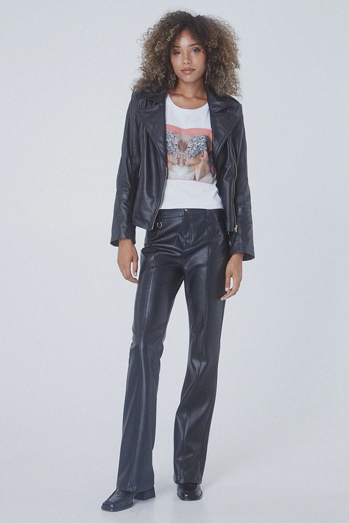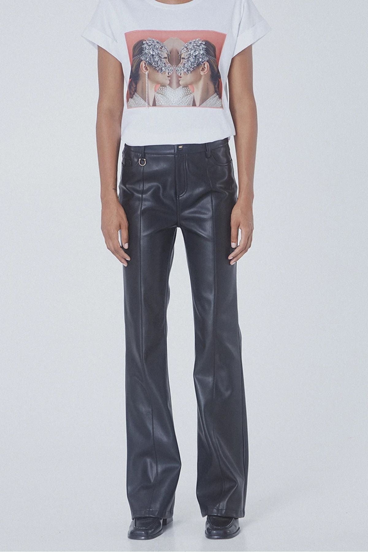 ÜRÜN DETAYLARI:; Deri görünümlü kloş pantolon, beş cepli, önü düğmeli ve fermuar kapamalı, normal kesim; KUMAŞ VE...