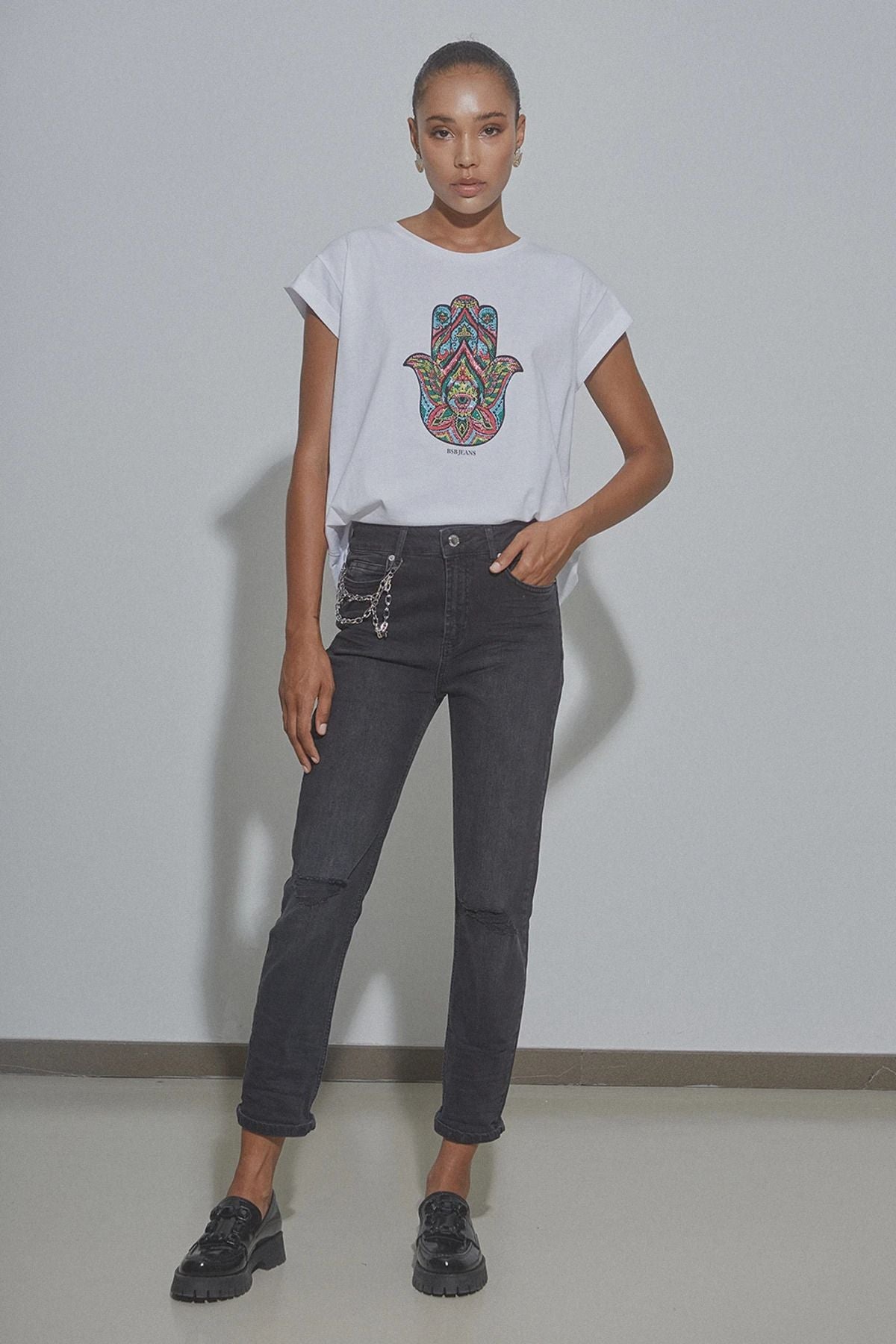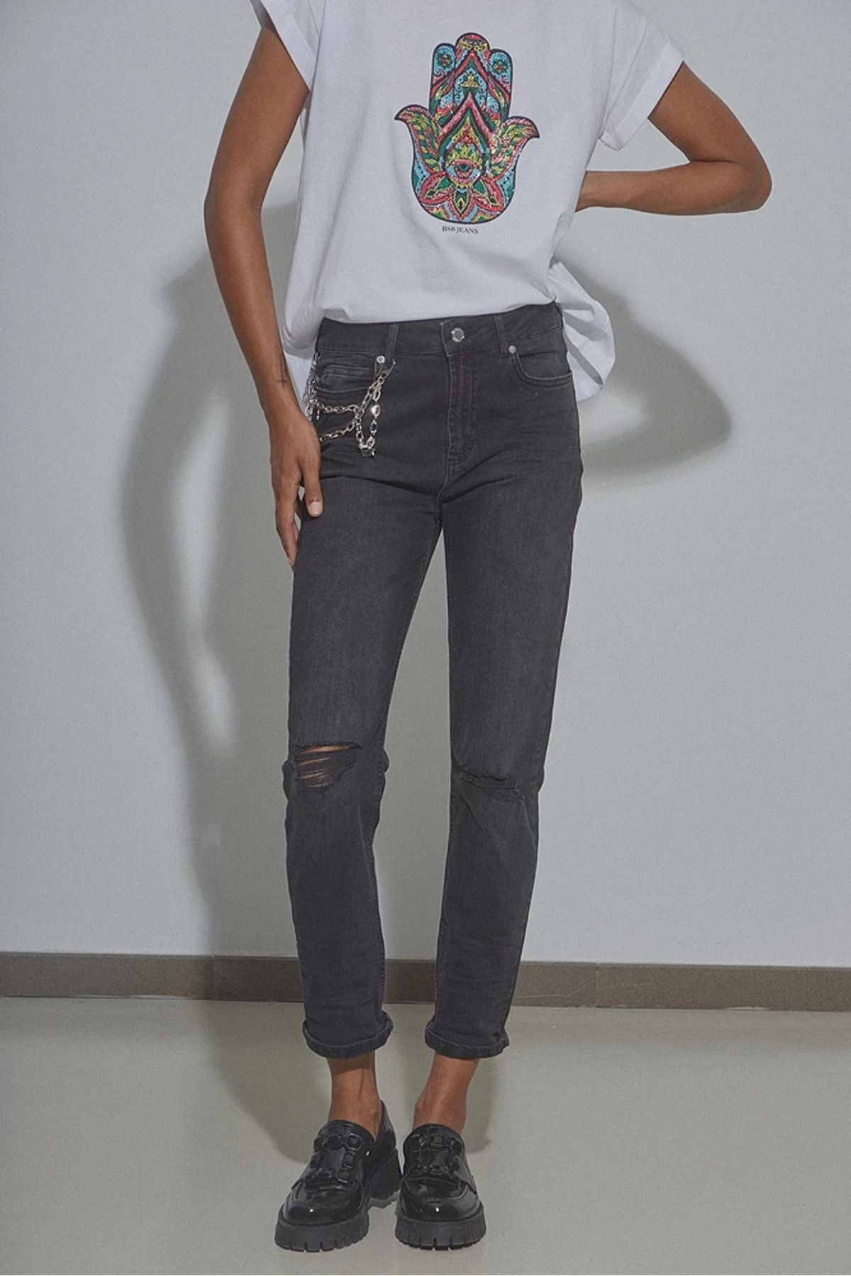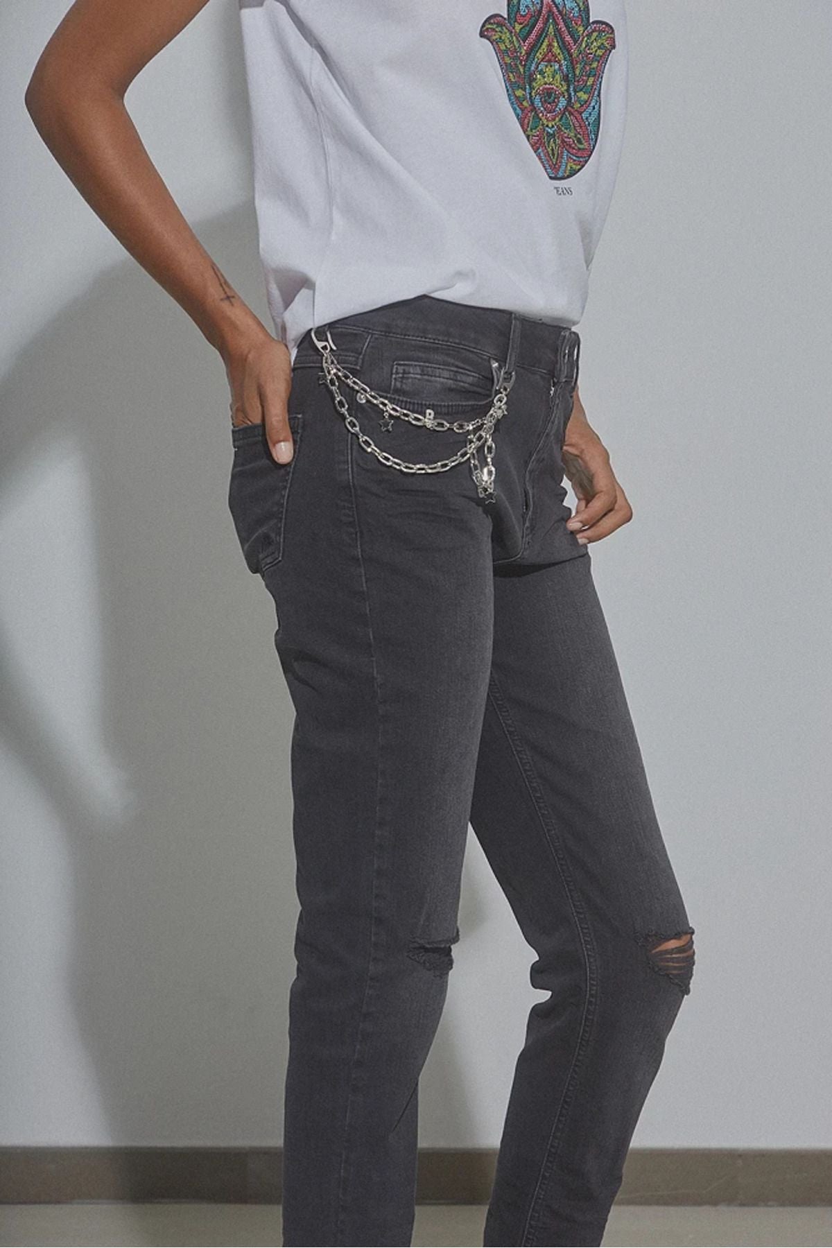 ÜRÜN DETAYLARI; Zencefil düz yüksek bel jean pantolon, beş cepli, yırtmaçlı, streç kumaşlı, çıkarılabilir metalik zincirli, önü...
