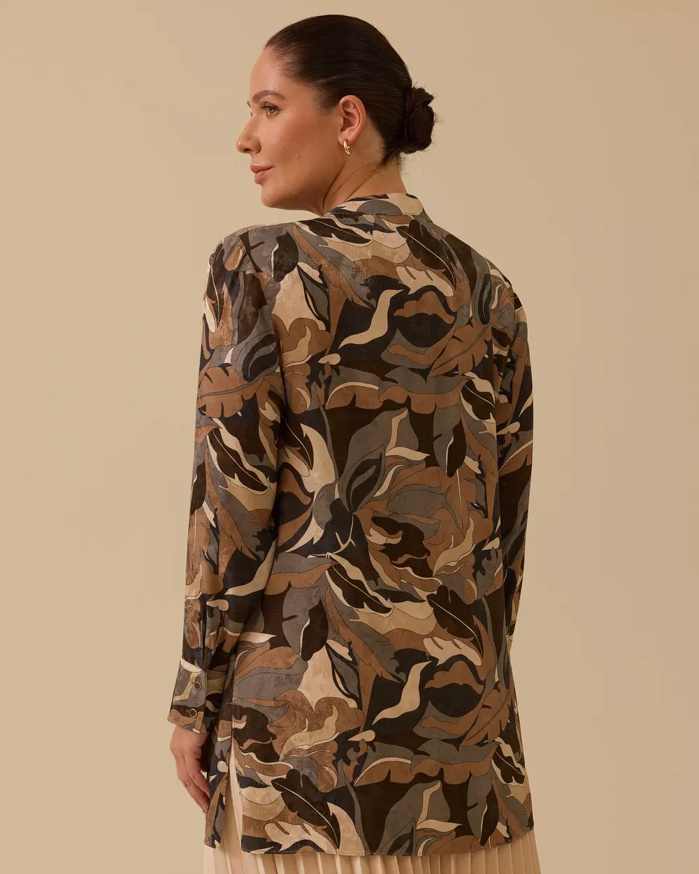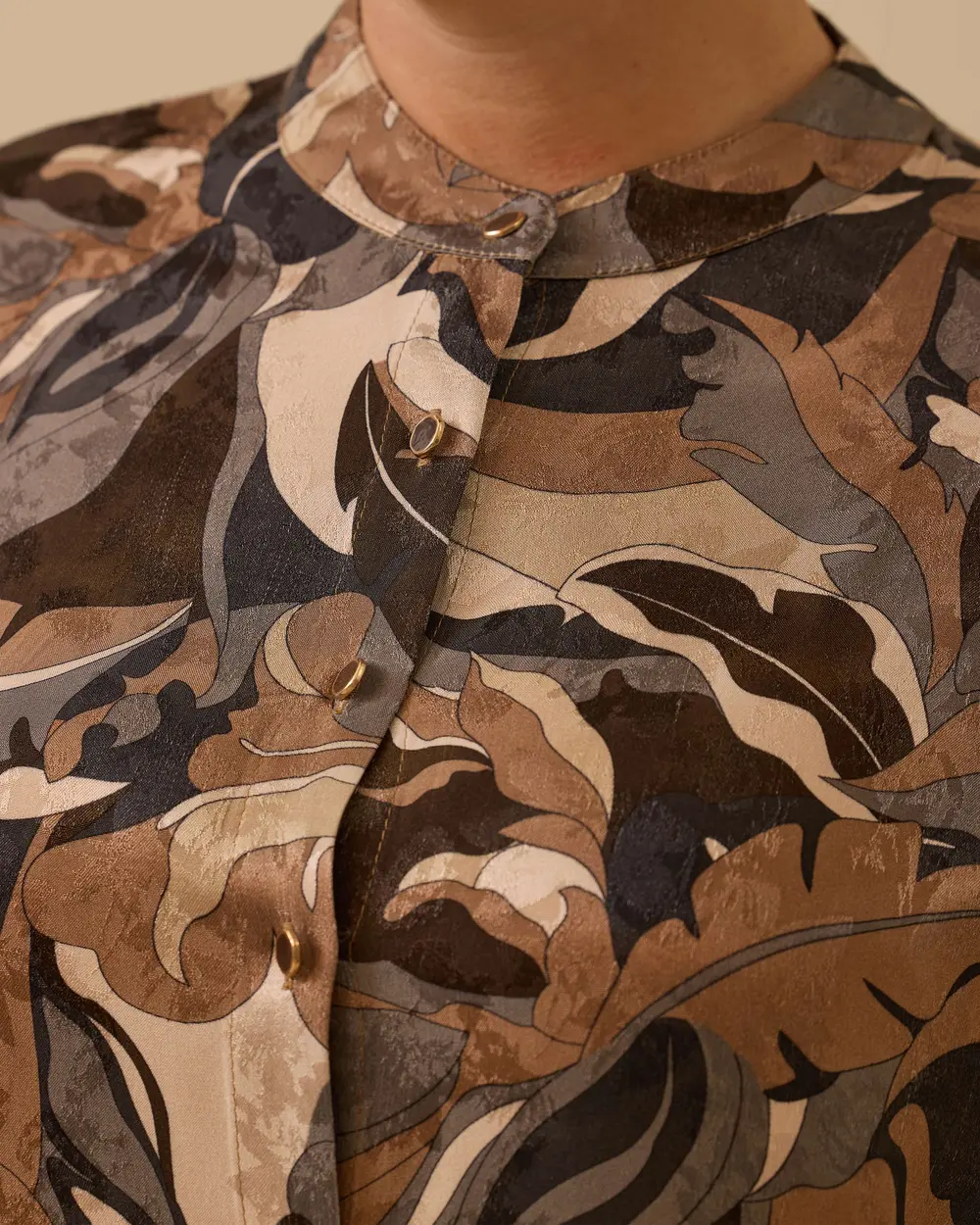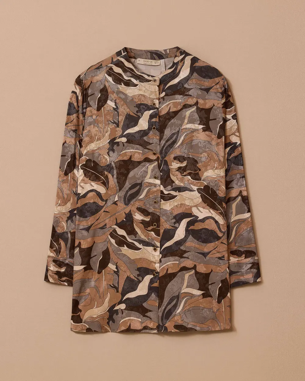 Büyük Beden Desenli Hakim Yaka Jakar Gömlek, modern yaka detayı ve dokusuyla şıklık sunar.