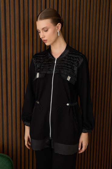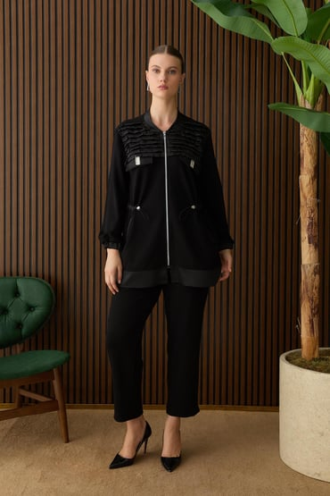 Milena Takım Kesim: Tam Kalıp Tarz: Şık Boy: Üst: 80 Cm Alt 97 Cm Robası Pile Saten Garnili Süs Kapaklı Yapıştırma Taş Aksesuarlı Beli Tünel Detaylı Fleto Cepli, Ön Bedeni Fermuar Kapamalı Beli Lastikli Pantolonlu Takım