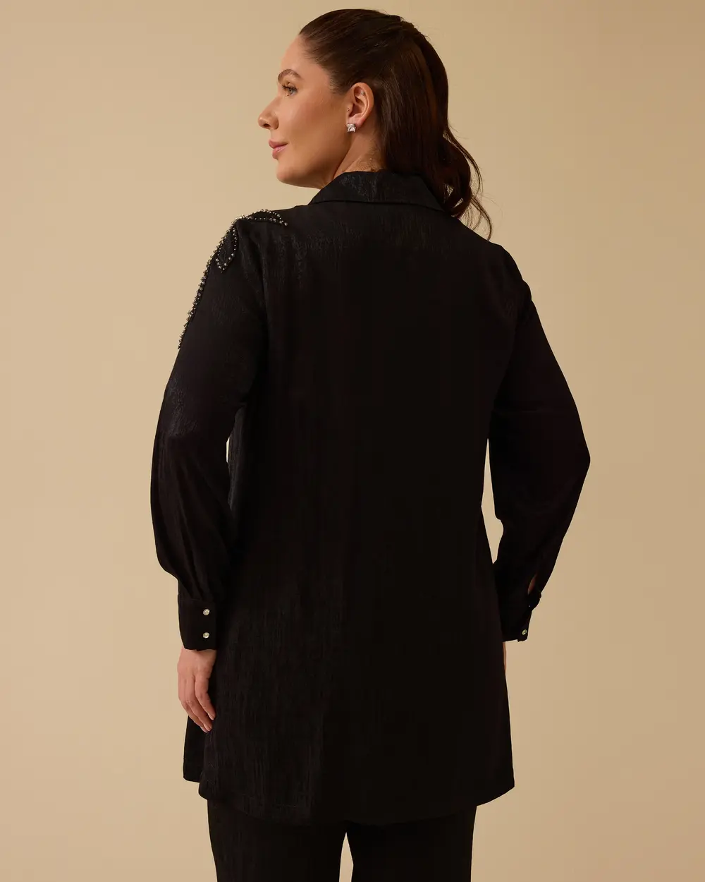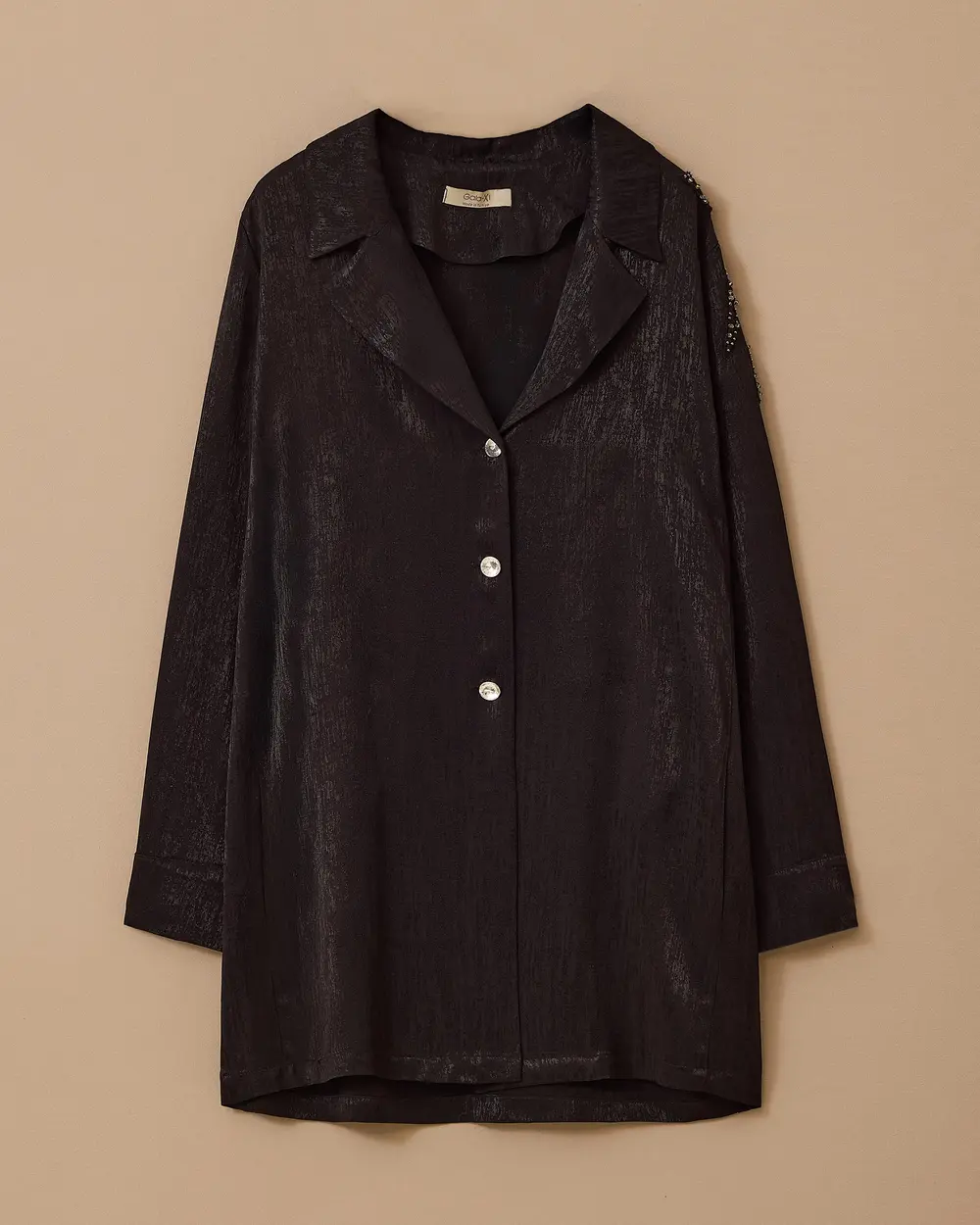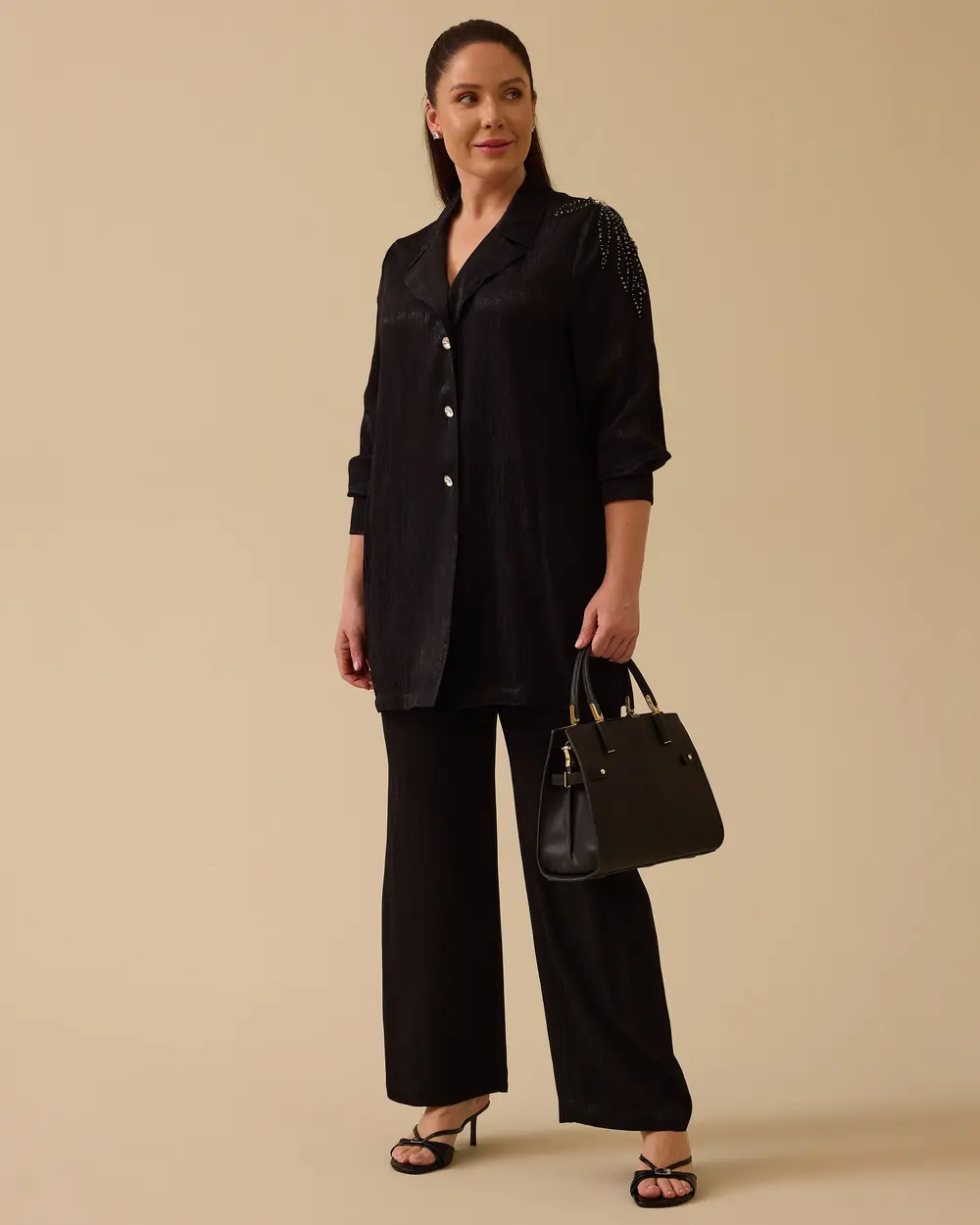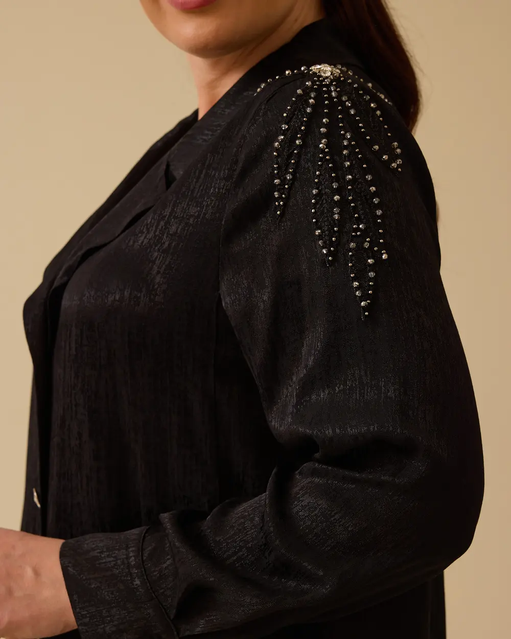 Büyük Beden Taş Detaylı Parlak Dokulu Ceket, şık taş detayları ve parlak dokusuyla zarif bir görünüm sunar. Rahat kesimiyle günlük veya özel günlerde rahatça kullanılabilir.