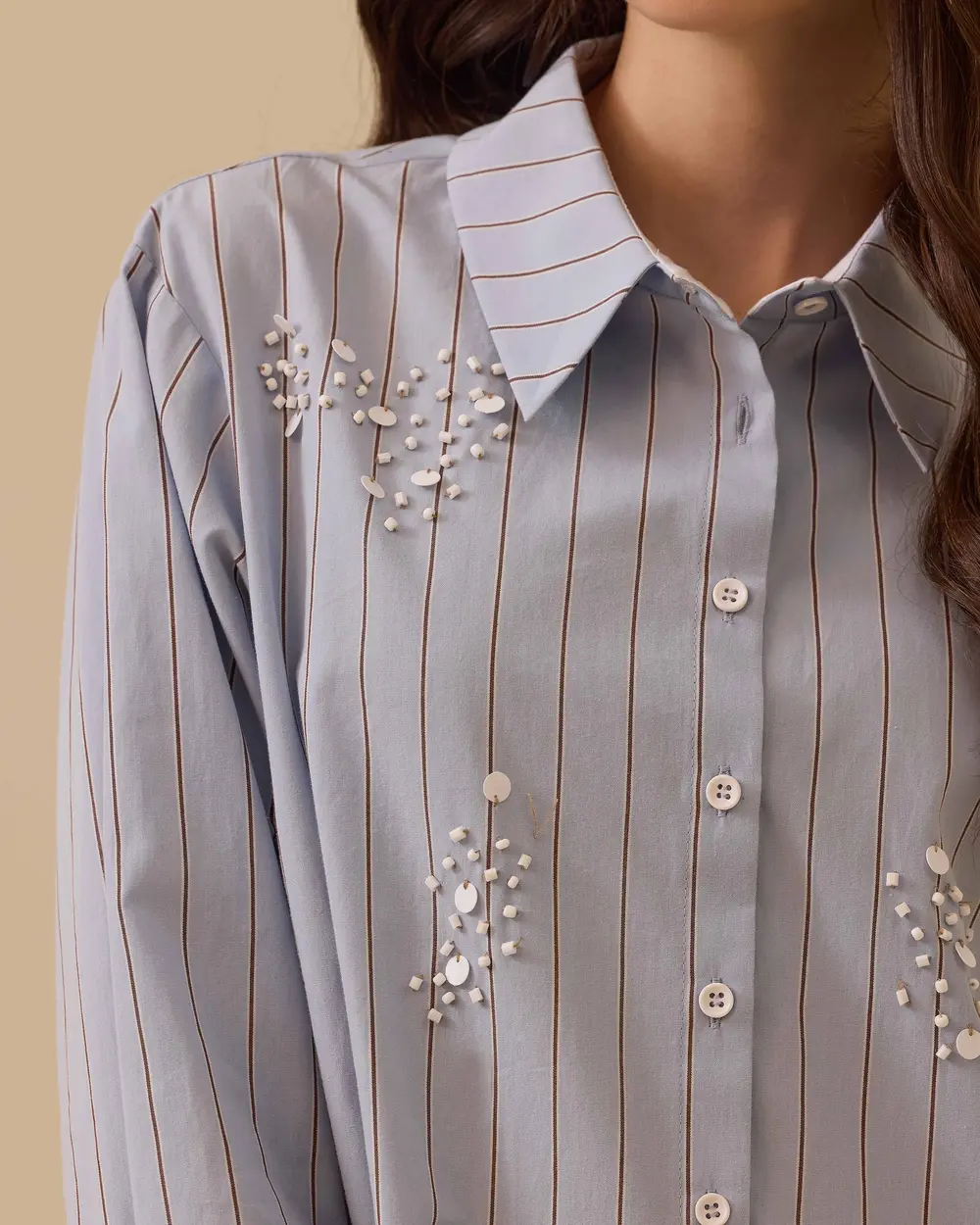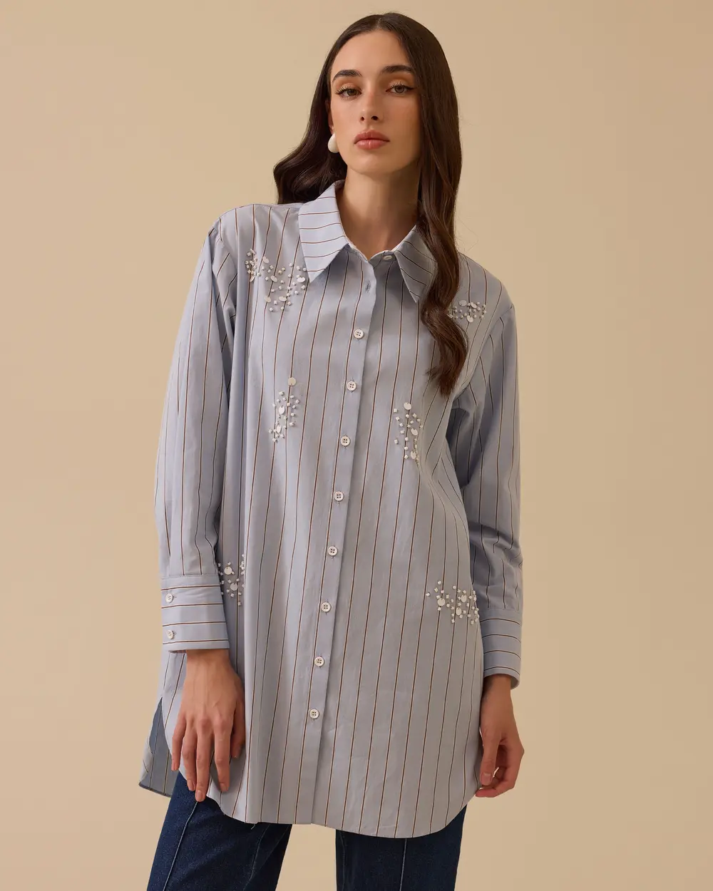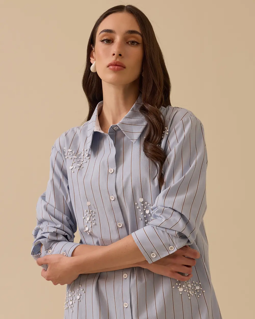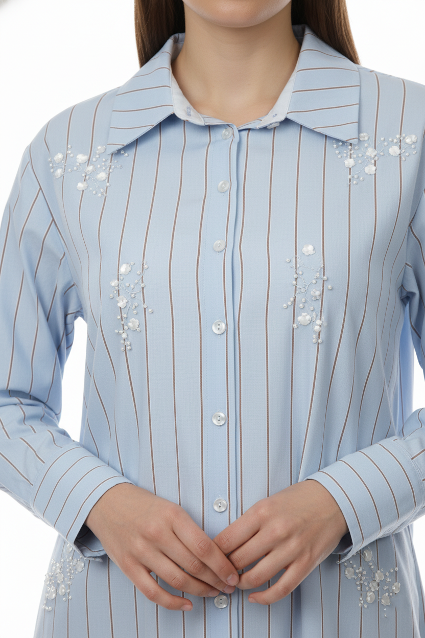 Çizgili Boncuk Detaylı Gömlek, zarif işlemeleri ve modern tasarımıyla şıklığa elegan bir dokunuş katar.