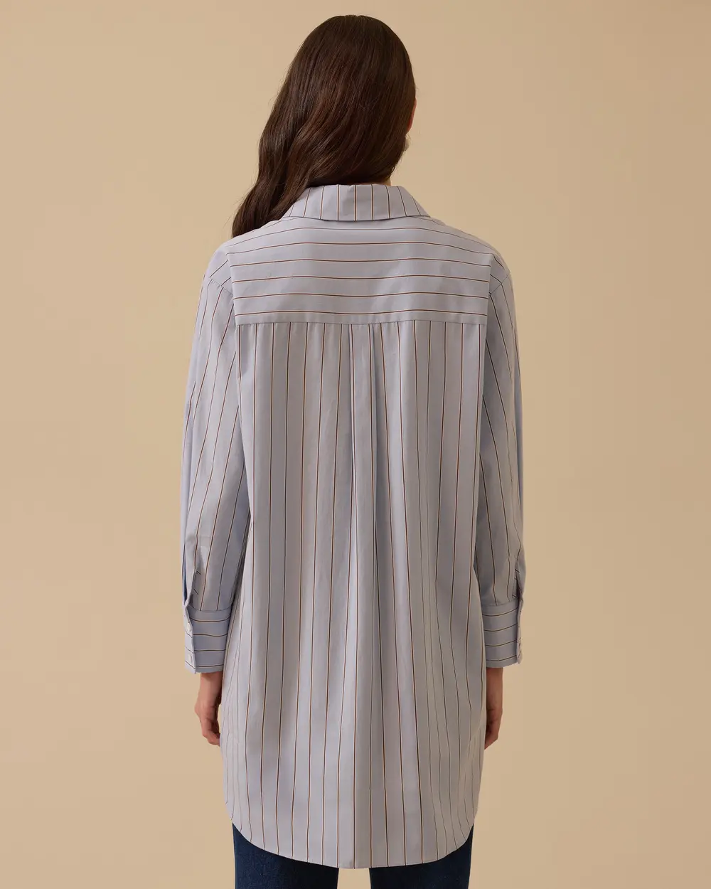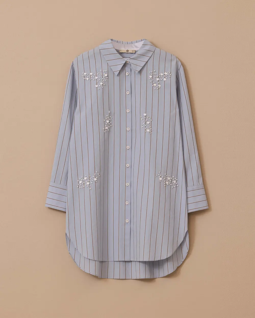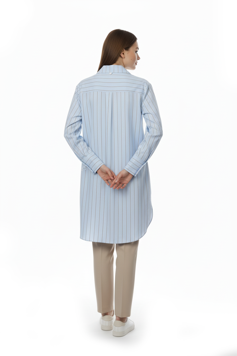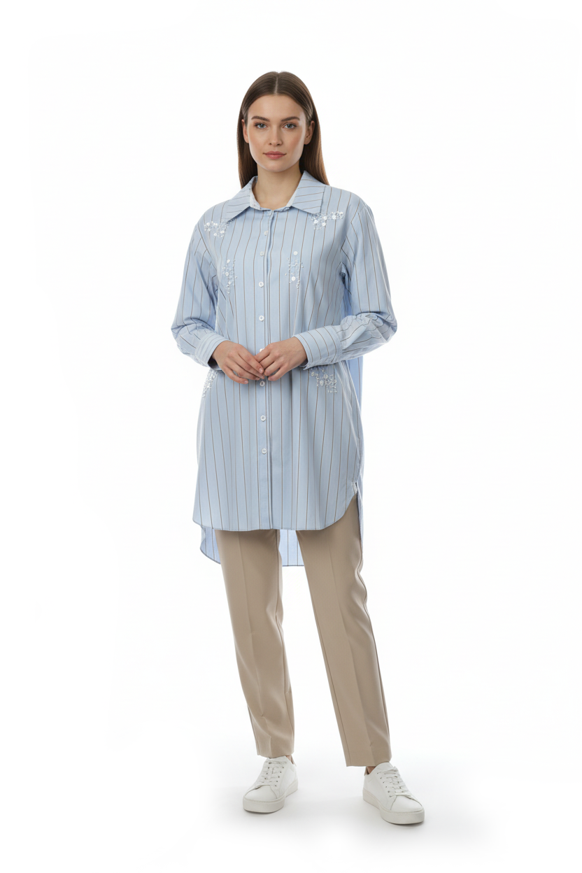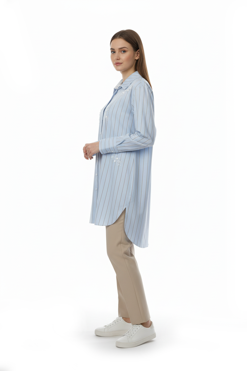 Çizgili Boncuk Detaylı Gömlek, zarif işlemeleri ve modern tasarımıyla şıklığa elegan bir dokunuş katar.