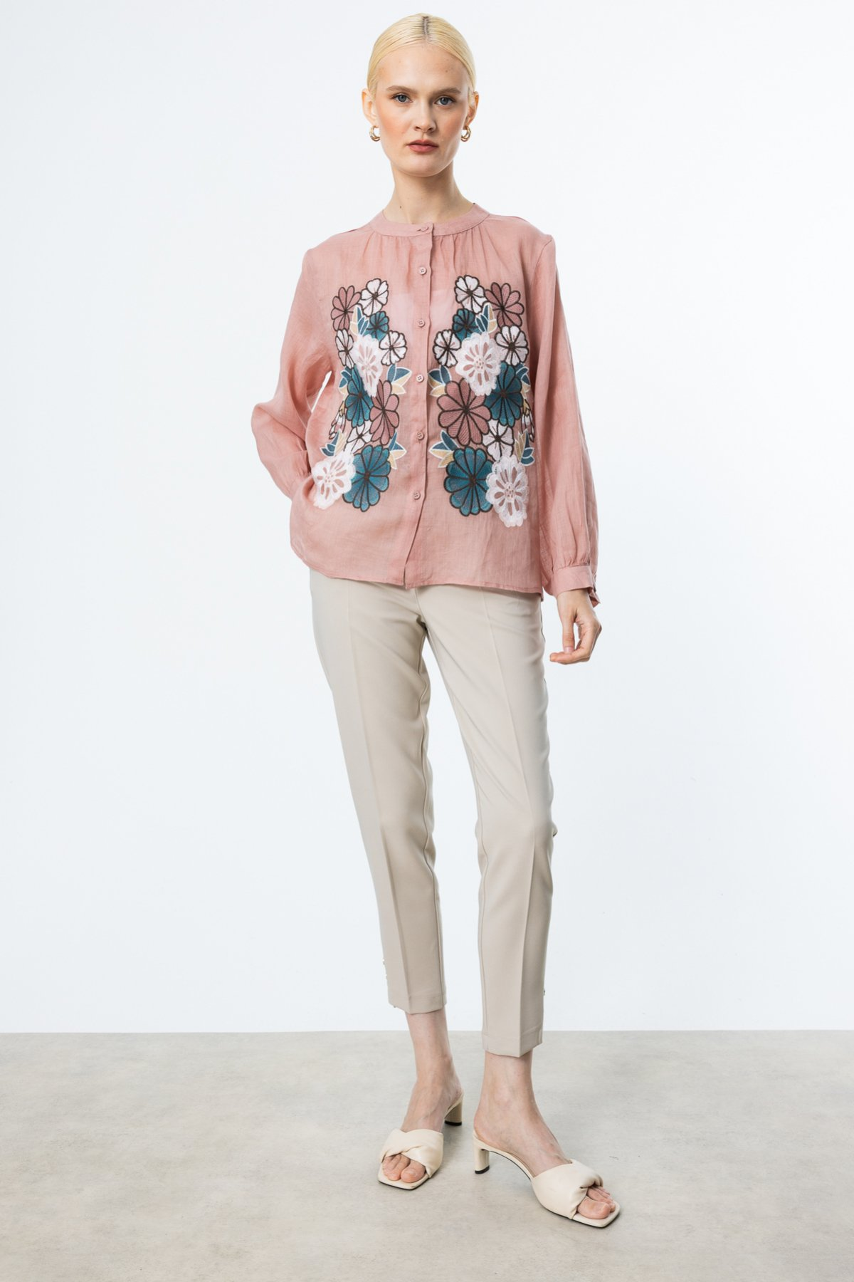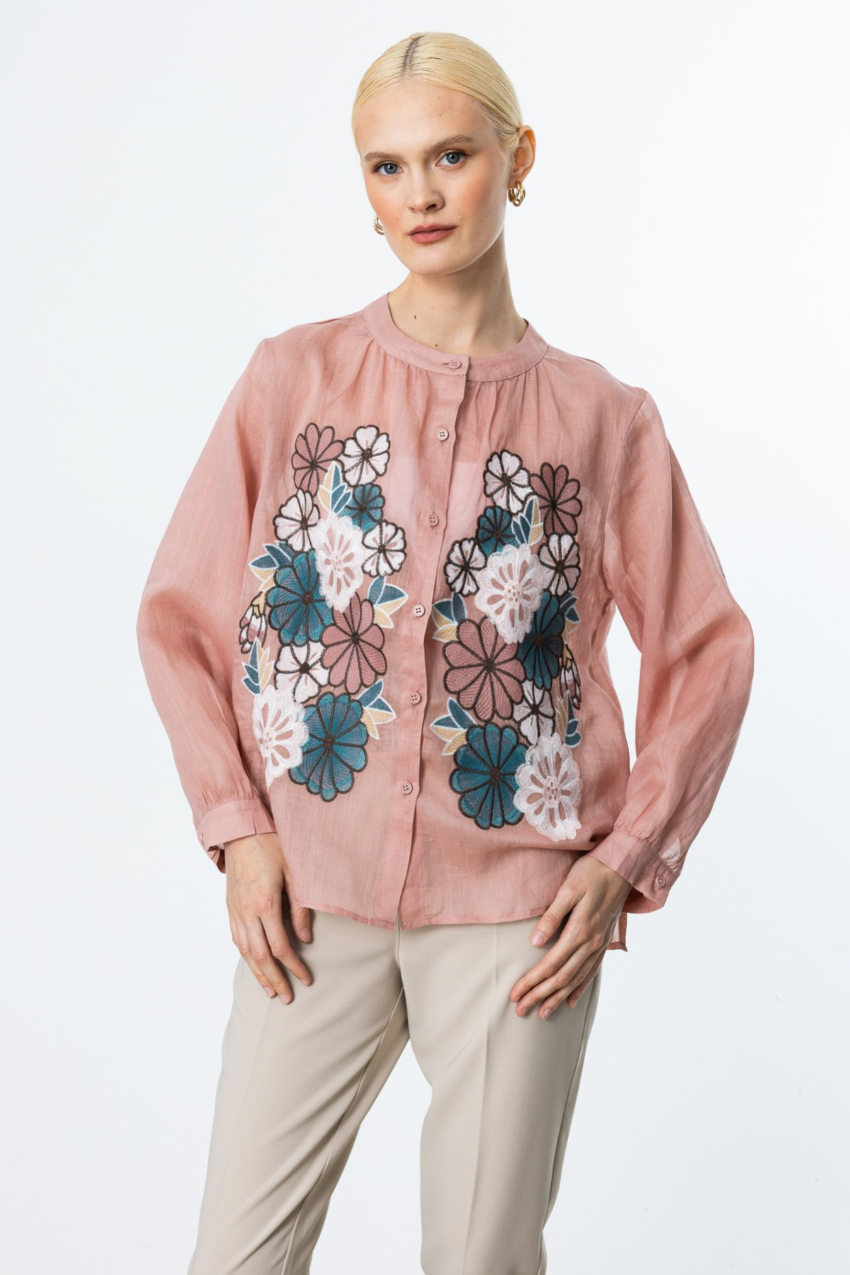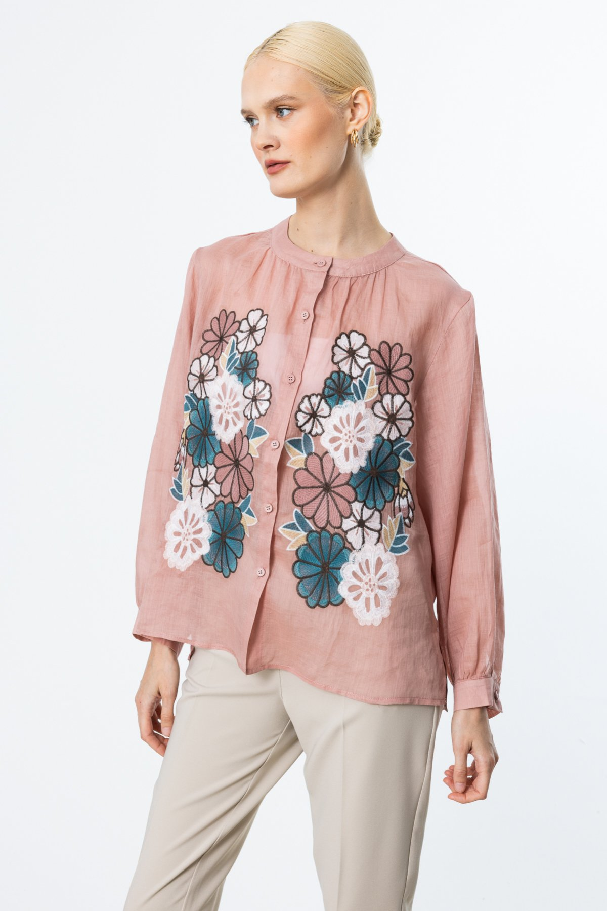 Numune Beden: Ürünün en küçük bedenidirÜrün Özellikleri: Sıfır yaka, uzun kollu, düğme kapamalı, keten kumaş, önü çiçek işlemeli