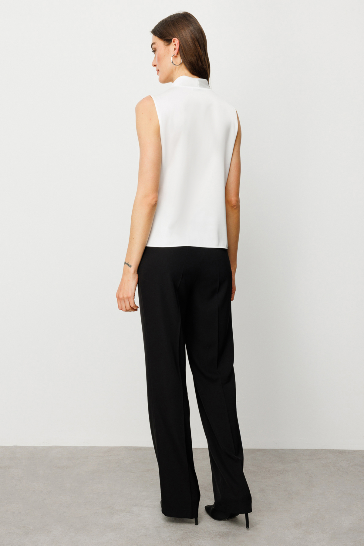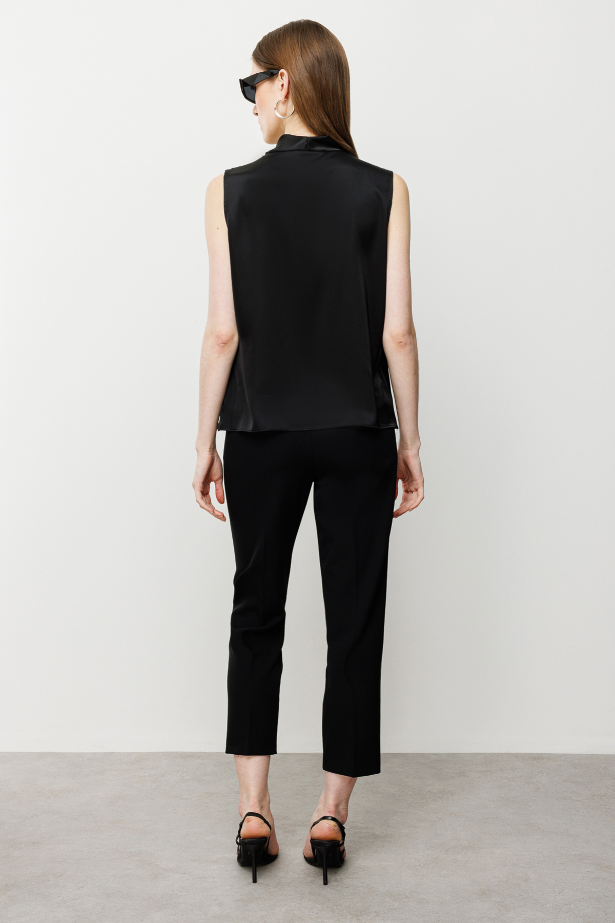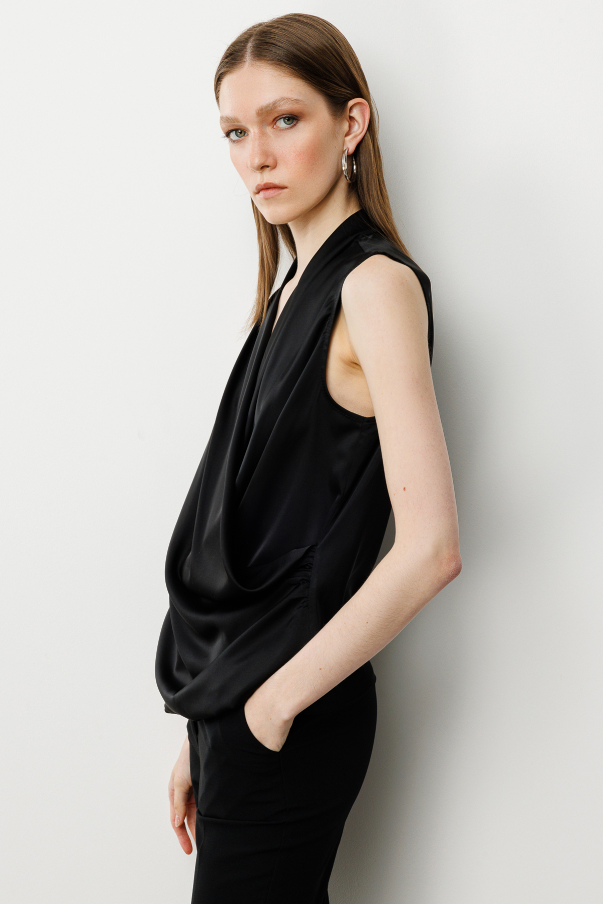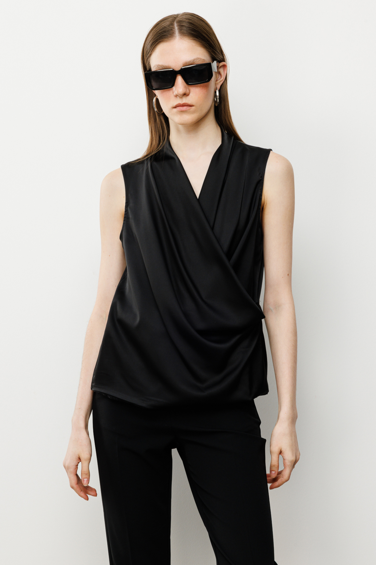 Ürün Özellikleri:Kruvaze yaka, saten, kolsuz, drapeli, astarsız