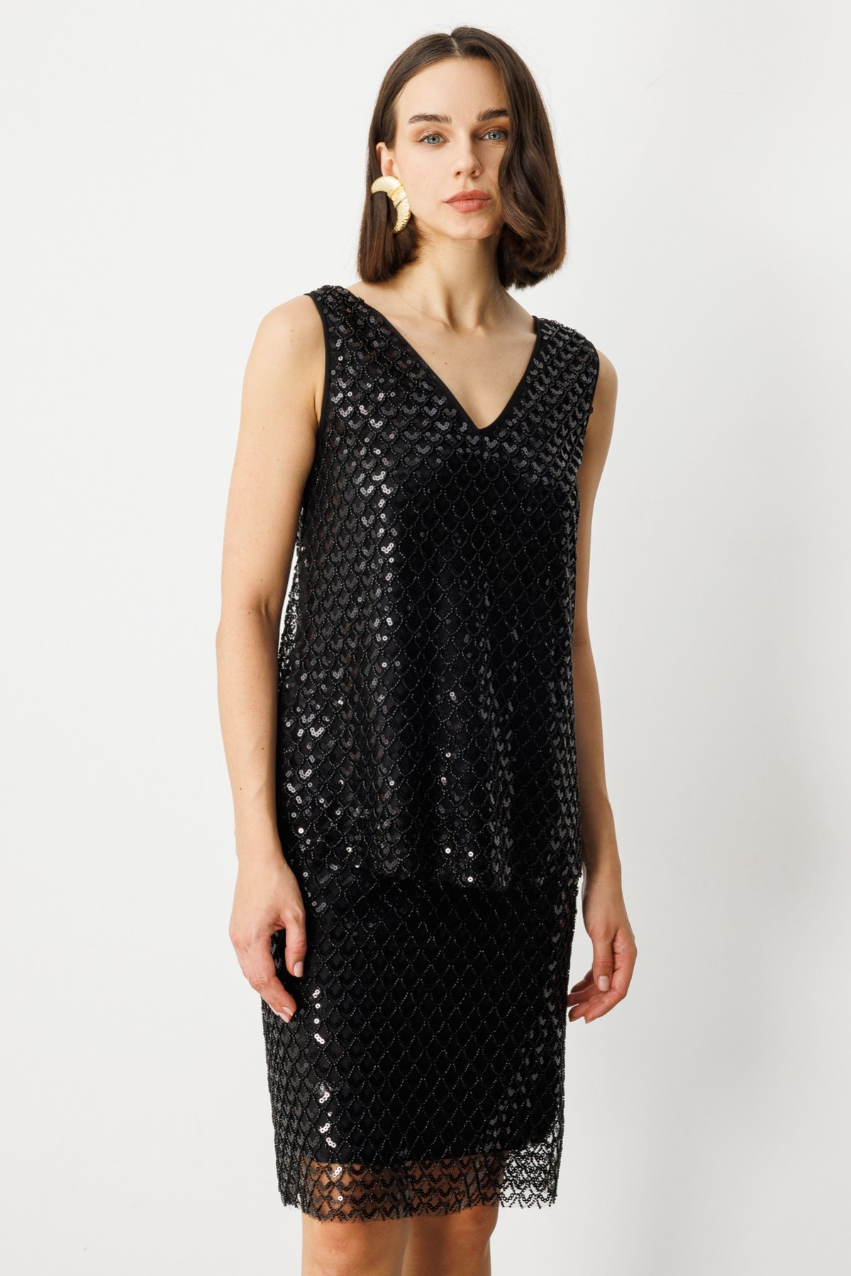 Ekol V Yaka Kolsuz Midi Pullu Bluz - Günlük & Özel Gün