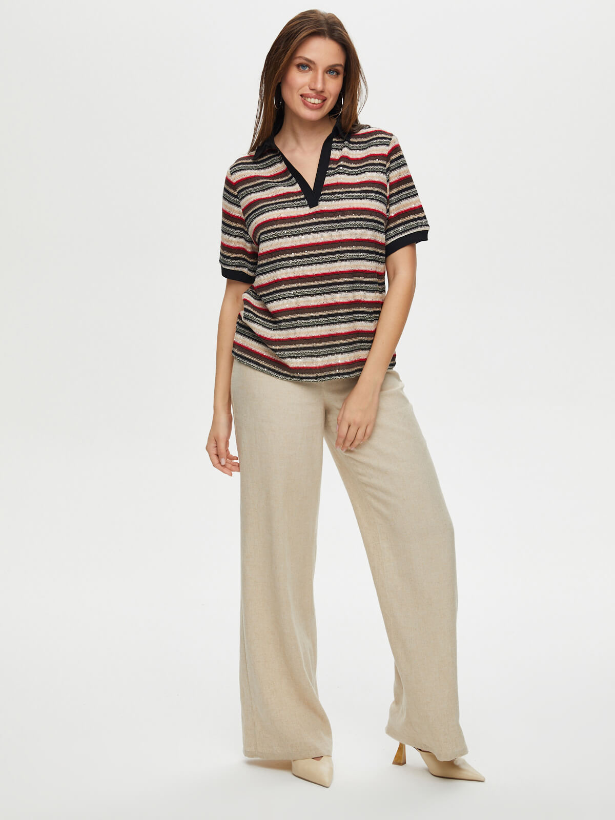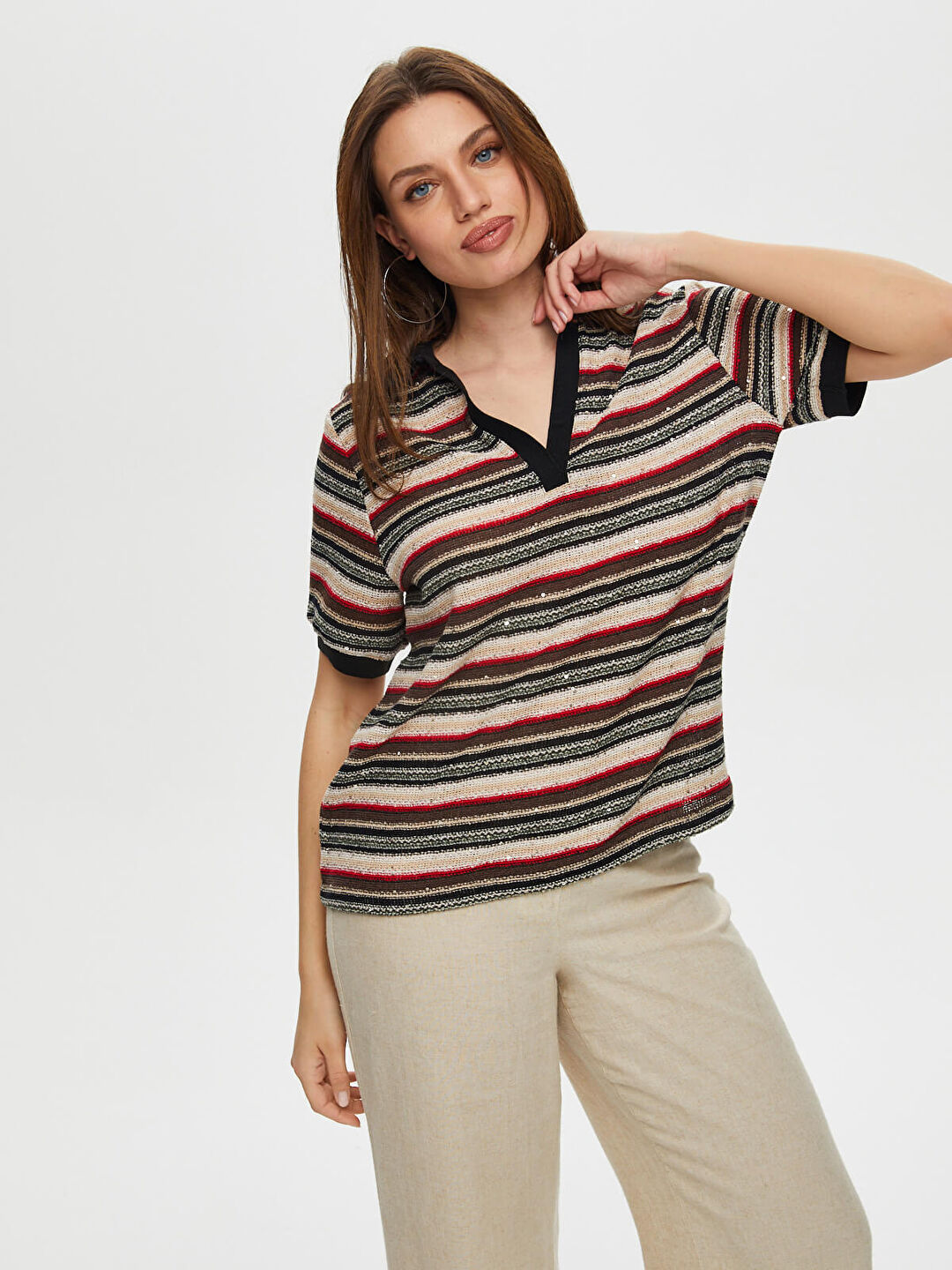 Polo Yaka Payetli Çizgili Örme Bluz Faik Sönmez%55 Pamuk %45 Polyester