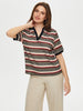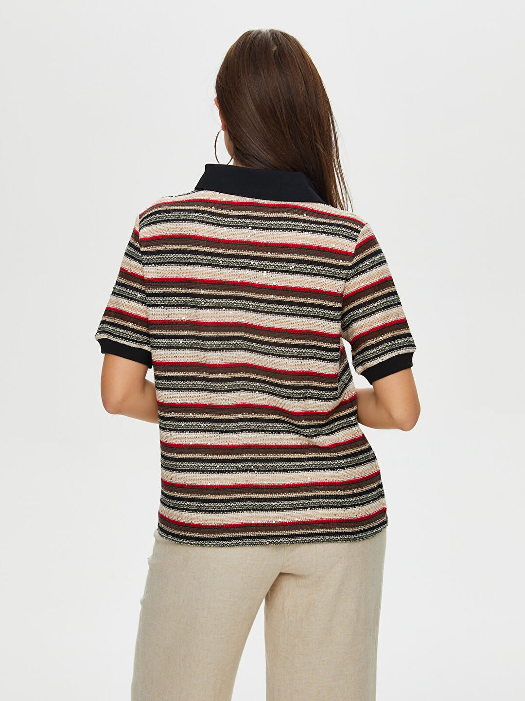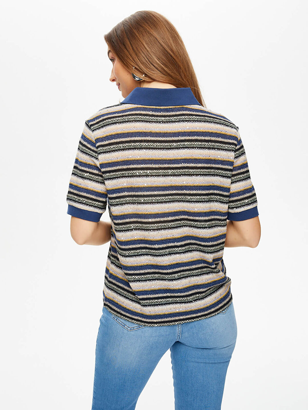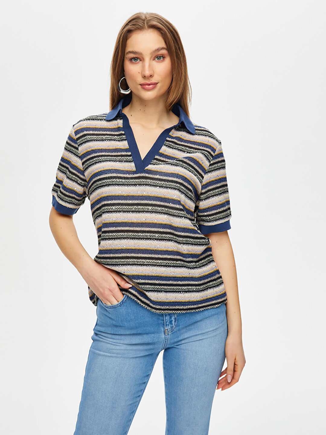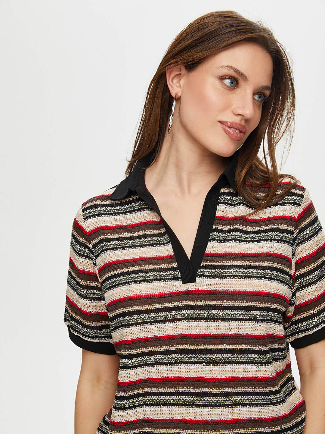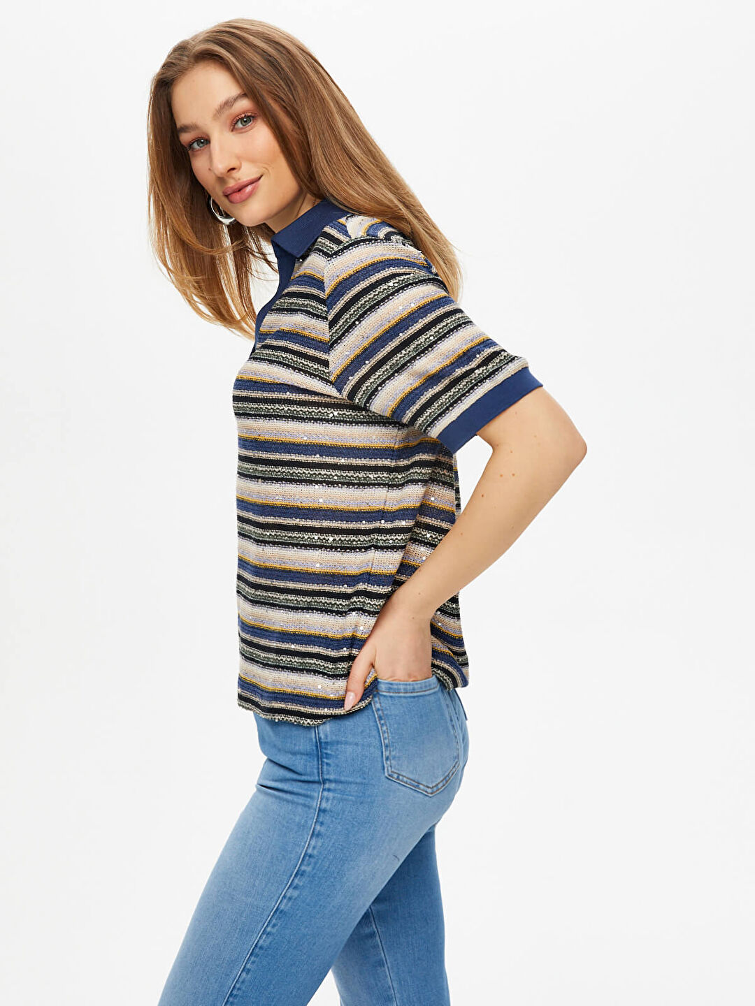 Polo Yaka Payetli Çizgili Örme Bluz Faik Sönmez