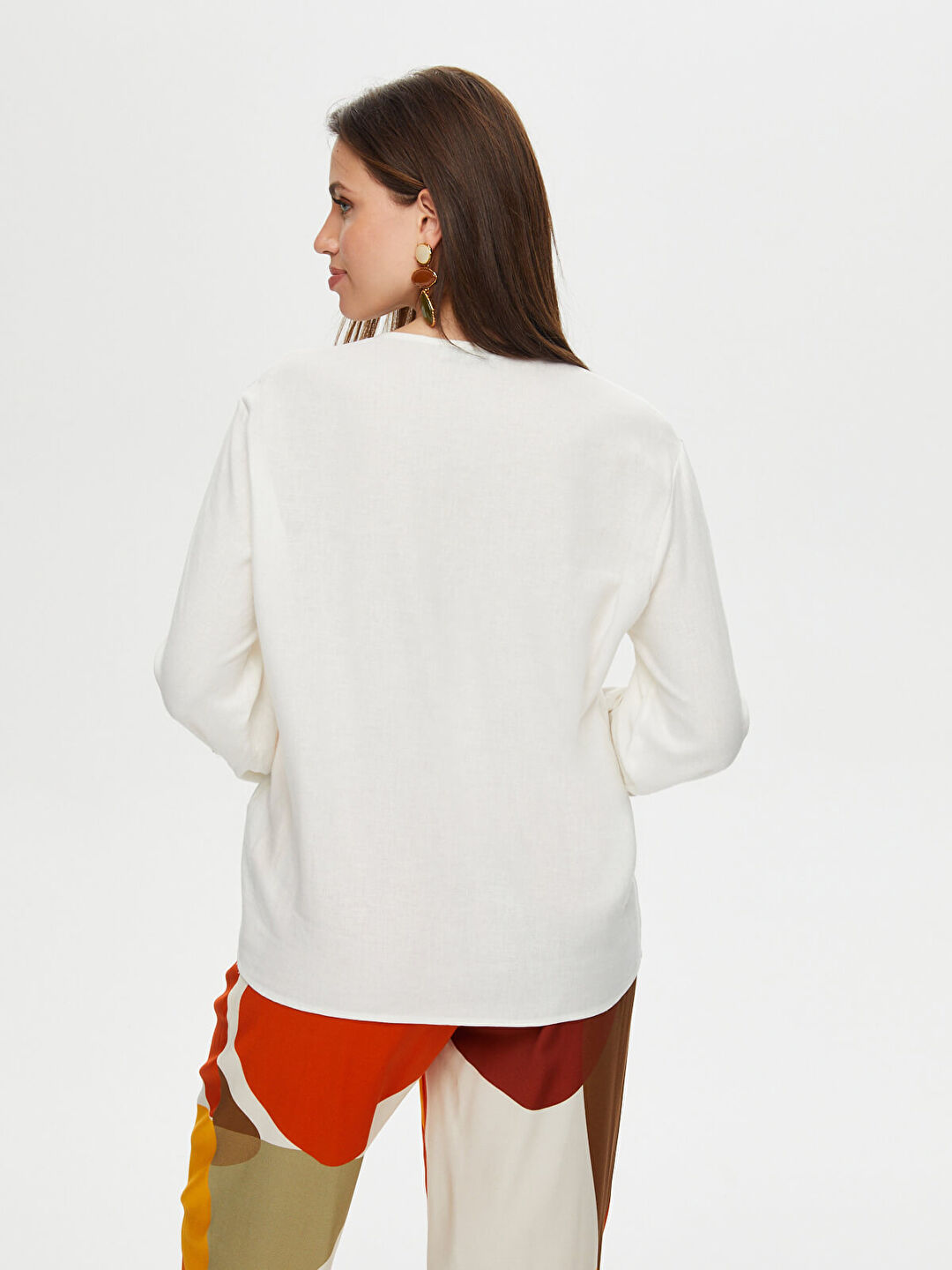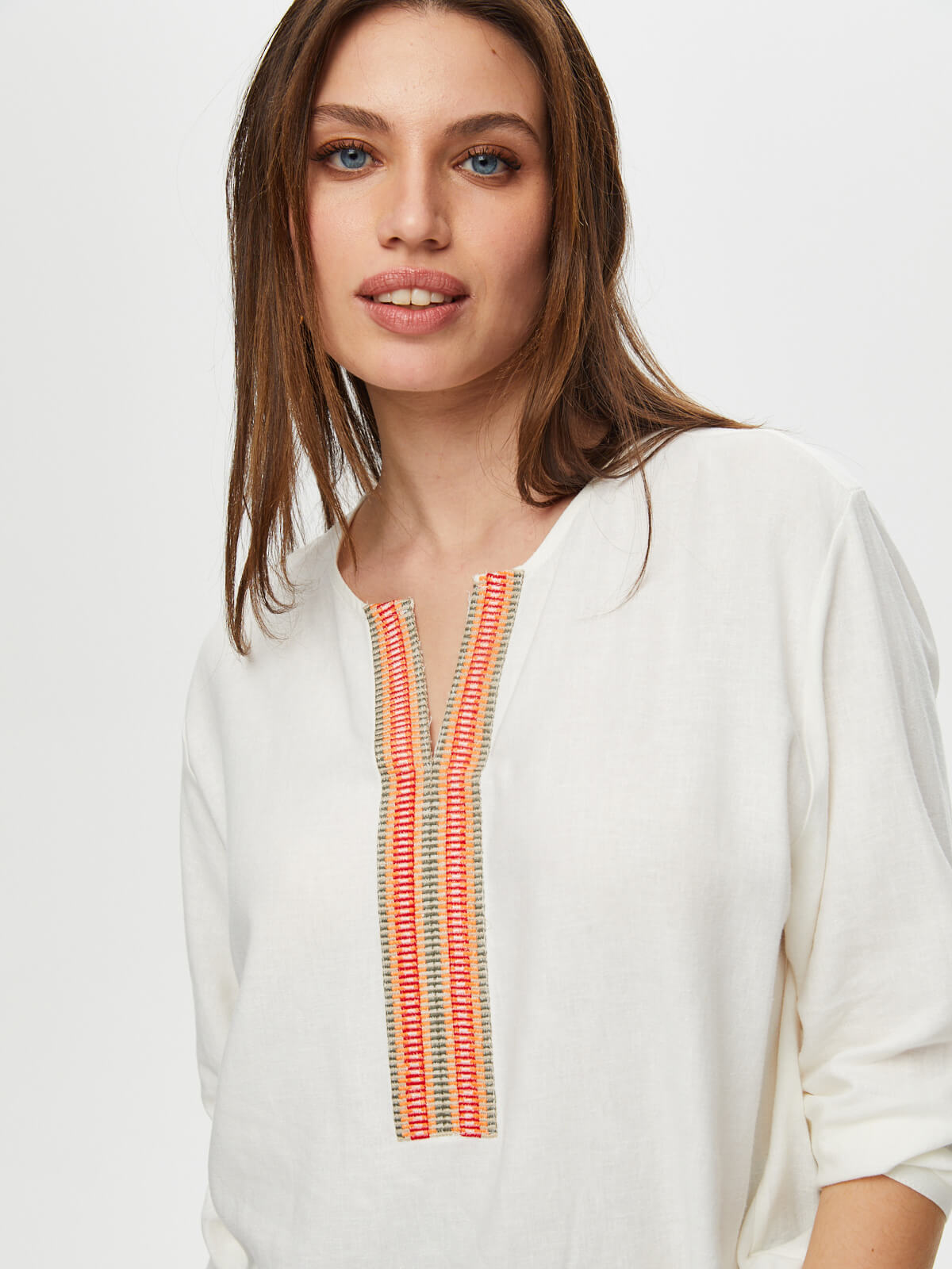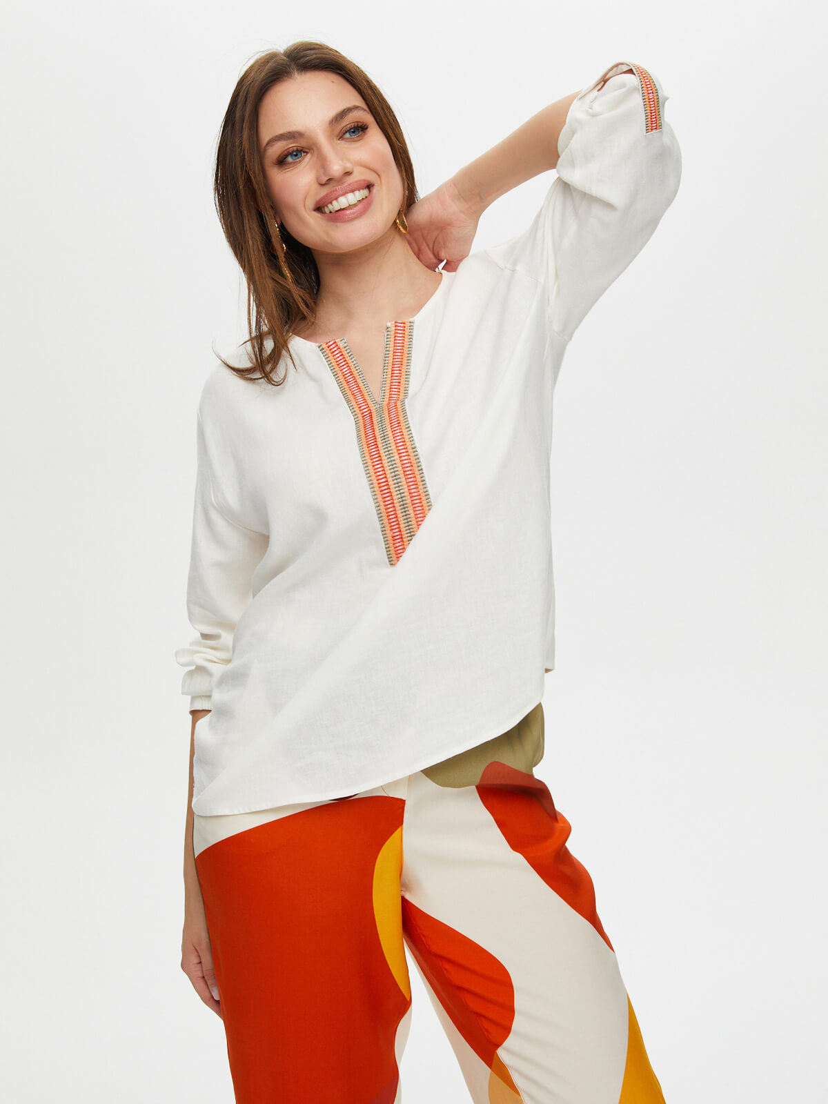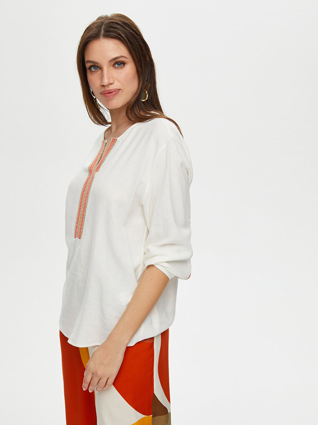Yakası Nakışlı 3/4 Kol Ketenli Bluz Faik Sönmez