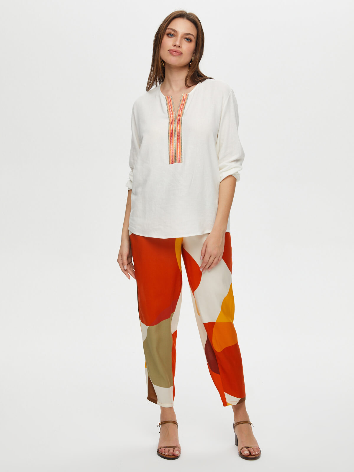 Yakası Nakışlı 3/4 Kol Ketenli Bluz Faik Sönmez%55 Viskon %45 Keten