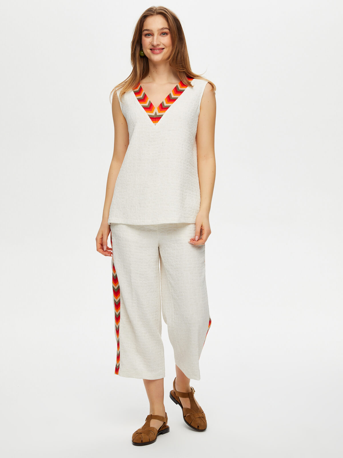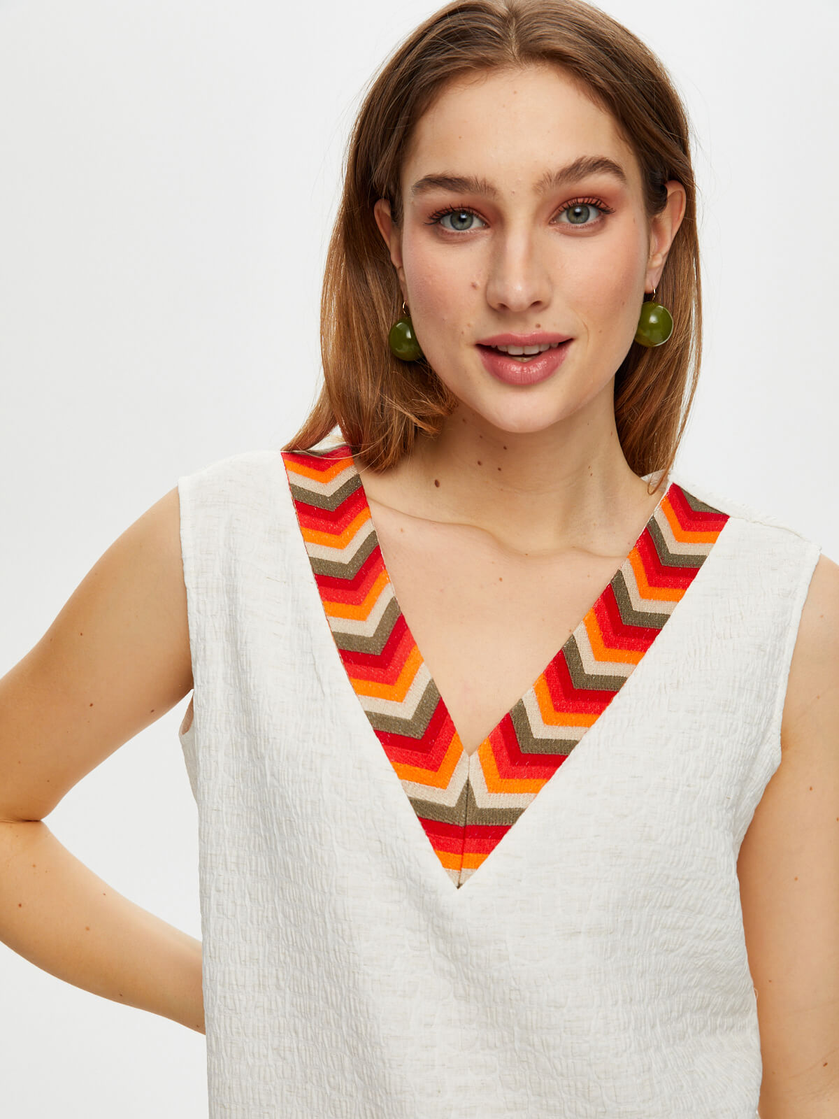 Yakası Renkli Nakışlı Kendinden Dokulu Kolsuz Bluz Faik Sönmez