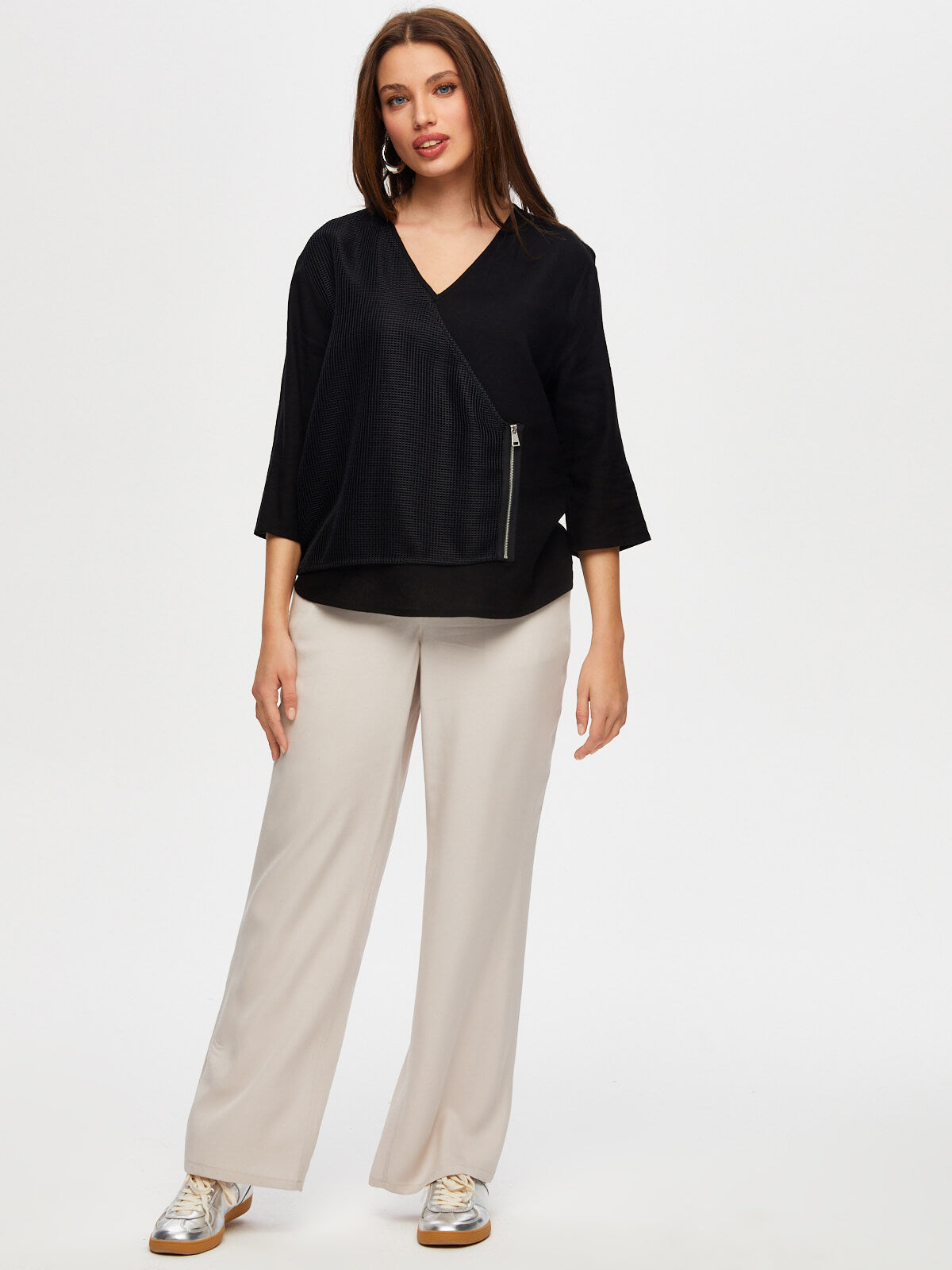 Ürün Adı : File Garnili Fermuar Detaylı Kısa Kol Ketenli Bluz S25BLZ031%55 Viskon %45 Keten