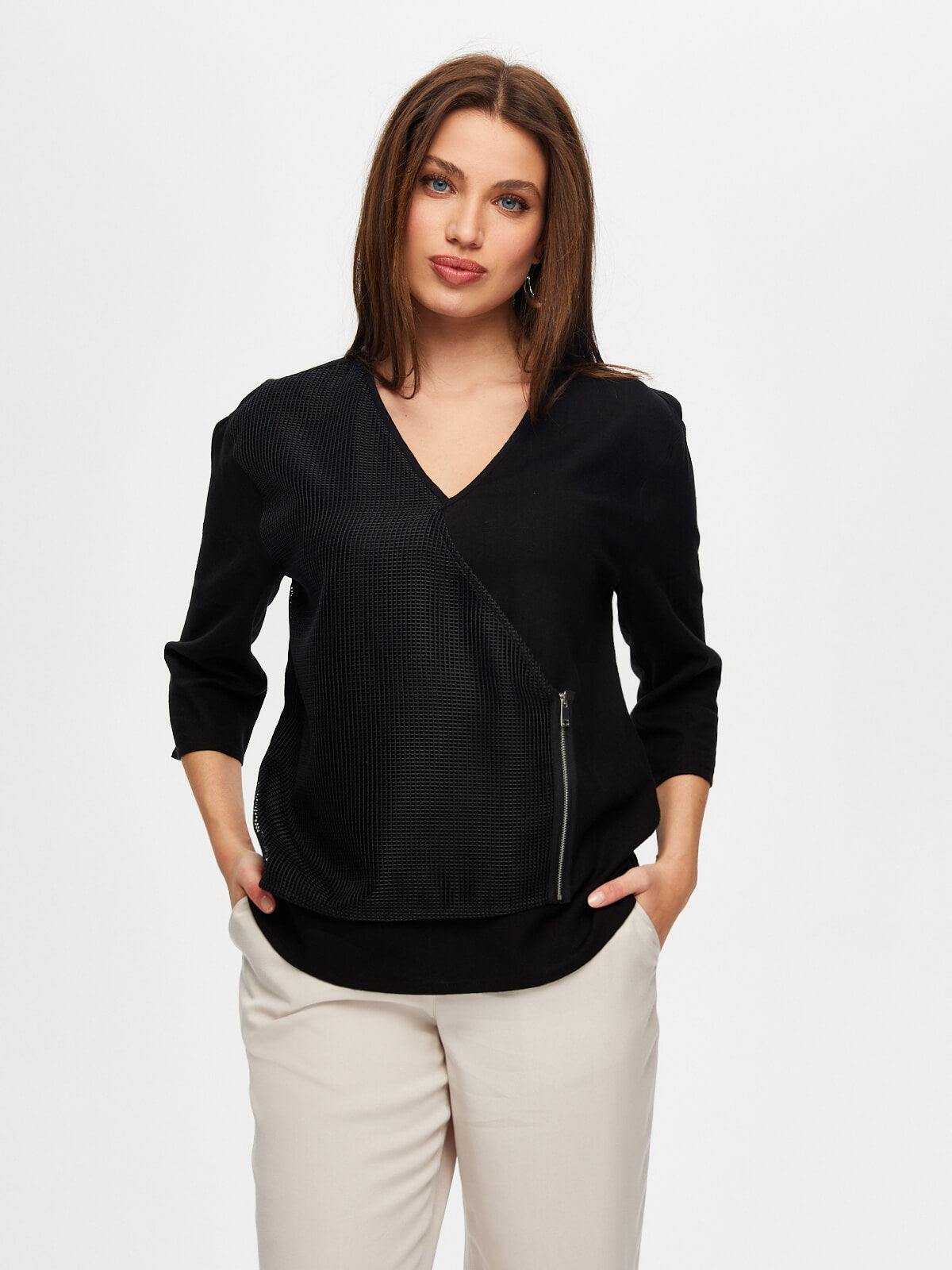 Ürün Adı : File Garnili Fermuar Detaylı Kısa Kol Ketenli Bluz S25BLZ031