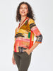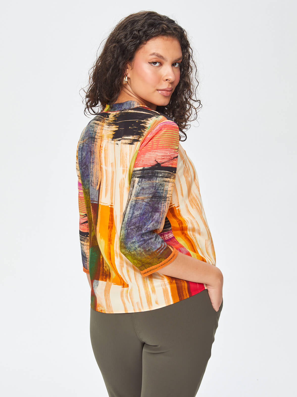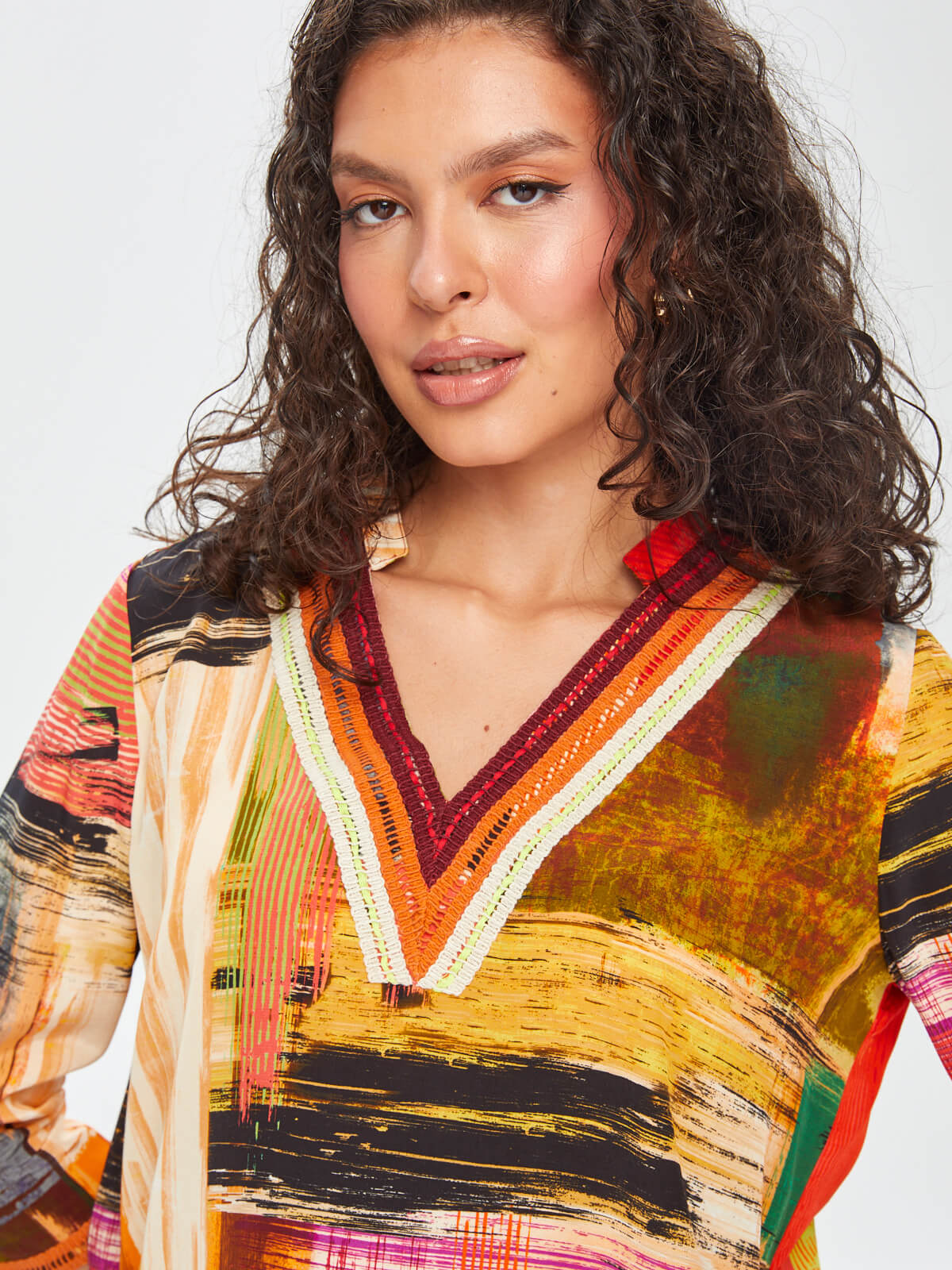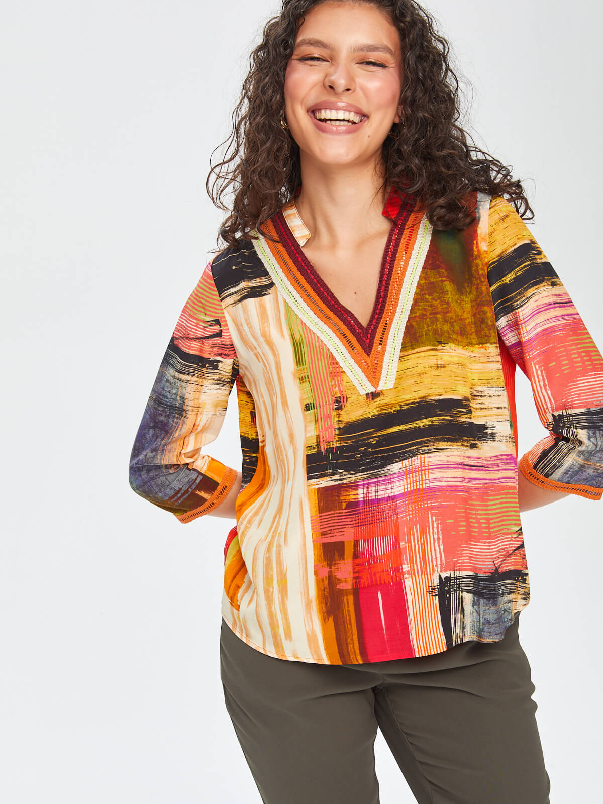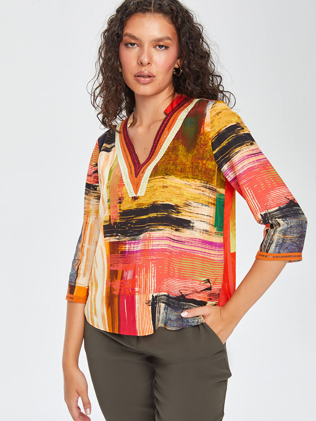 Faik Sönmez Kadın Soyut Desen Şerit Detaylı V Yaka 3/4 Kol  Bluz%51 Viskon %49 Rayon