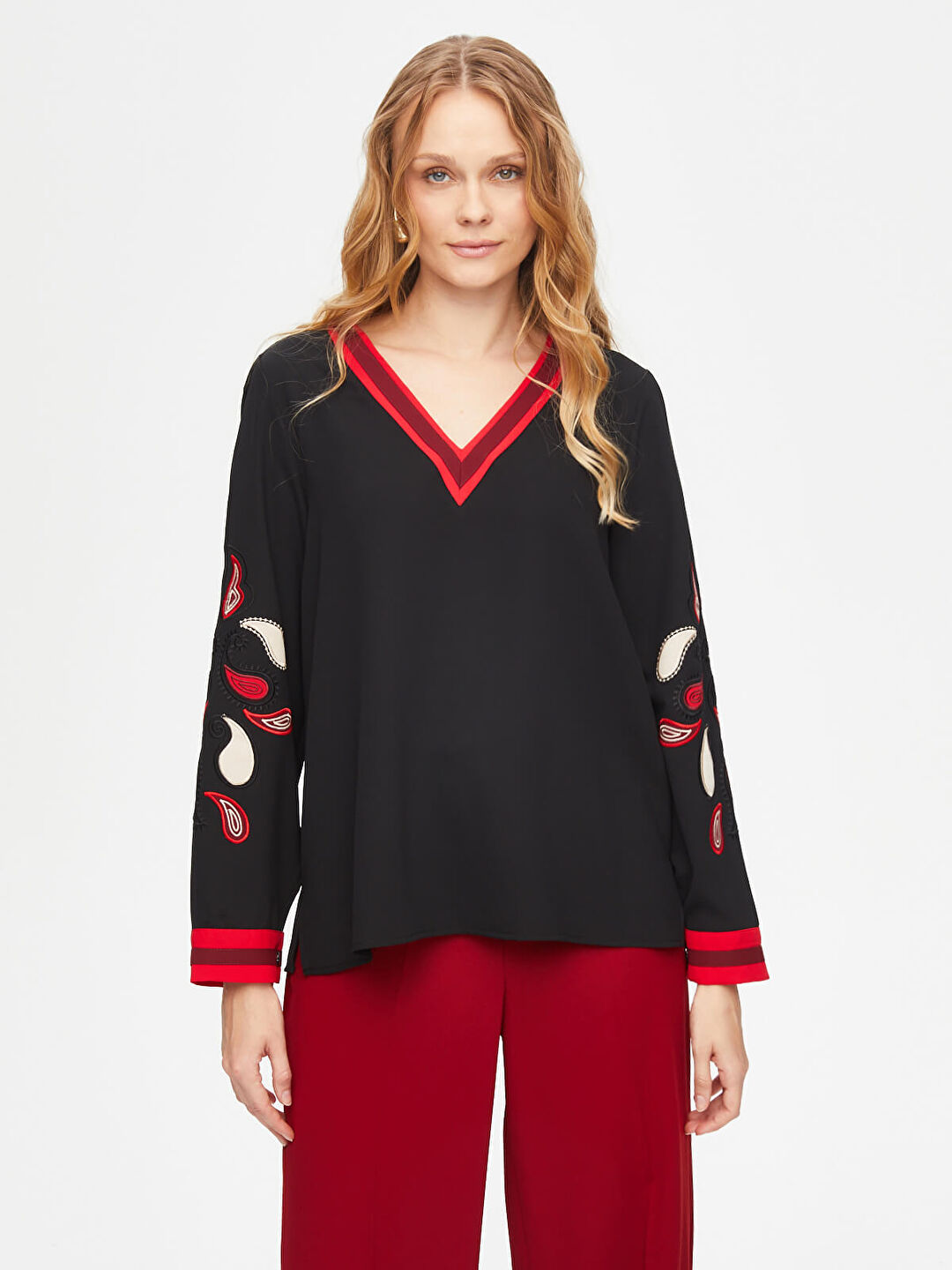 Faik Sönmez Kadın Şal Desenli Nakış Detaylı V Yaka Uzun Kollu Bluz%100 Polyester
