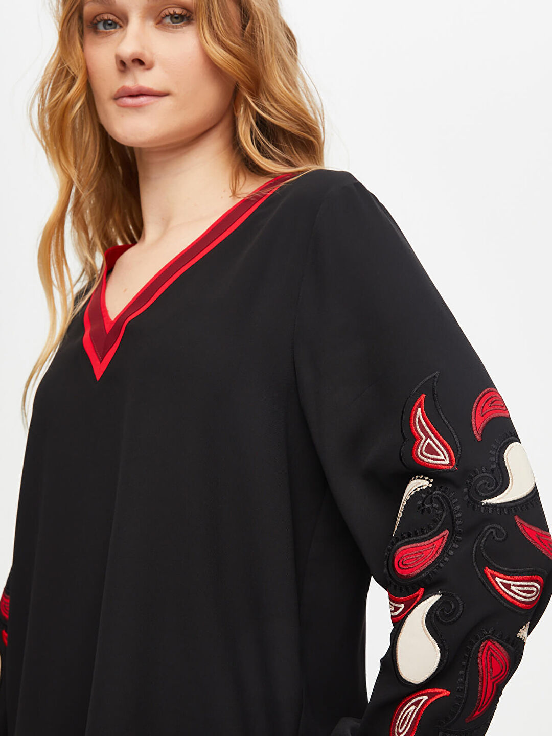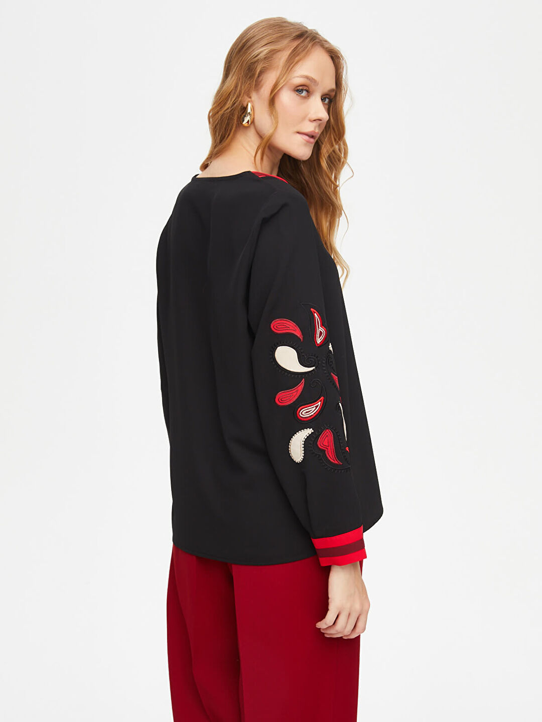 Faik Sönmez Kadın Şal Desenli Nakış Detaylı V Yaka Uzun Kollu Bluz
