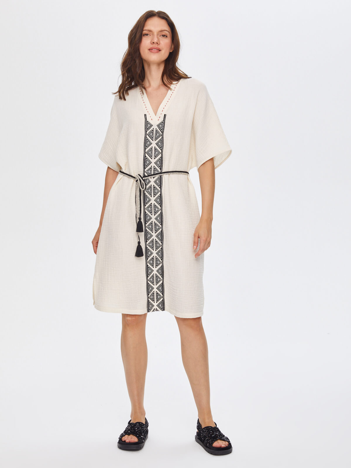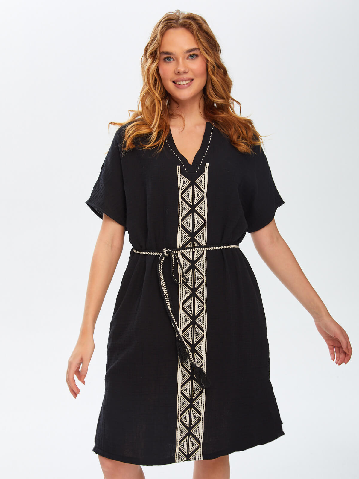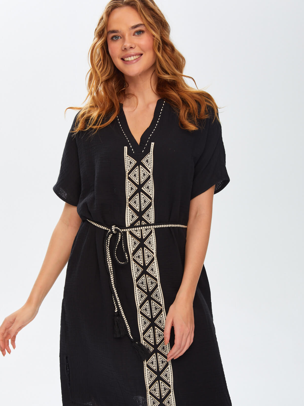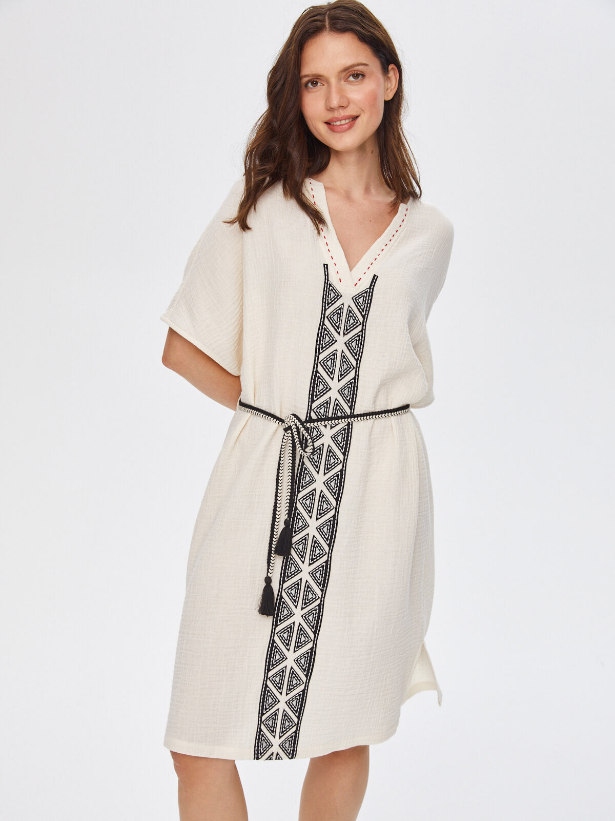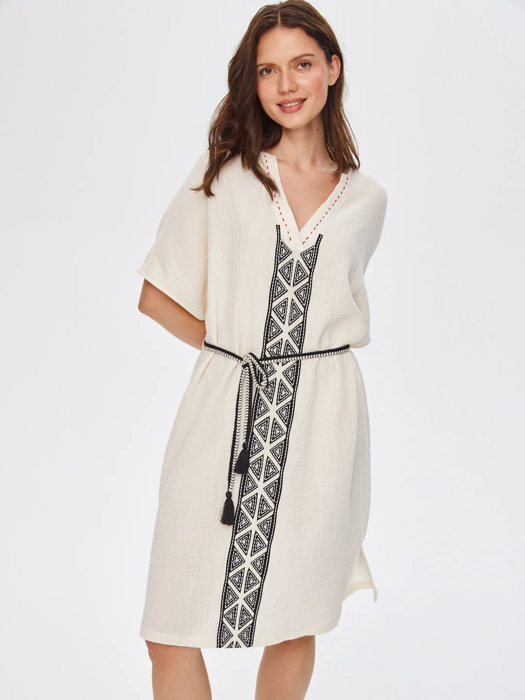 Ürün Adı : Resort Kontrast Yakalı Önü Nakış İşli Müslin Elbise 68791