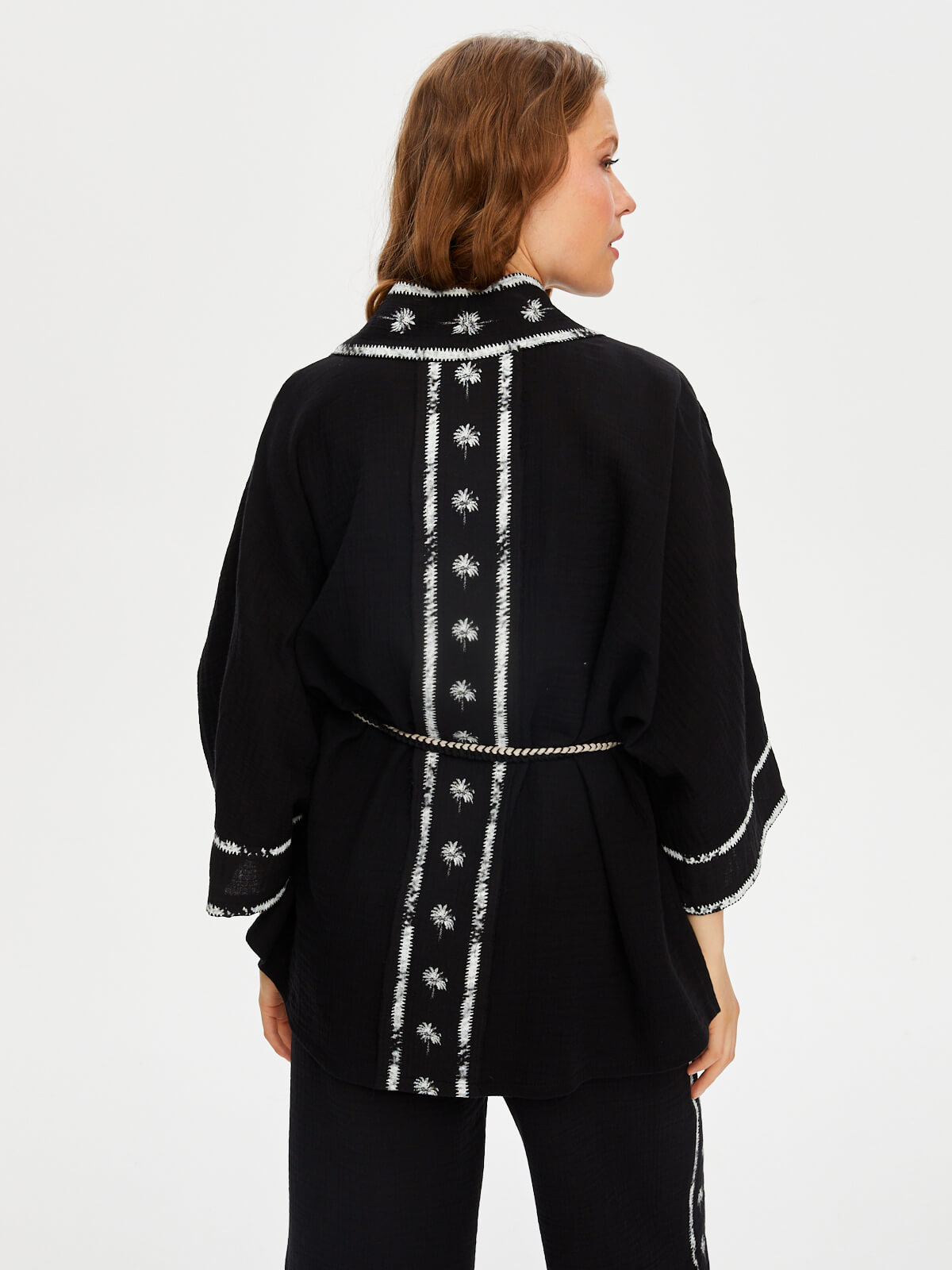 Faik Sönmez imzalı bu şık kimono ile tarzınıza farklı bir hava katın! Oversize ve midi boy kesimiyle rahatlığı ve şıklığı bir arada sunan kimono, ince işçilikle yapılmış özgün nakış detaylarıyla dikkat çekiyor. 3/4 kollu tasarımı, yaz aylarında serin kalmanızı sağlarken, minimalist ve bohem stiliyle her kombine uyum sağlar. Günlük kullanımdan özel davetlere kadar her ortamda rahatlıkla tercih edebileceğiniz bu kimono, gardırobunuzun vazgeçilmez parçalarından biri olacak. Doğal ve nefes alabilen kumaş yapısıyla gün boyu konfor sunar. Pamuk veya benzeri doğal bir kumaştan üretilmiş olup, zamansız ve şık bir tarz arayanlar için idealdir. Kaliteli işçiliği ve özgün tasarımıyla Faik Sönmez kalitesini yansıtan bu kimono, tarzınızı mükemmel bir şekilde tamamlayacak. Vintage esintileri taşıyan modeliyle de son derece trend bir seçenek.
