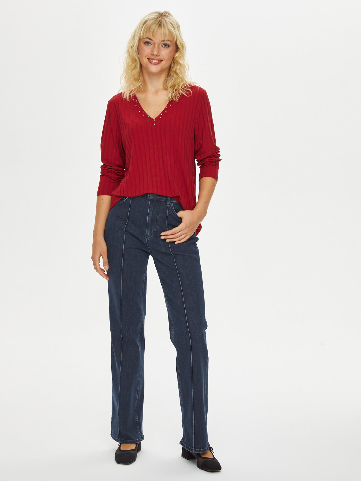 Ürün Adı : Trok Taş Detaylı V Yaka Kaşkorse Uzun Kol T-Shirt 69550