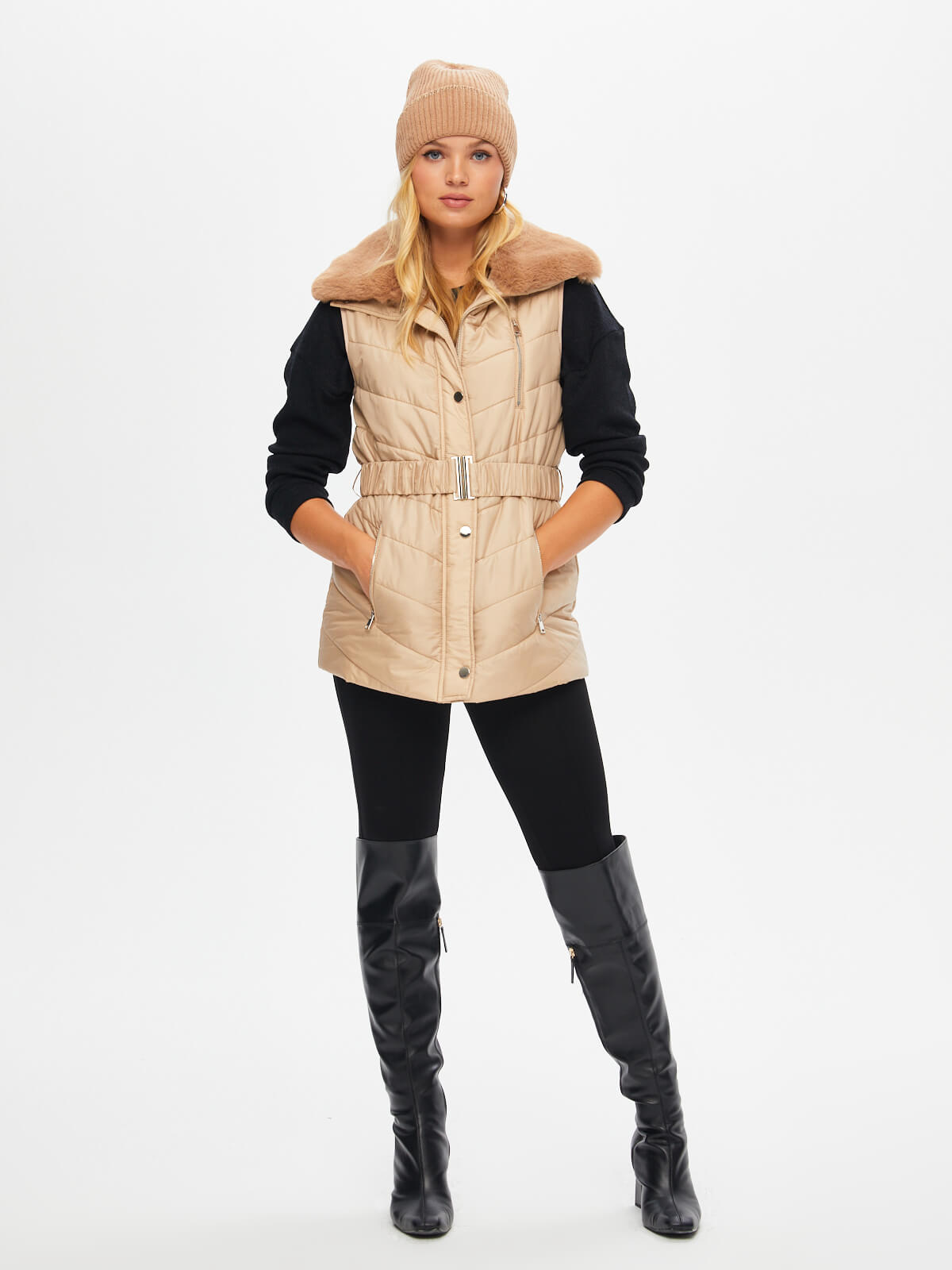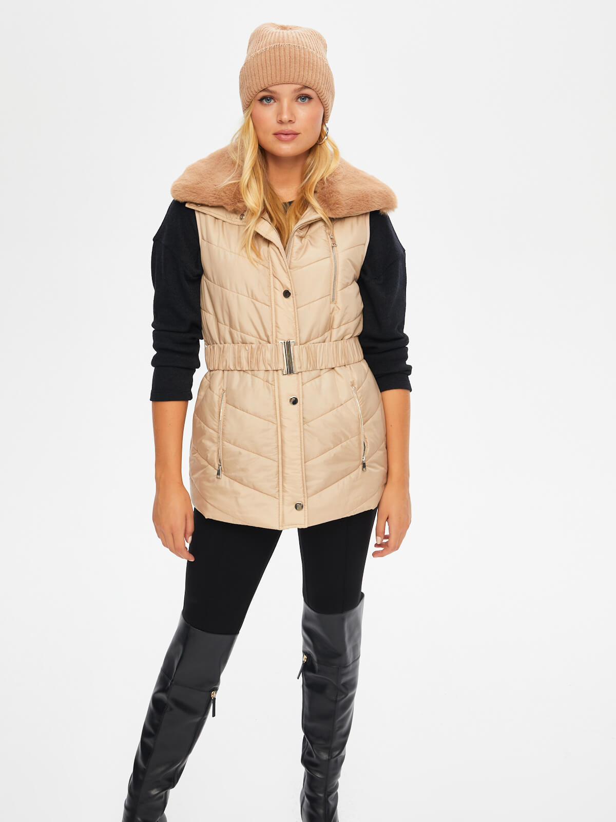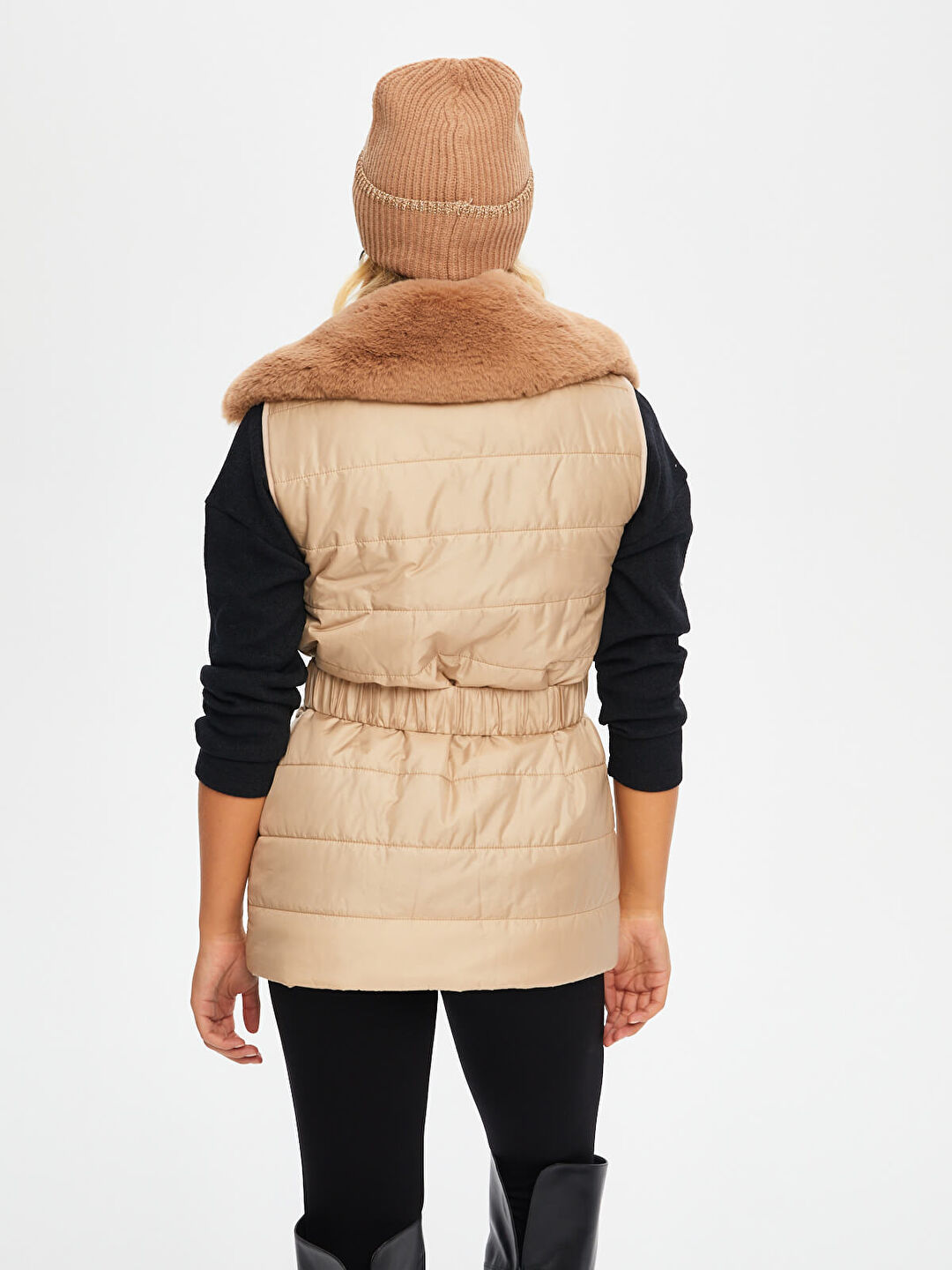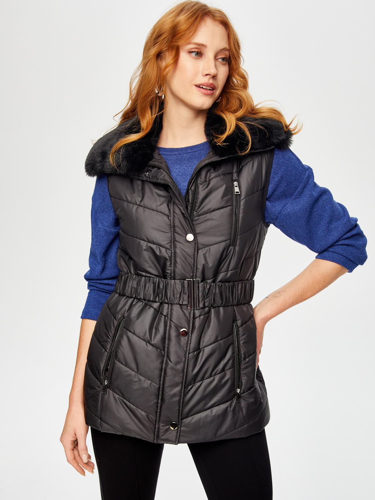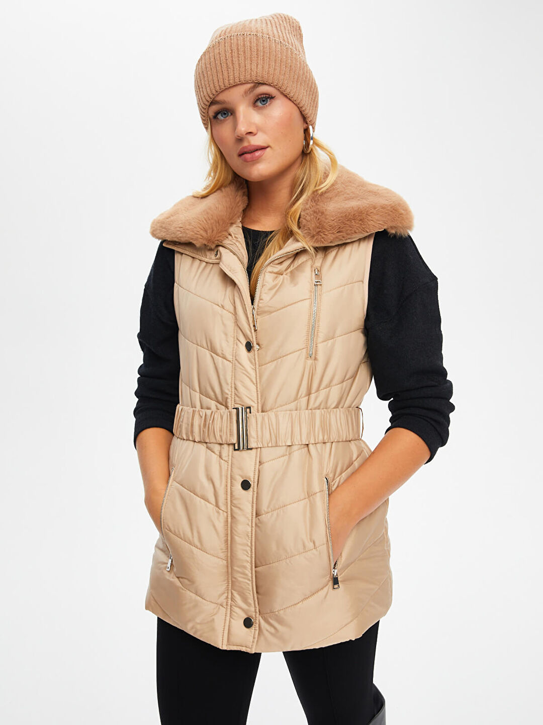 Faik Sönmez Kadın Kemerli Kapüşonlu Uzun Kapitone Yelek U69455%100 Polyester
