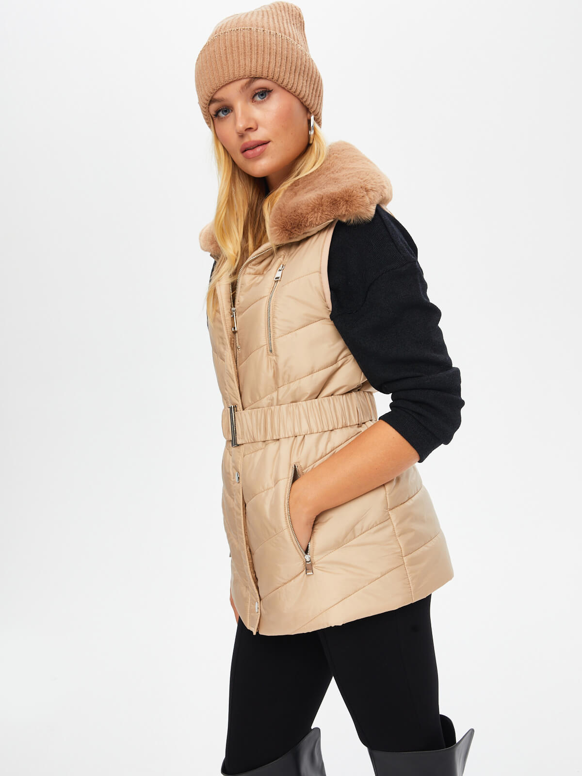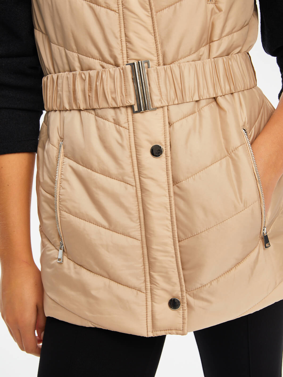 Faik Sönmez Kadın Kemerli Kapüşonlu Uzun Kapitone Yelek U69455