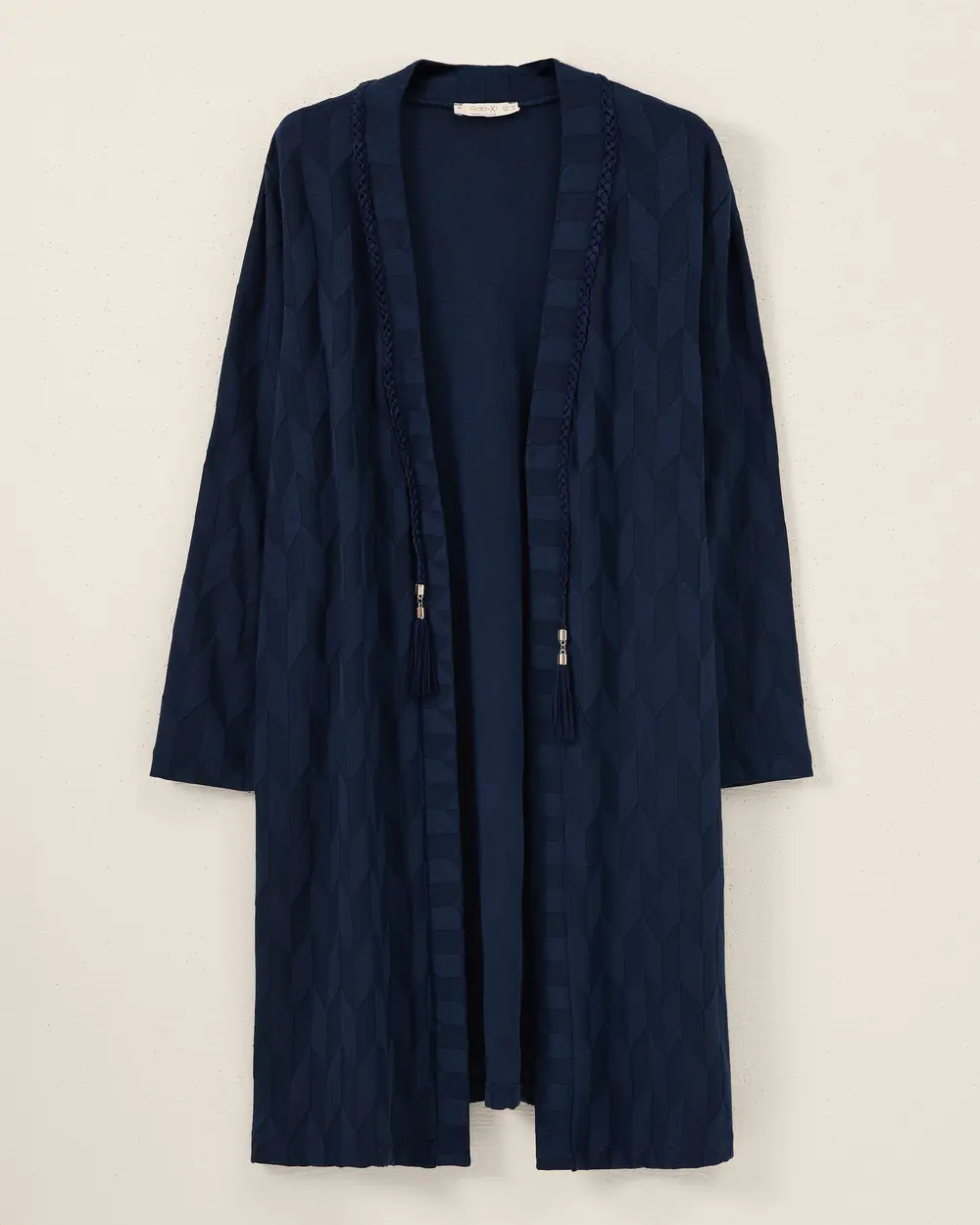 Büyük Beden Desenli Püskül Detaylı Hırka, modern desenleri ve püskül detaylarıyla günlük stilinize hareket katar.