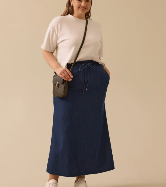 Büyük Beden Cepli Bağcıklı Jean Etek, lastikli beli ve cepleriyle rahat ve kullanışlıdır. Günlük şık kombinler için idealdir.