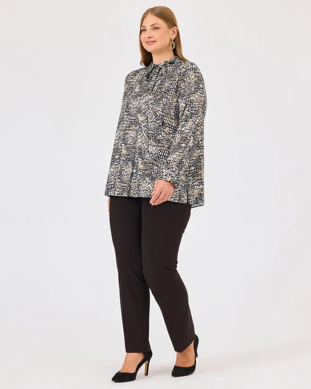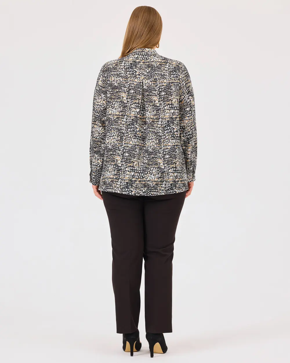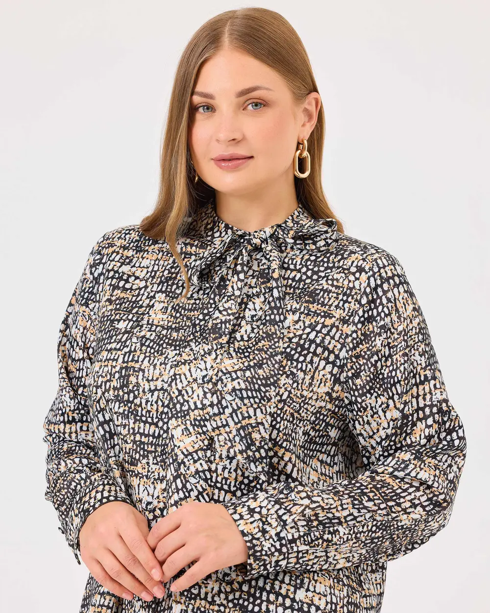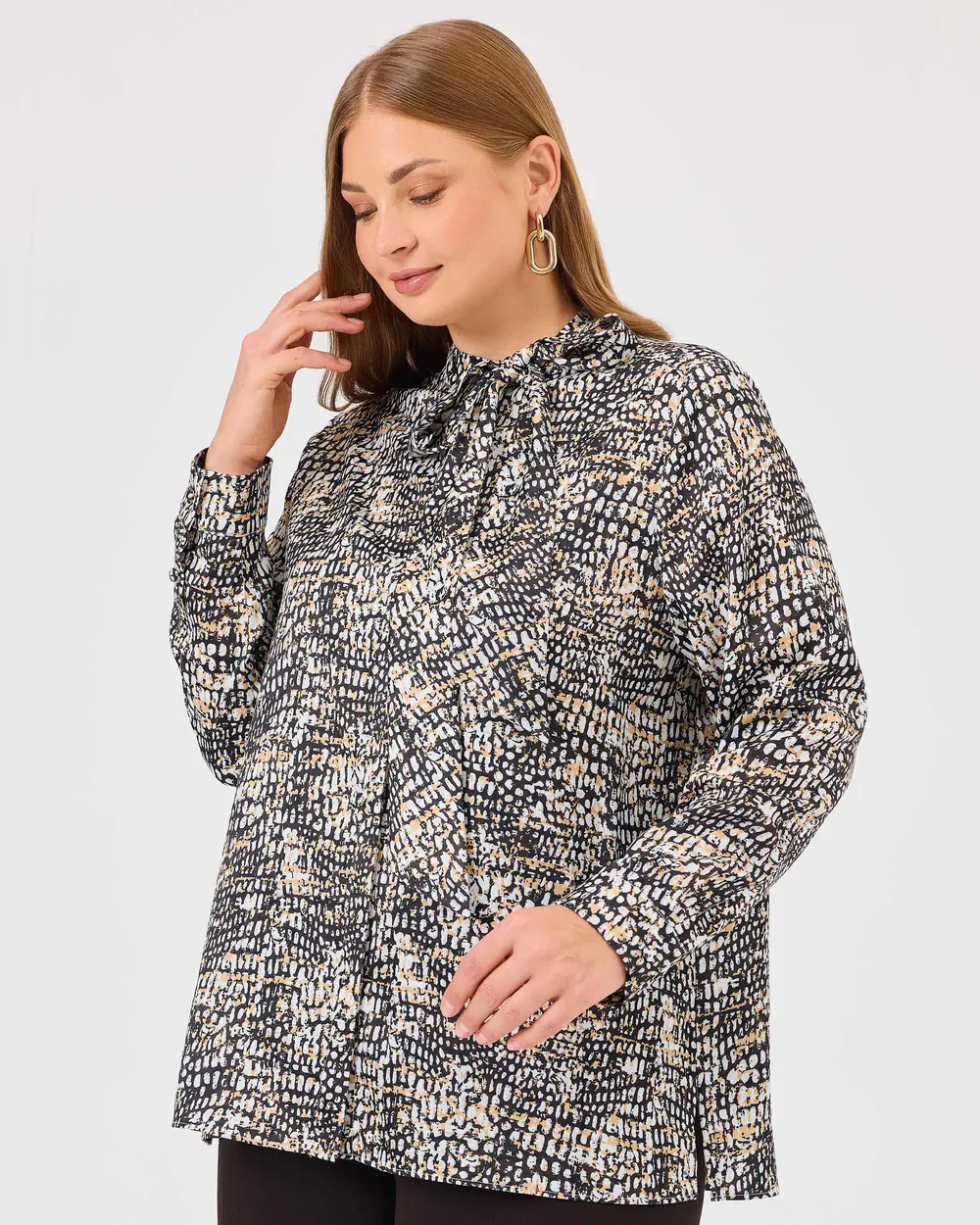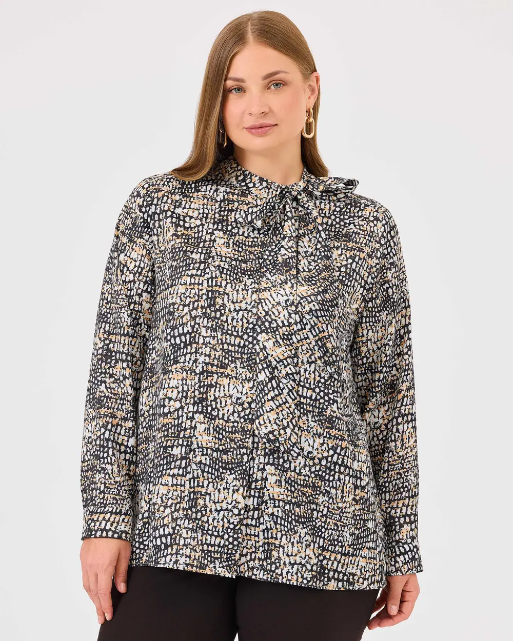 Büyük Beden Yakası Bağlamalı Desenli Gömlek, uzun kollu ve şık desenli tasarımıyla tarzınıza hareket katıyor. Bağlama detayıyla zarif bir görünüm sunar.