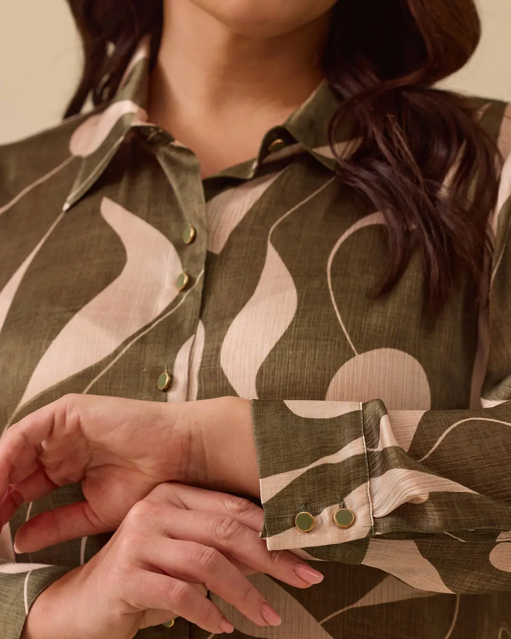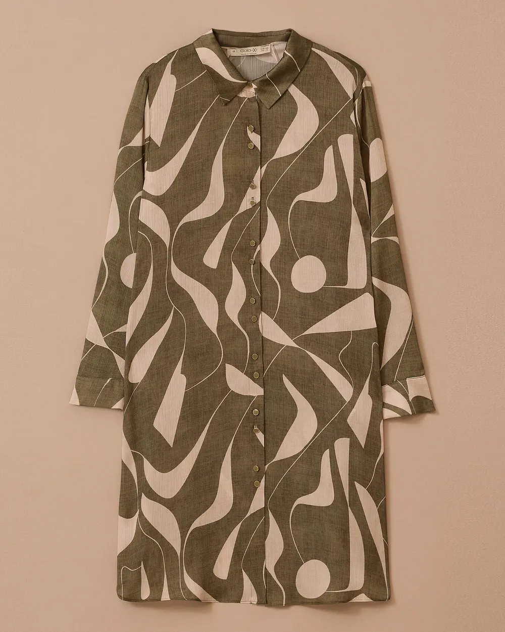 Büyük Beden Desenli Uzun Kollu Tunik, modern deseni ve rahat kesimiyle günlük şıklık sunar. Hafif kumaşı ve düğmeli tasarımıyla konforlu ve kullanışlıdır.