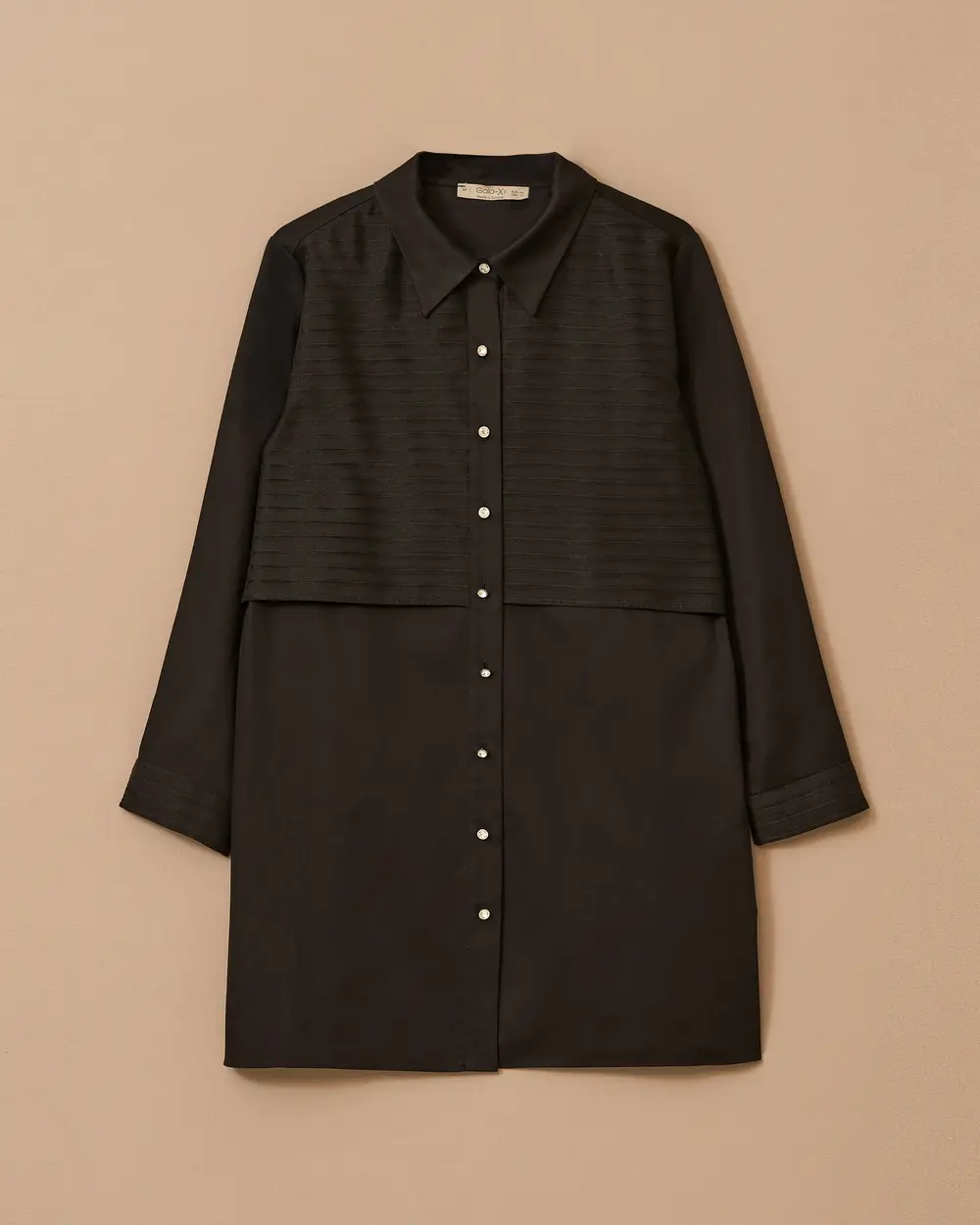 Büyük Beden Çizgi Detaylı Düğmeli Katmanlı Tunik, gömlek yaka ve katmanlı tasarımıyla modern bir görünüm sunar. Rahat kesimiyle günlük ve şık kombinlere uygundur.