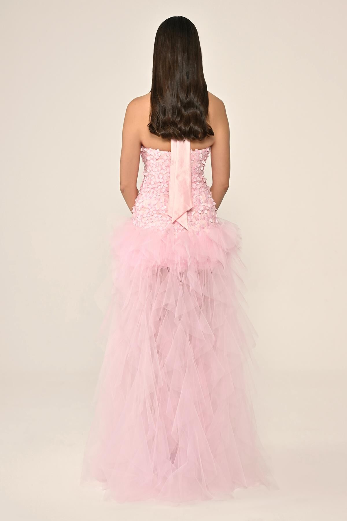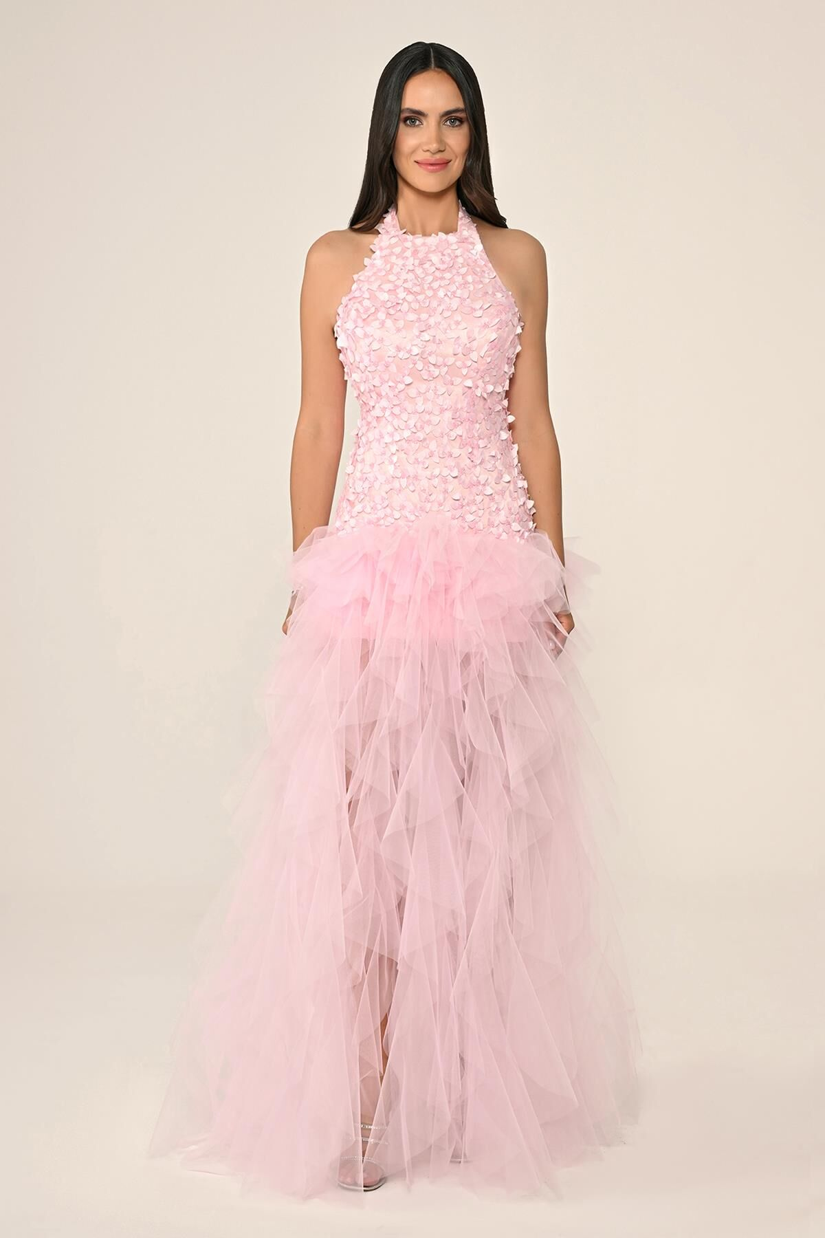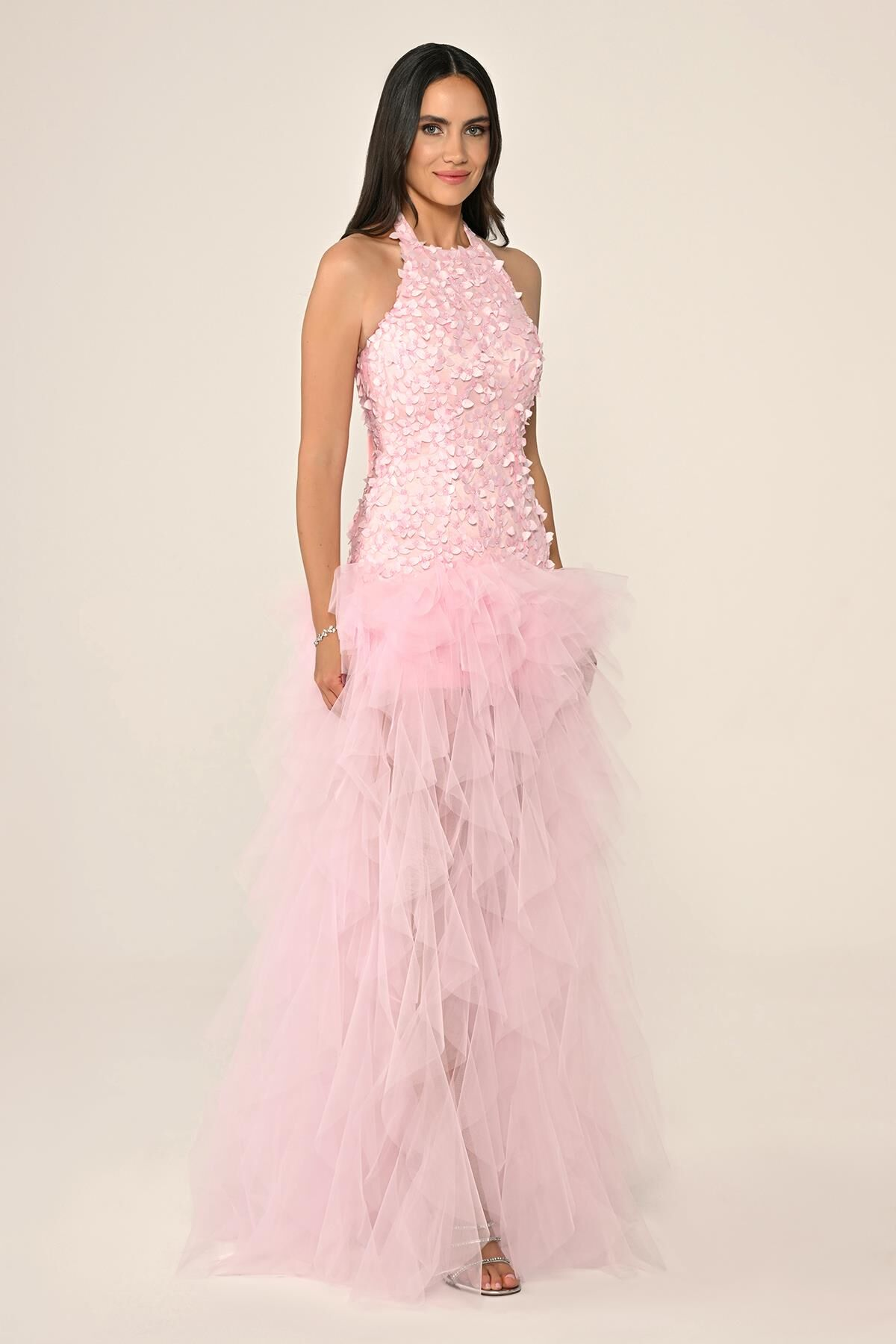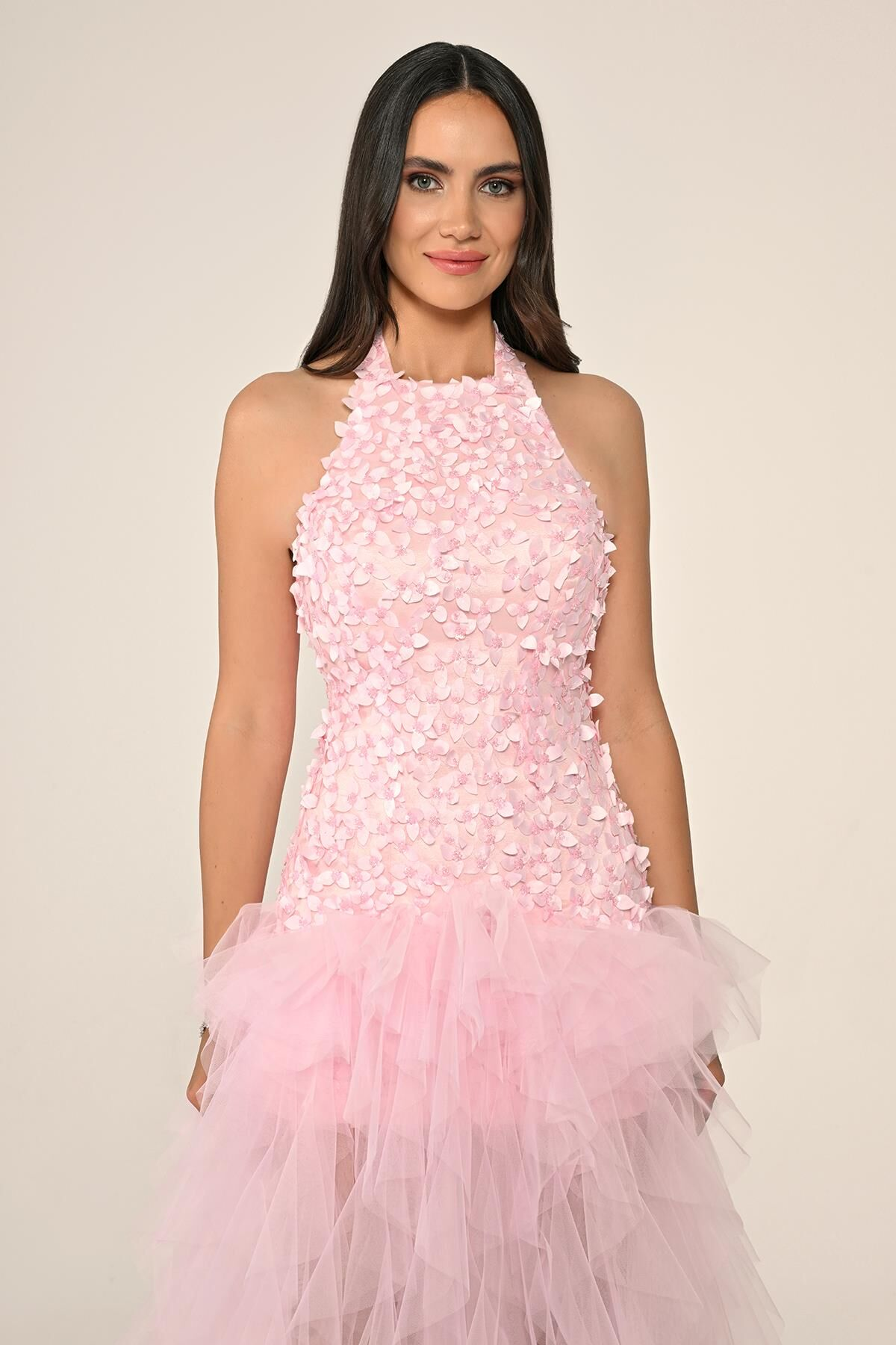 Halter Yaka Üst 3 Boyut Çiçekli Eteği Katlı Tül Uzun Abiye Elbise Alfa Beta