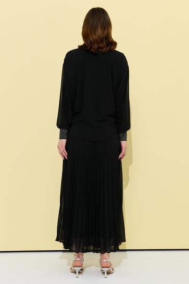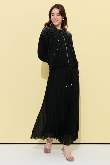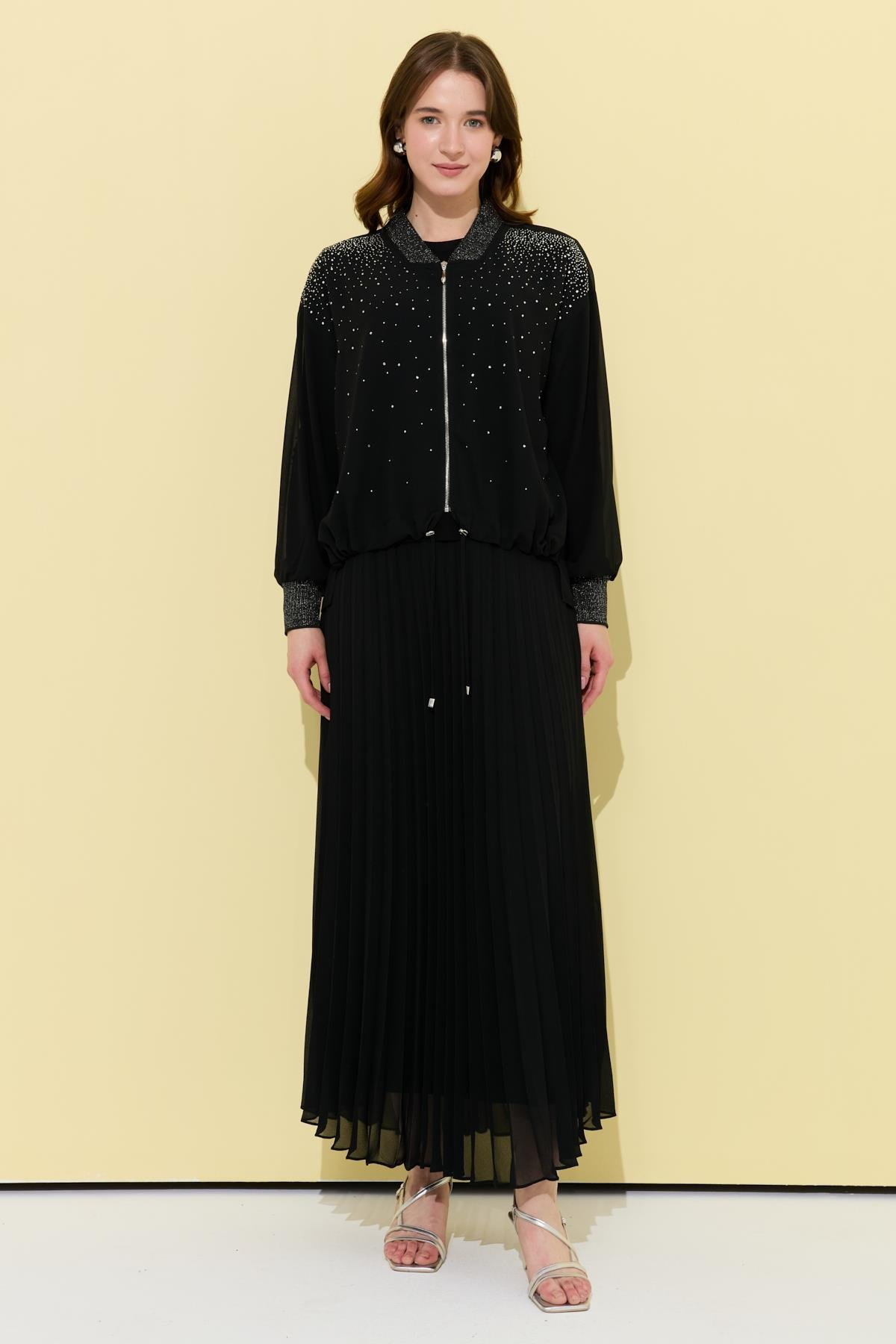 DOKUMA ŞİFON KUMAŞ, RİBANA VE TAŞ YAPIŞTIRMA DETAYLI, ÖNDEN FERMUARLI, BELİ LASTKLİ PİLİSELİ ETEKLİ TAKIM, TAM KALIP CEKET BOYU : 60 cm ETEK BOYU : 90 cm