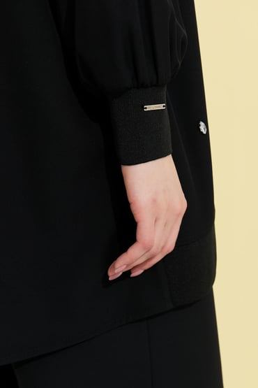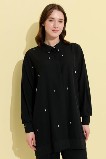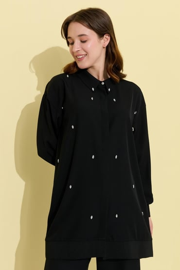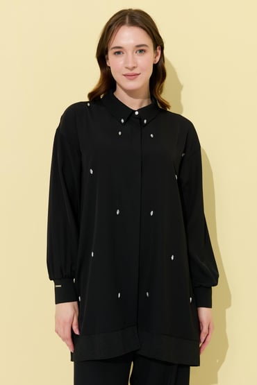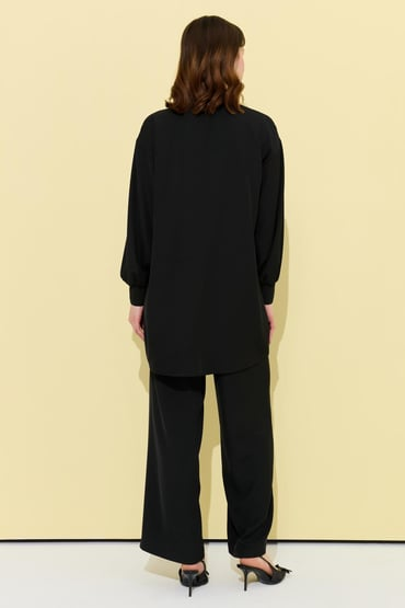 Dokuma kumaş Kol ve etek ucu Ribanalı gizli düğme kapamalı Çakma taş detaylı Beli lastikli pantolonlu takım Tam kalıp Gömlek boyu 85 cm Pantolon boyu 105 cm