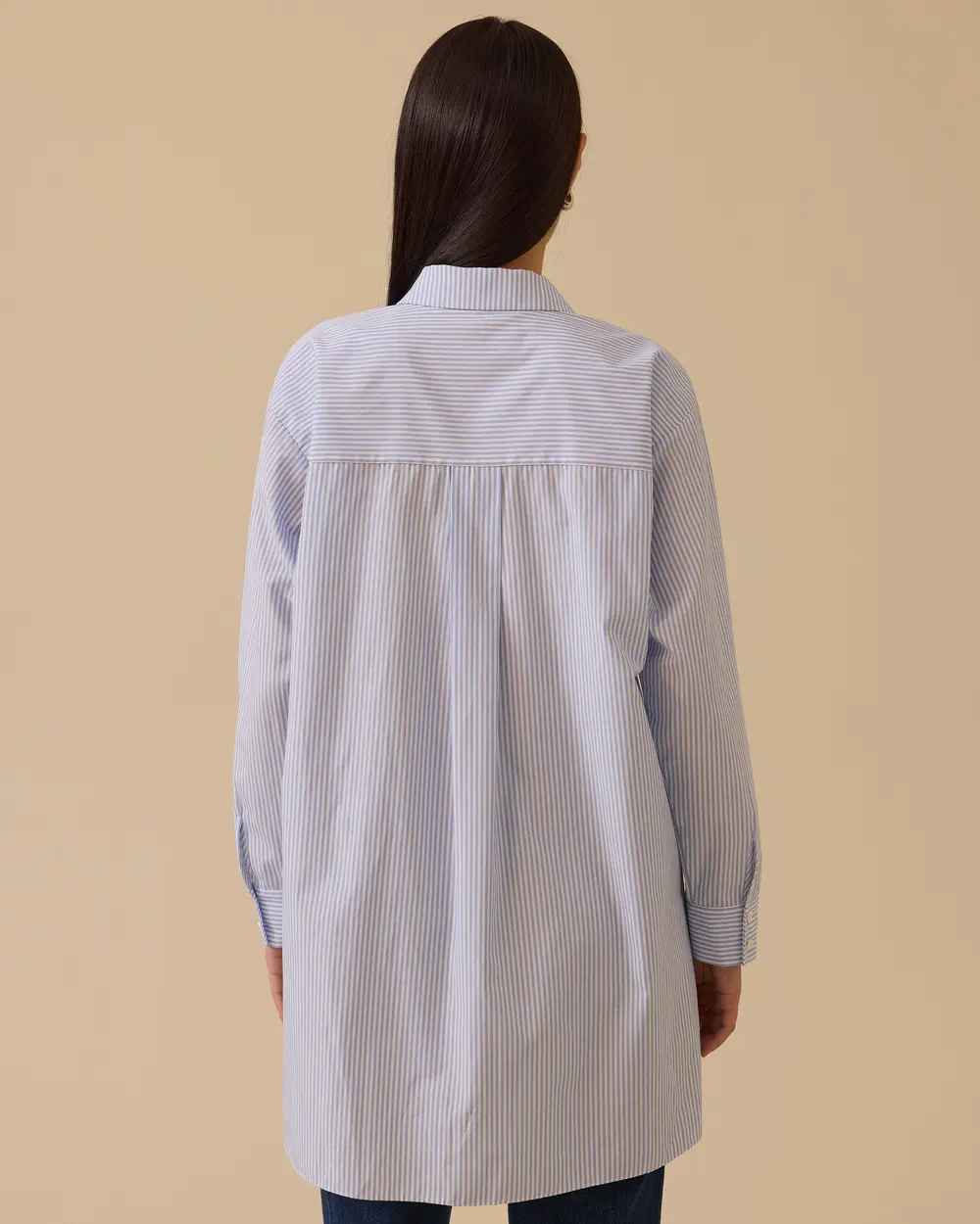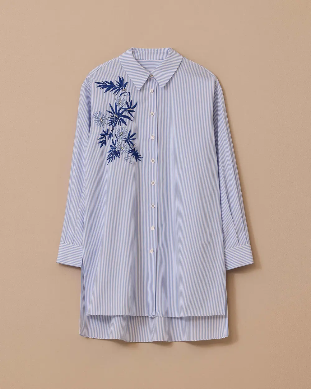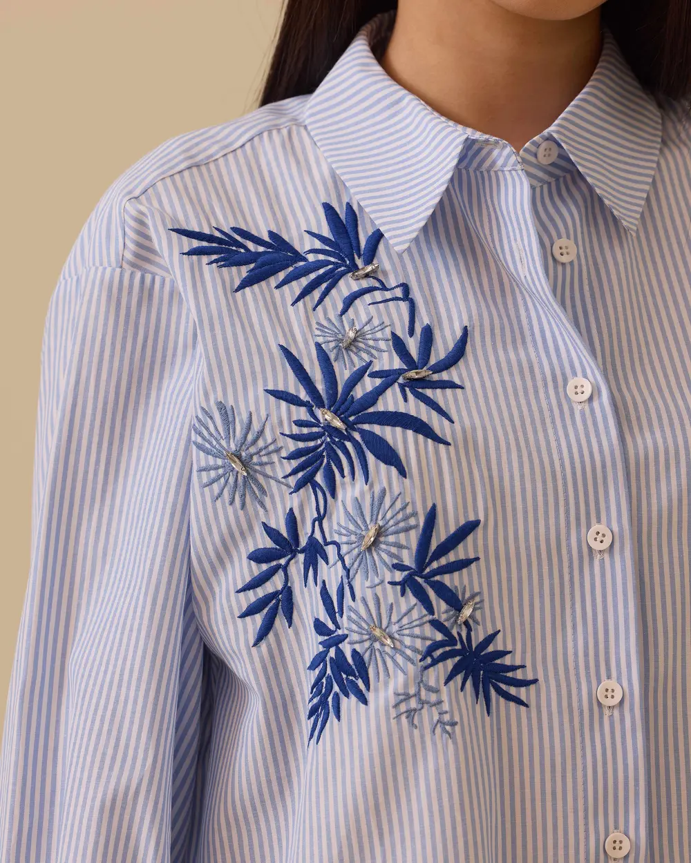 Nakış Detaylı Çizgili Gömlek, ince çizgili deseni ve zarif nakış işlemeleriyle klasik stile modern bir dokunuş katar.