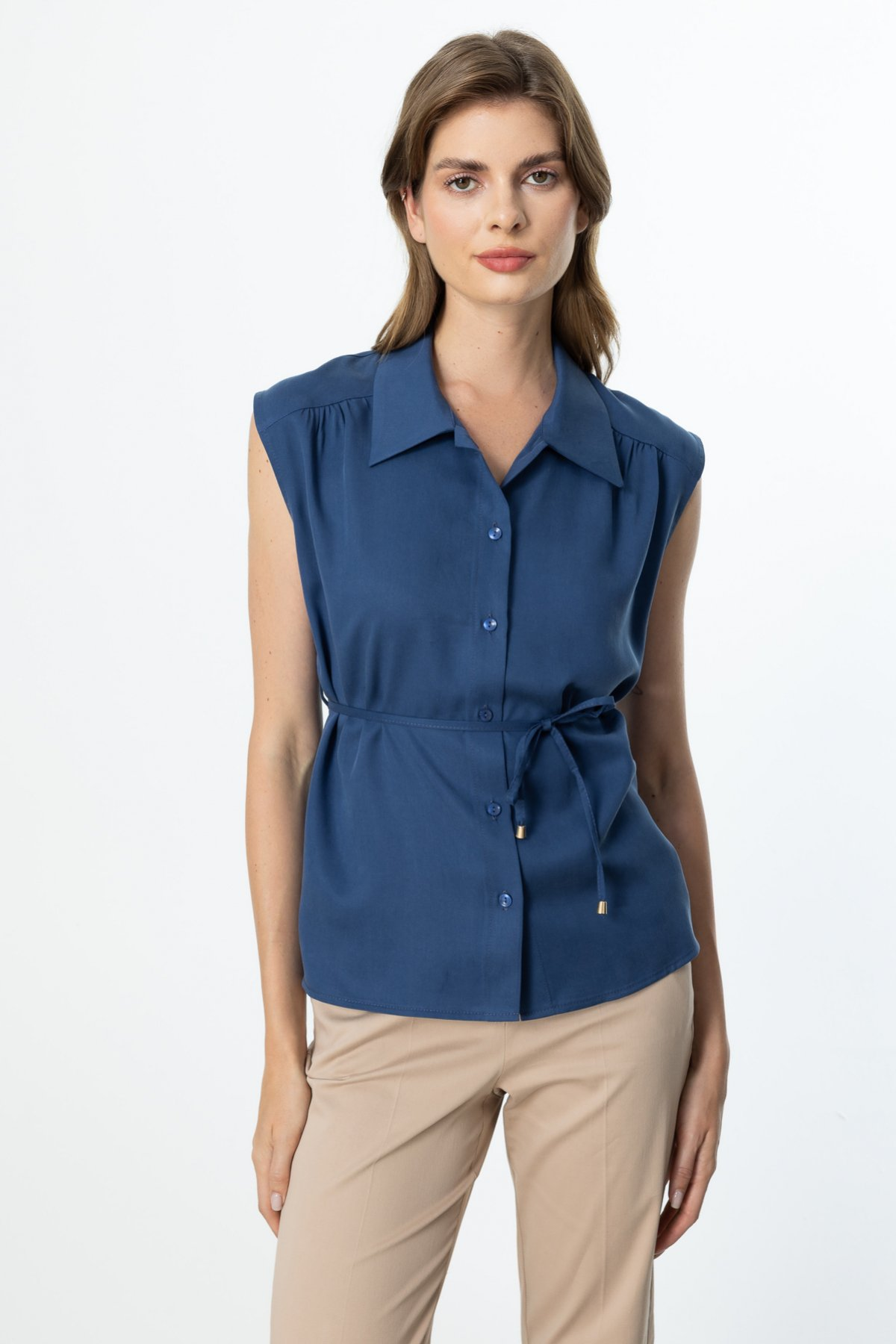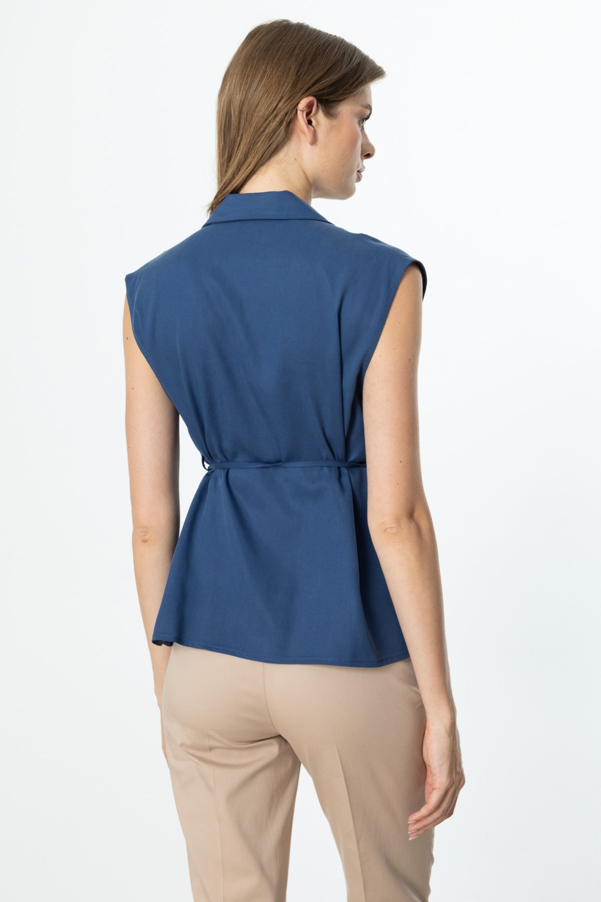 On Beli İp Bağcıklı Kolsuz Gömlek