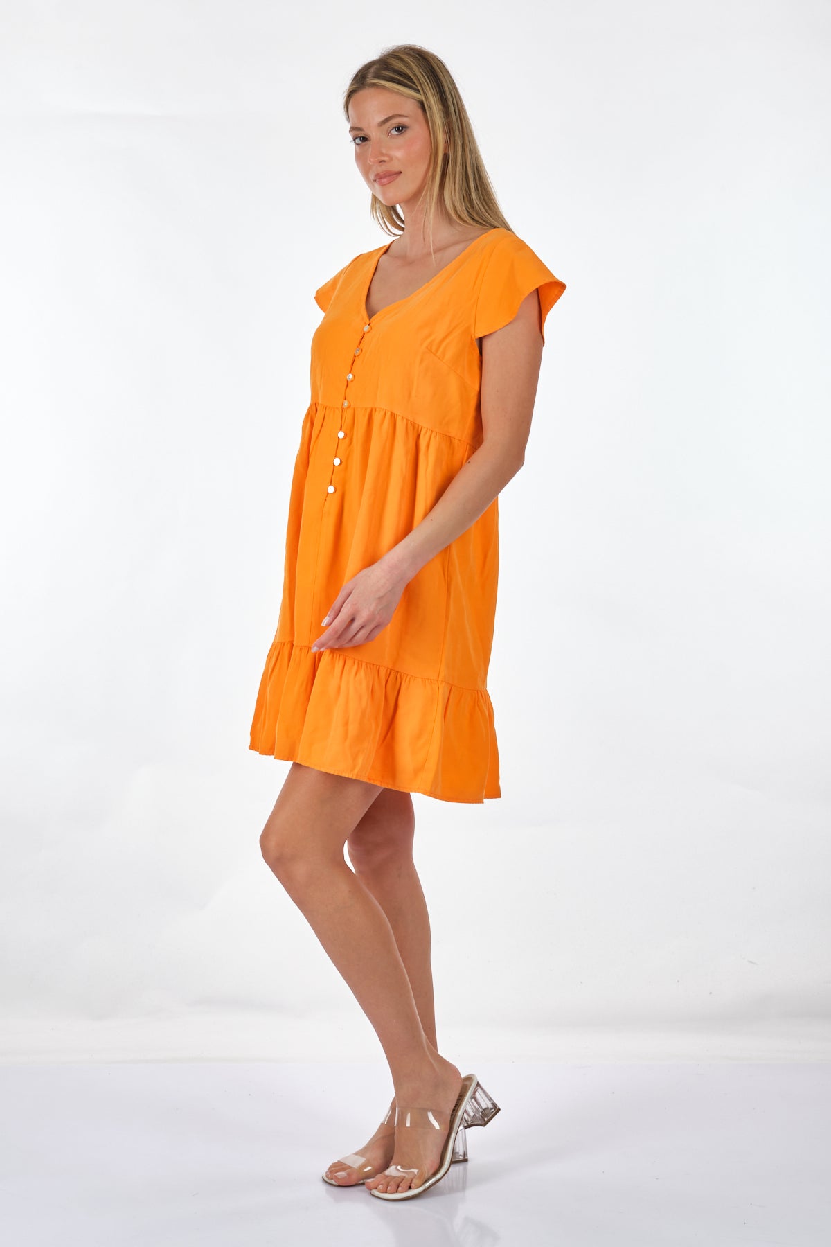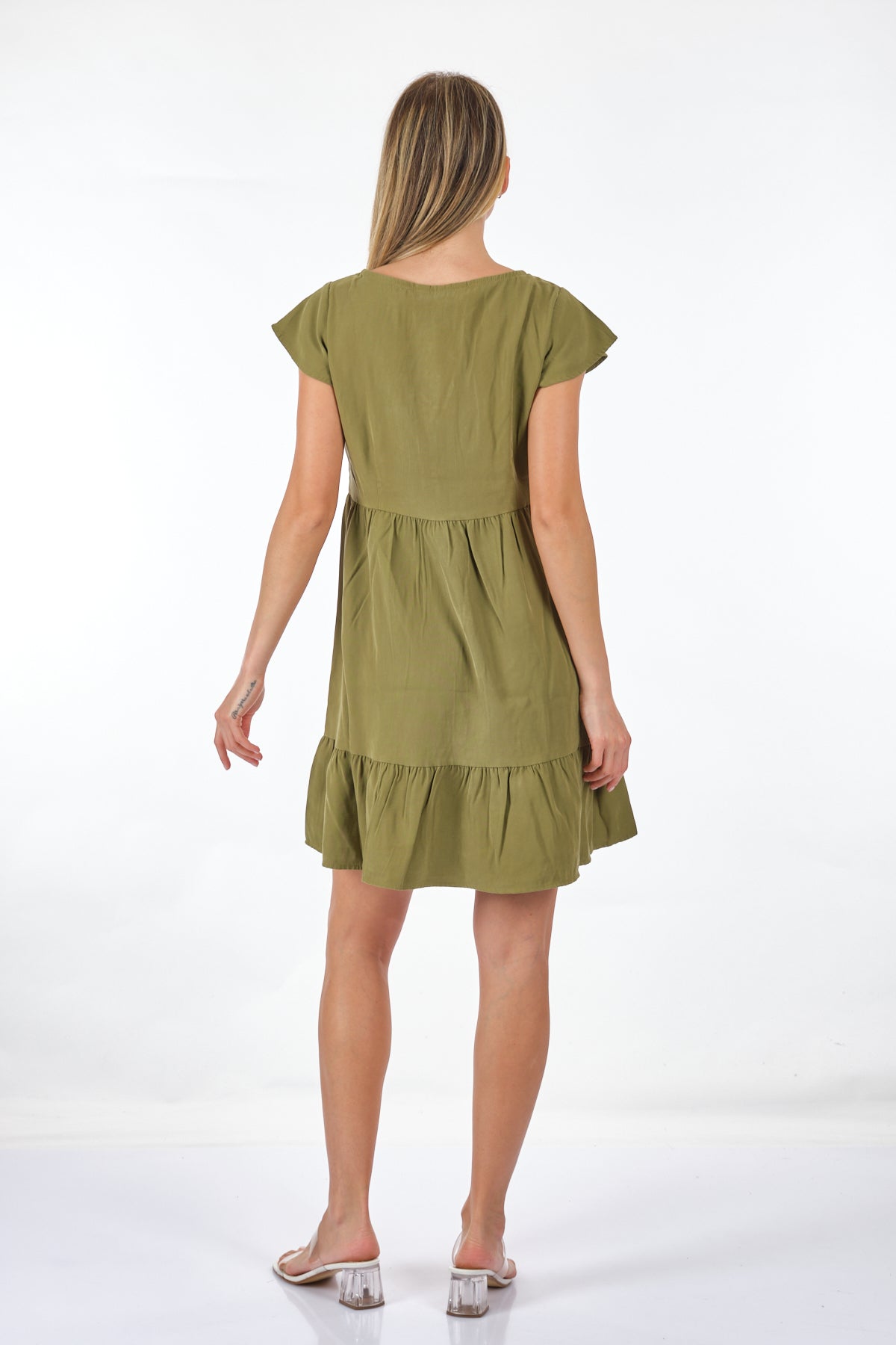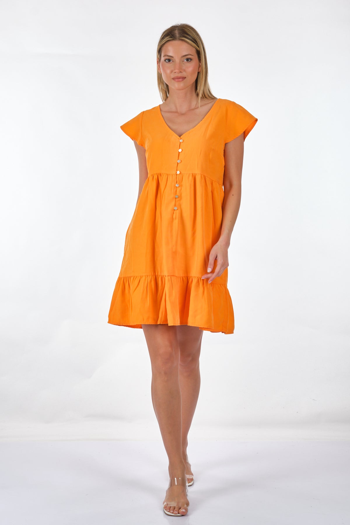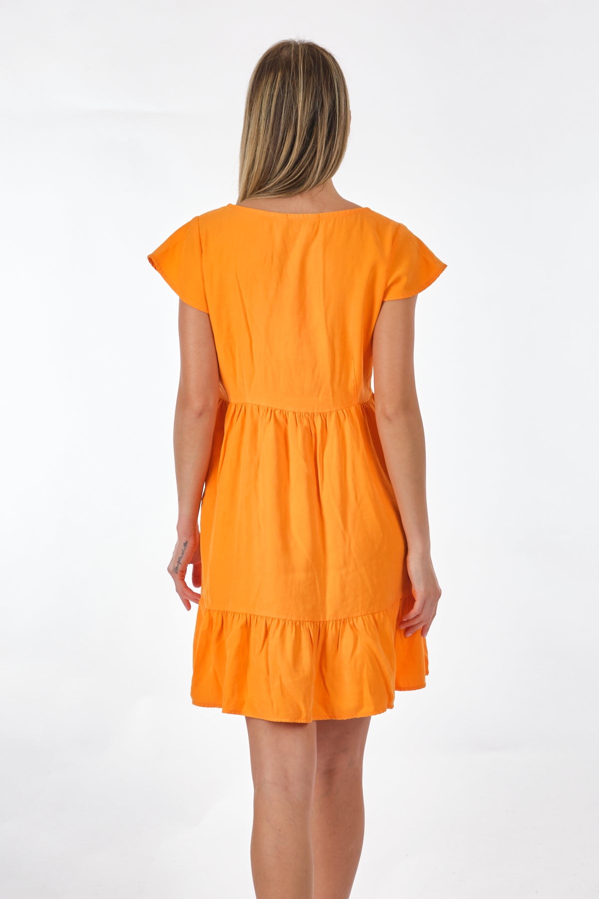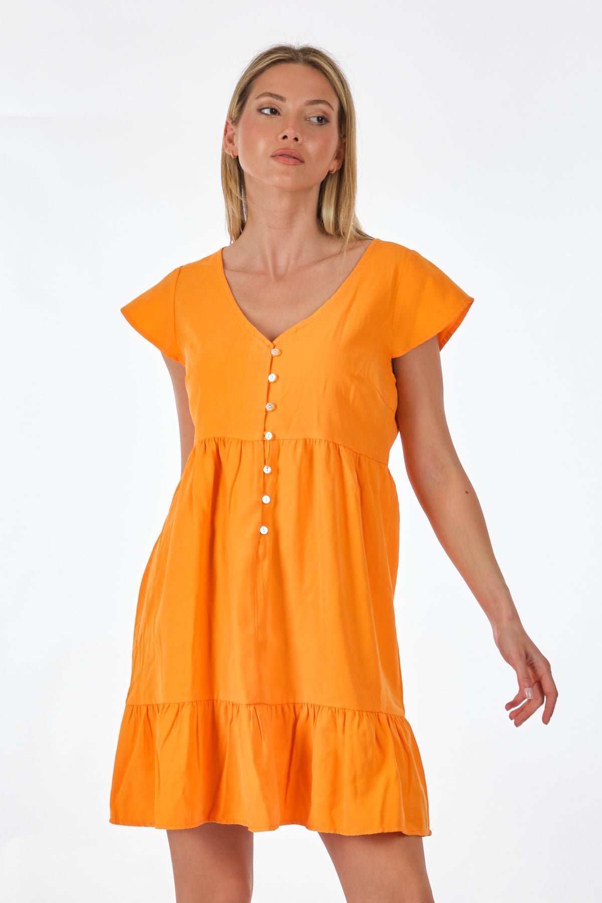 Tüm gün rahat ve kolay kullanım; - Detay Tipi : Günlük elbise; - Boyun : V-Yaka; - Kol : Kısa Kollu; - Uzunluk/Boyut : Diz üstü; - Ekstra ayrıntılar : Fırfırlı süsleme; - Kalıp : Rahat Kalıp; Bileşim: %88 Viskon LENZING™ECOVERO™, %12 Polyester; Bu ürün, sürdürülebilir şekilde yönetilen ormanlardan elde edilen ve çevresel etkiyi azaltacak şekilde üretilen odun hamuru kullanılarak LENZING™ ECOVERO™ markalı viskoz elyaflardan yapılmıştır;