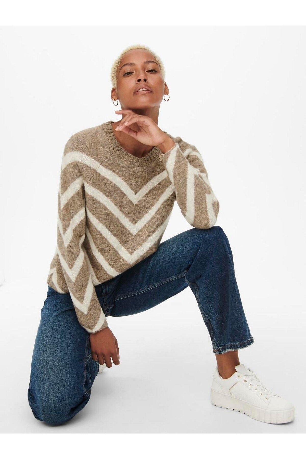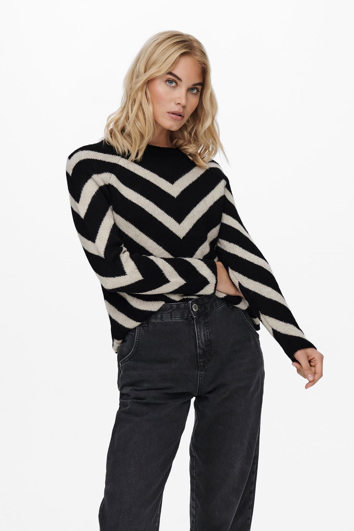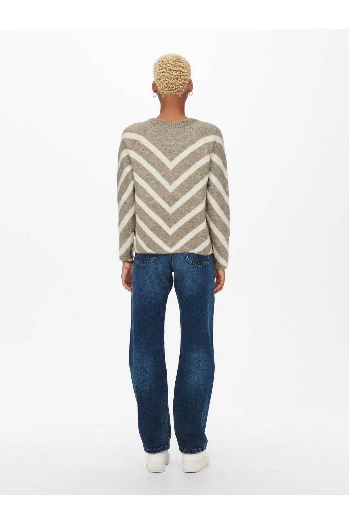 - Kontrast desenli örgü kazak; - Yuvarlak boyun; - Nervürlü kenarlar; - Uzunluk: M bedende 59 cm;...