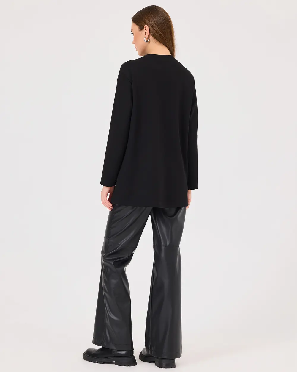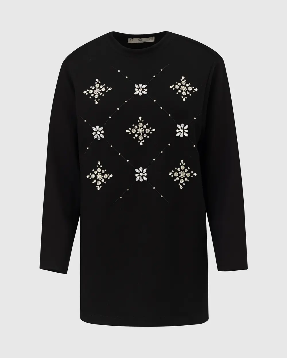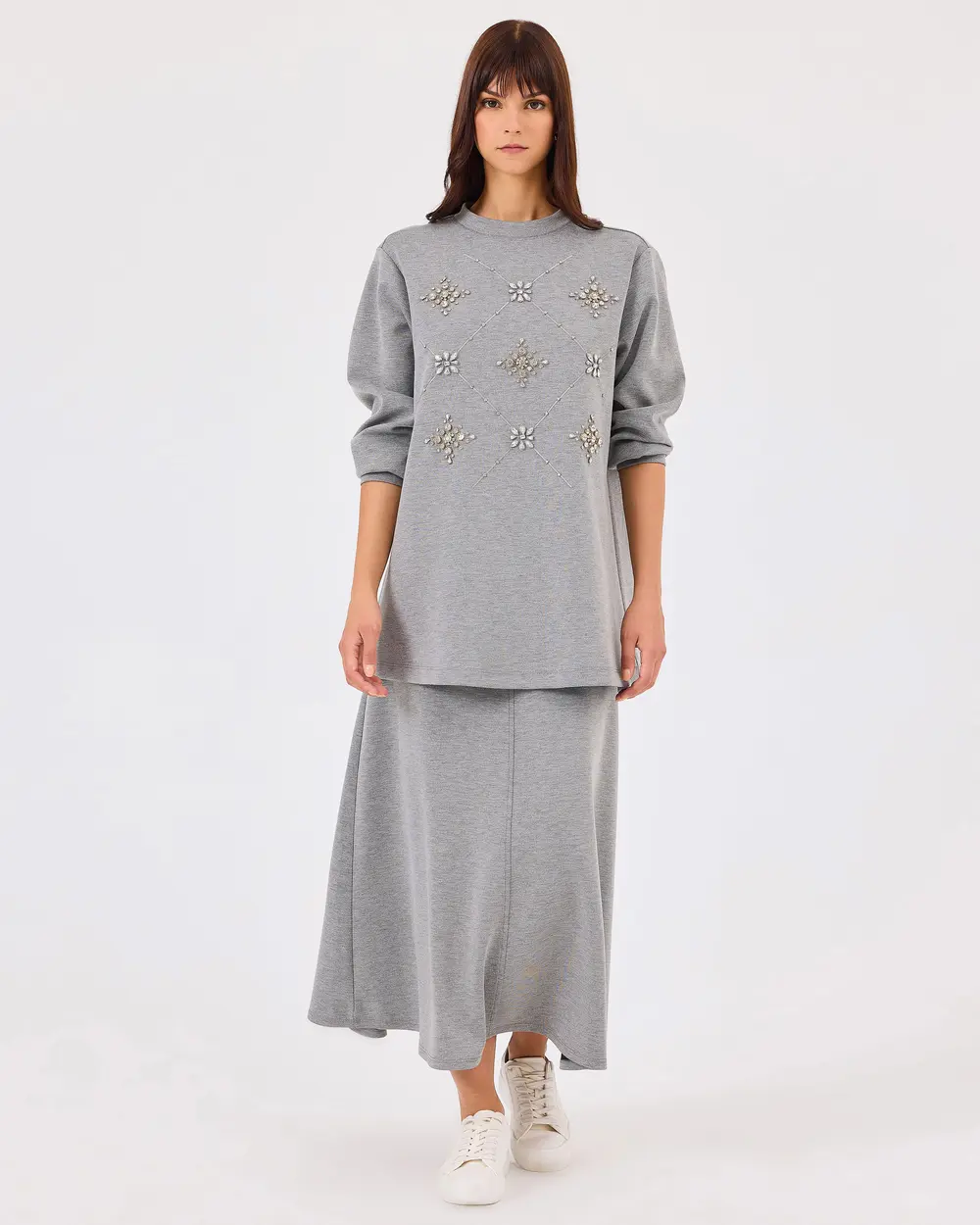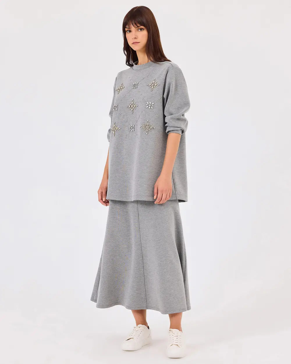Yuvarlak Yaka Taşlı Sweatshirt, zarif taş detaylarıyla şıklık katarken, aynı kumaştan üretilmiş etek ile mükemmel bir kombin oluşturur.