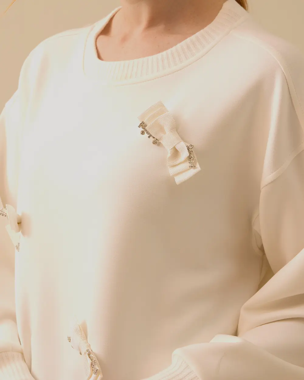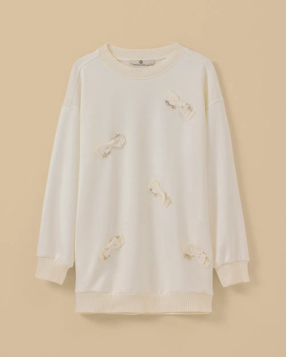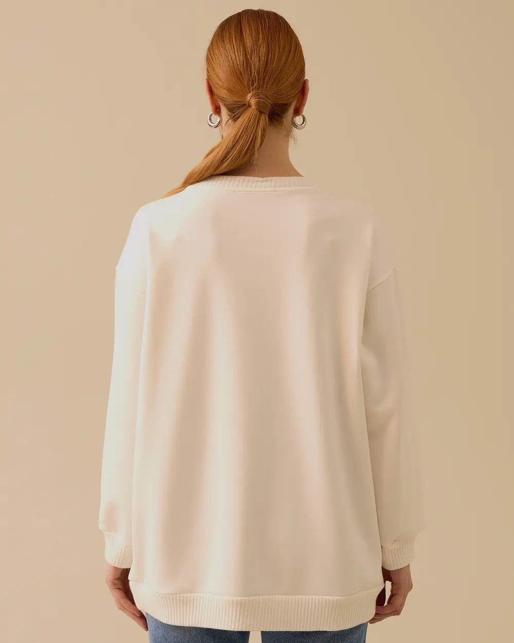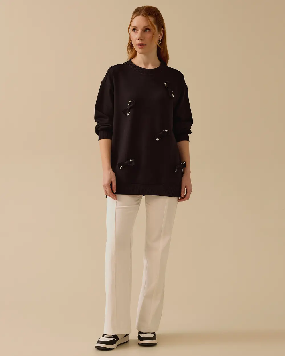 Yuvarlak Yaka Taş Detaylı Sweatshirt, yuvarlak yaka tasarımı ve dikkat çeken taş detaylarıyla günlük stilinize modern bir dokunuş kazandırır.
