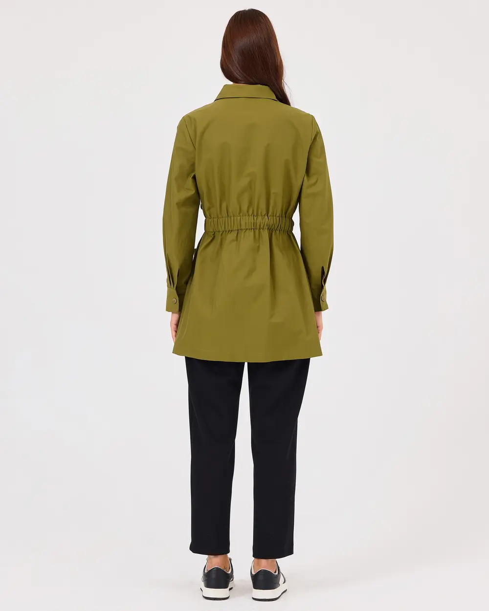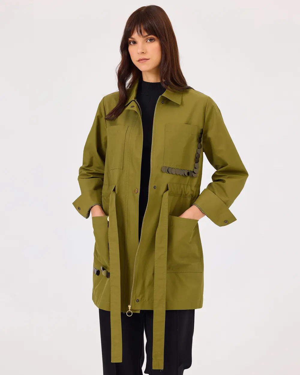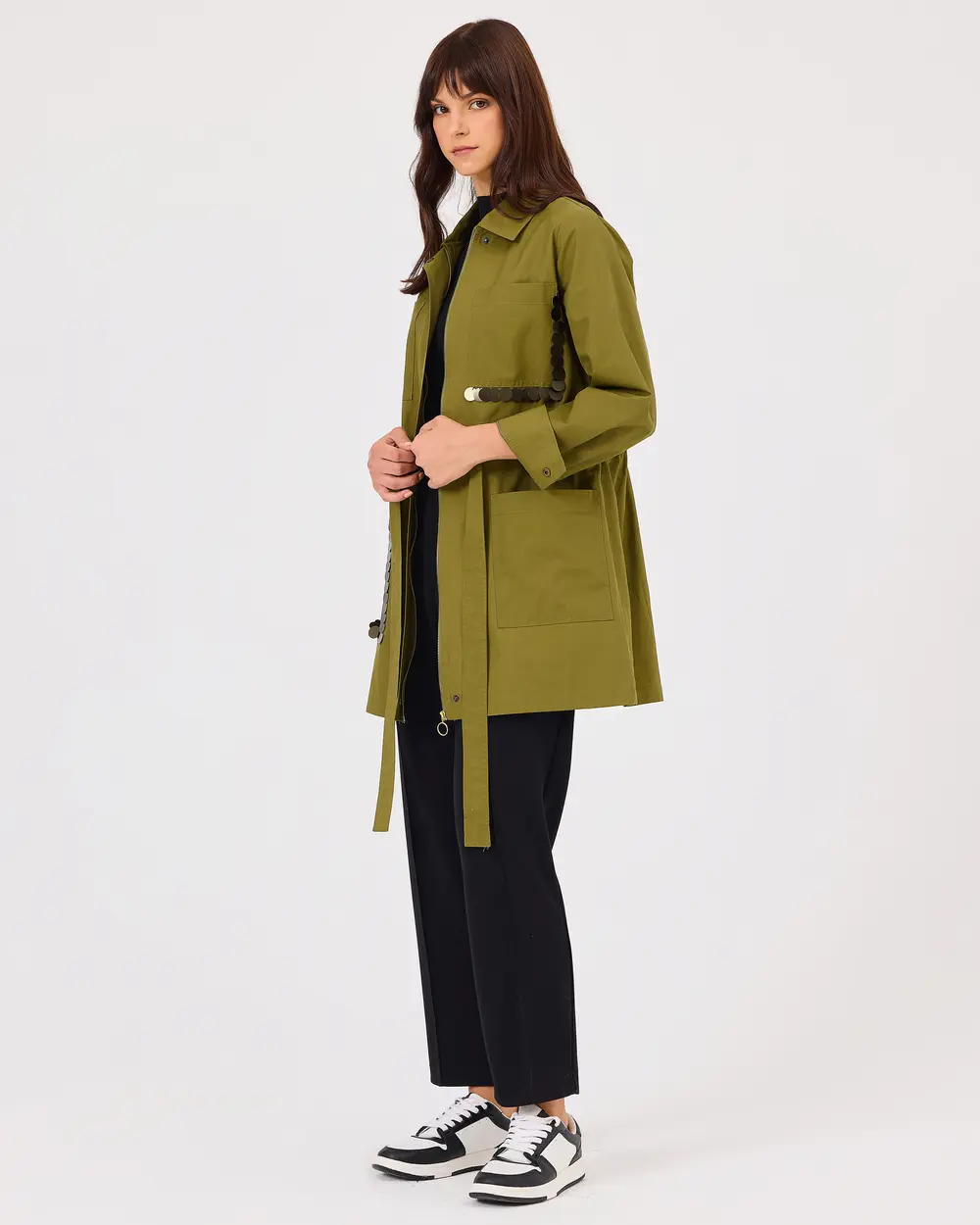Belden Bağlamalı Pul Detaylı Fermuarlı Trençkot, cepli ve çıtçıt düğmeli tasarımıyla pratik bir kullanım sunarken, belden bağlama ve pul detaylarıyla şıklığı tamamlar.