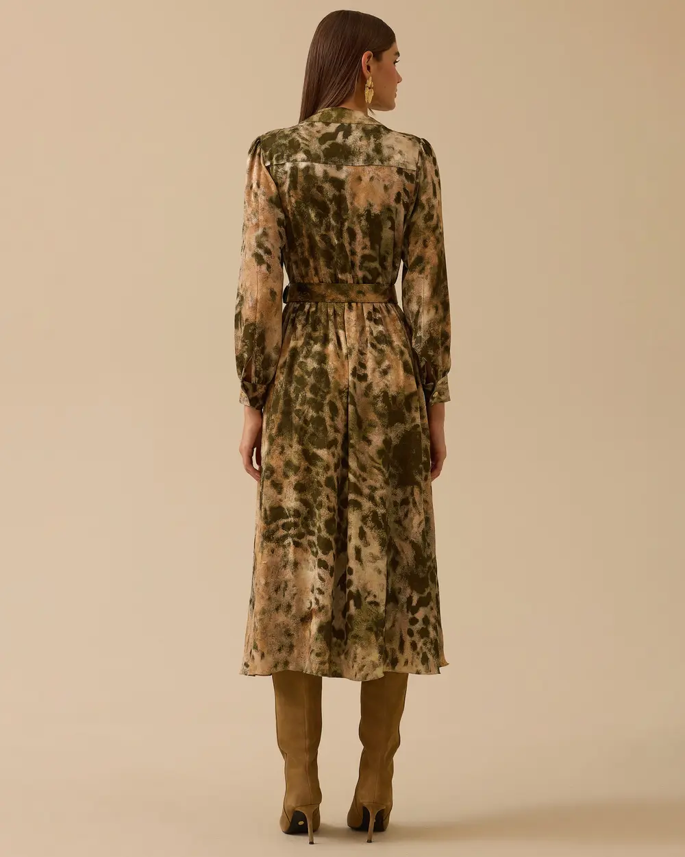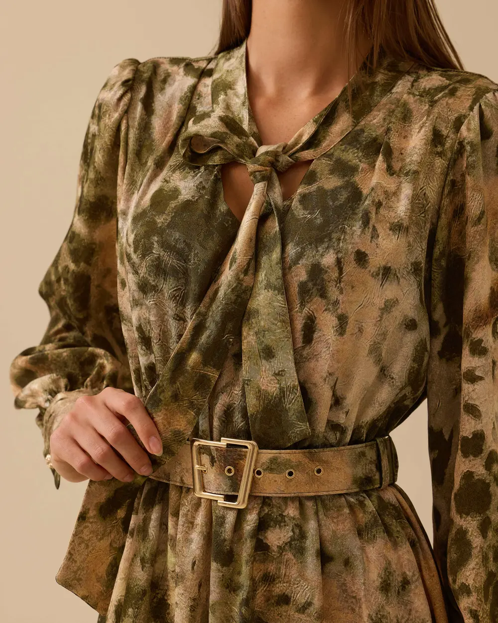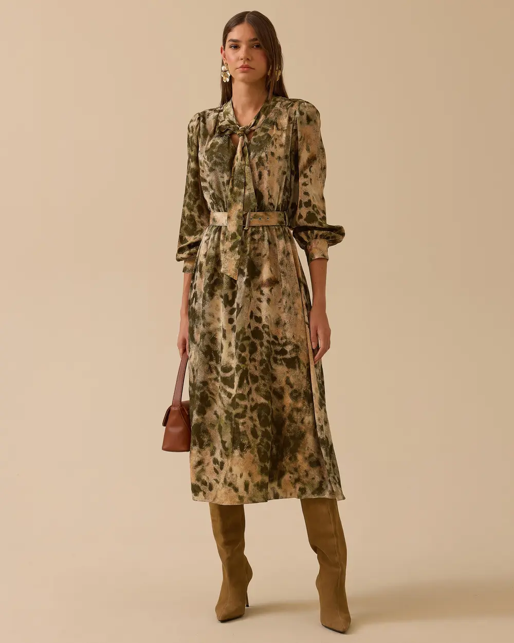 Fular Yakalı Desenli Kemer Detaylı Elbise, modern ve zarif tasarımıyla şıklığınızı vurgular.