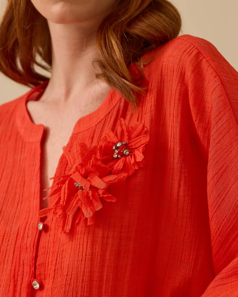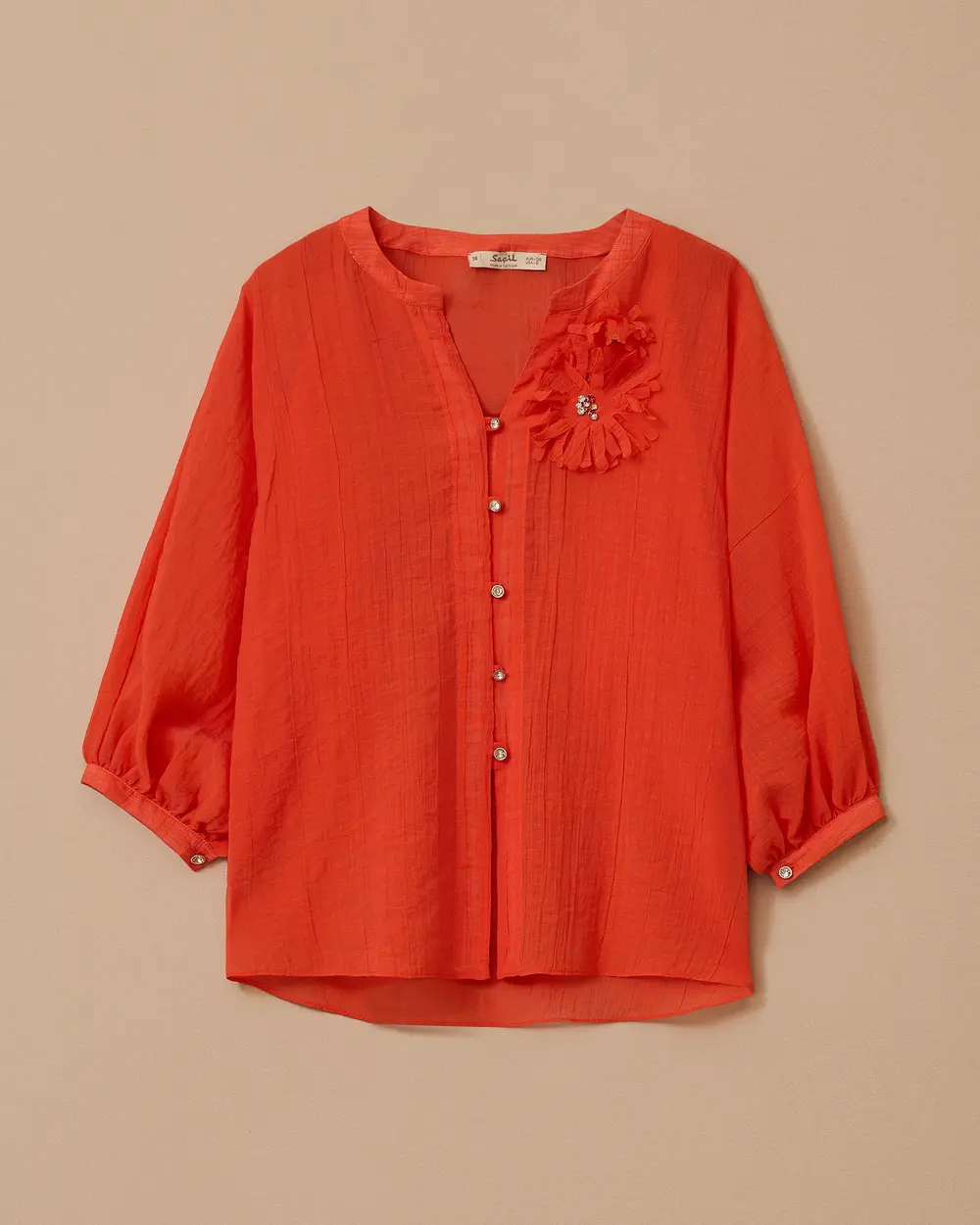 Çiçek Aksesuarlı Balon Kollu Düğmeli Gömlek, hareketli kol tasarımı ve çiçek detayıyla şık ve modern bir stil sunar.