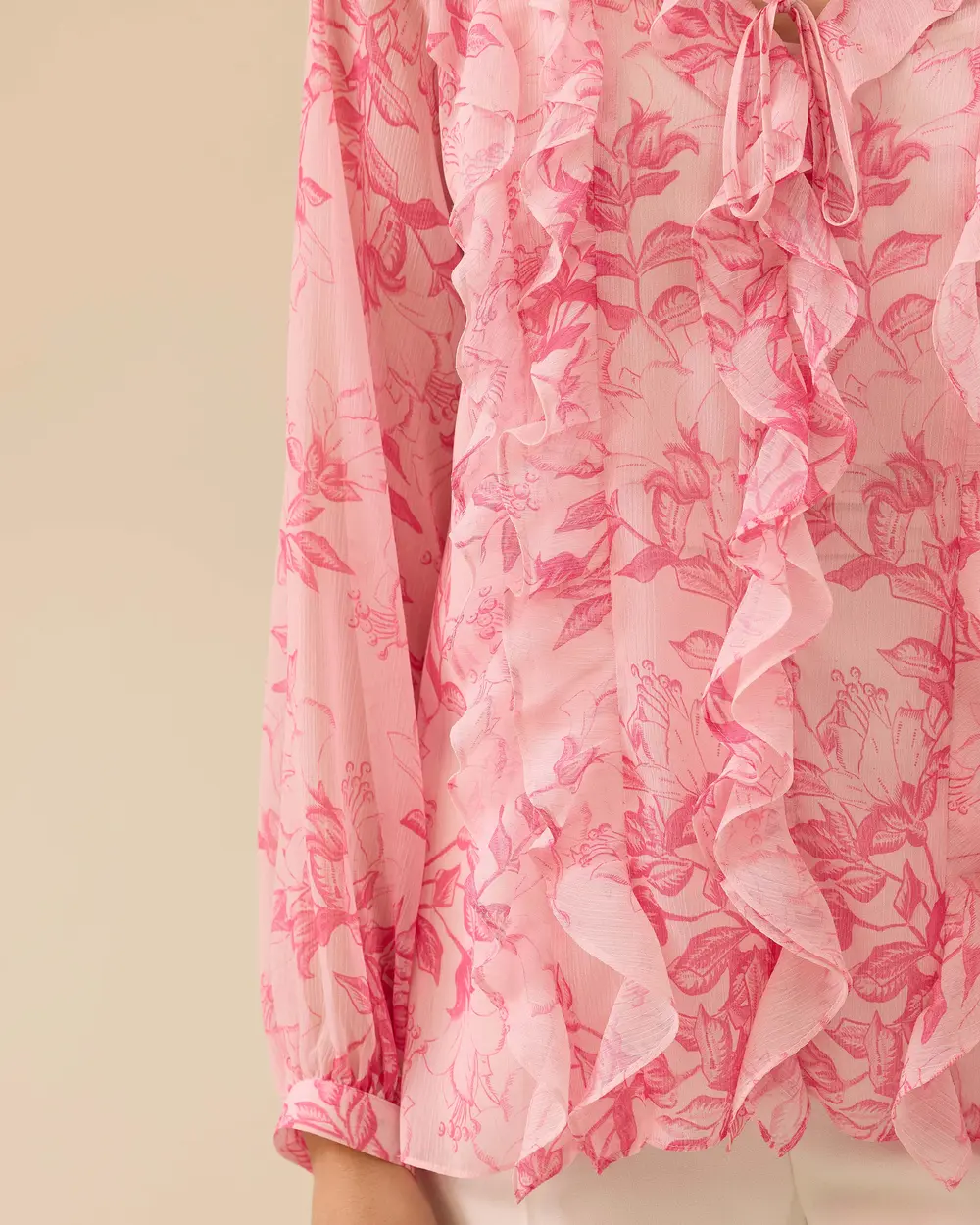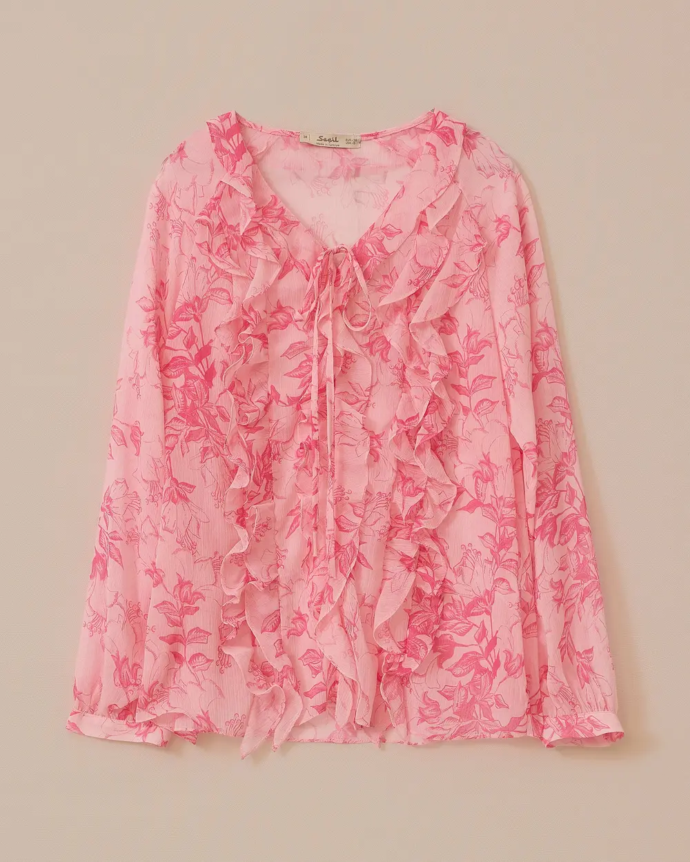 Çiçek Desenli Fırfır Detaylı Şifon Bluz, hafif ve zarif kumaşıyla konfor sunar, fırfır detaylarıyla feminen ve şık bir görünüm sağlar.