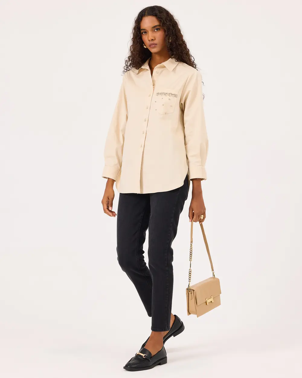 Taşlı Cep Detaylı Düğmeli Gömlek, şık ve dikkat çekici tasarımıyla her ortamda öne çıkmanızı sağlar. Göğüs hizasındaki taş detayı, zarif bir dokunuş katarken, farklı kombinler için ideal bir seçimdir.